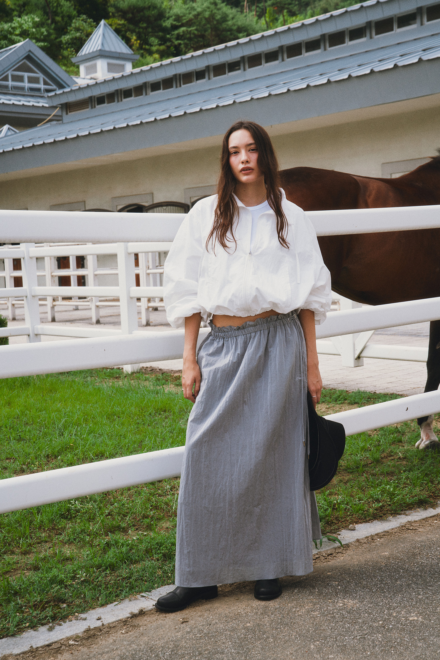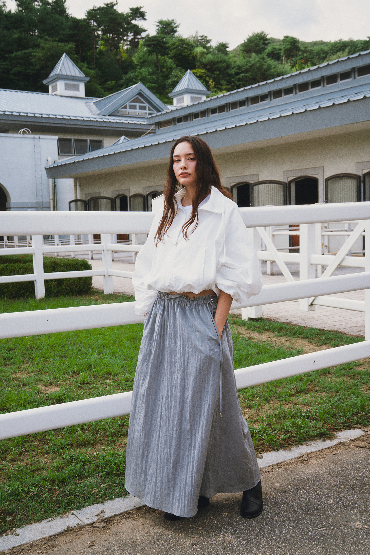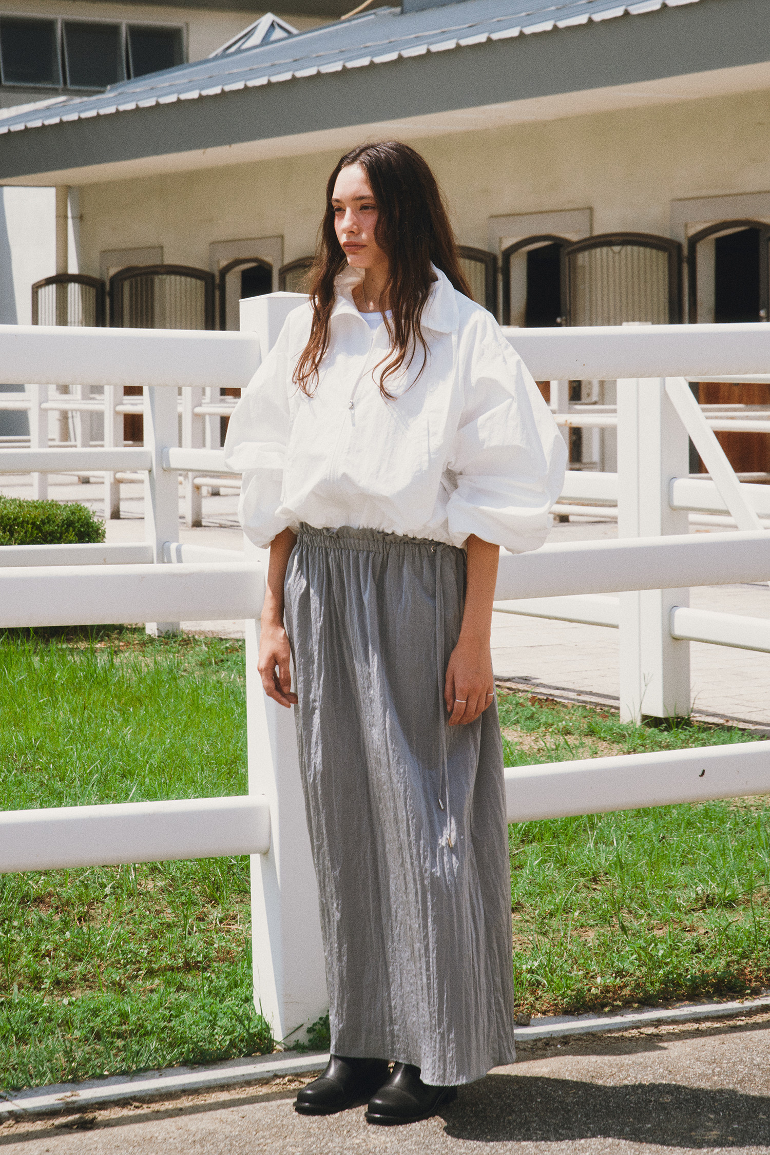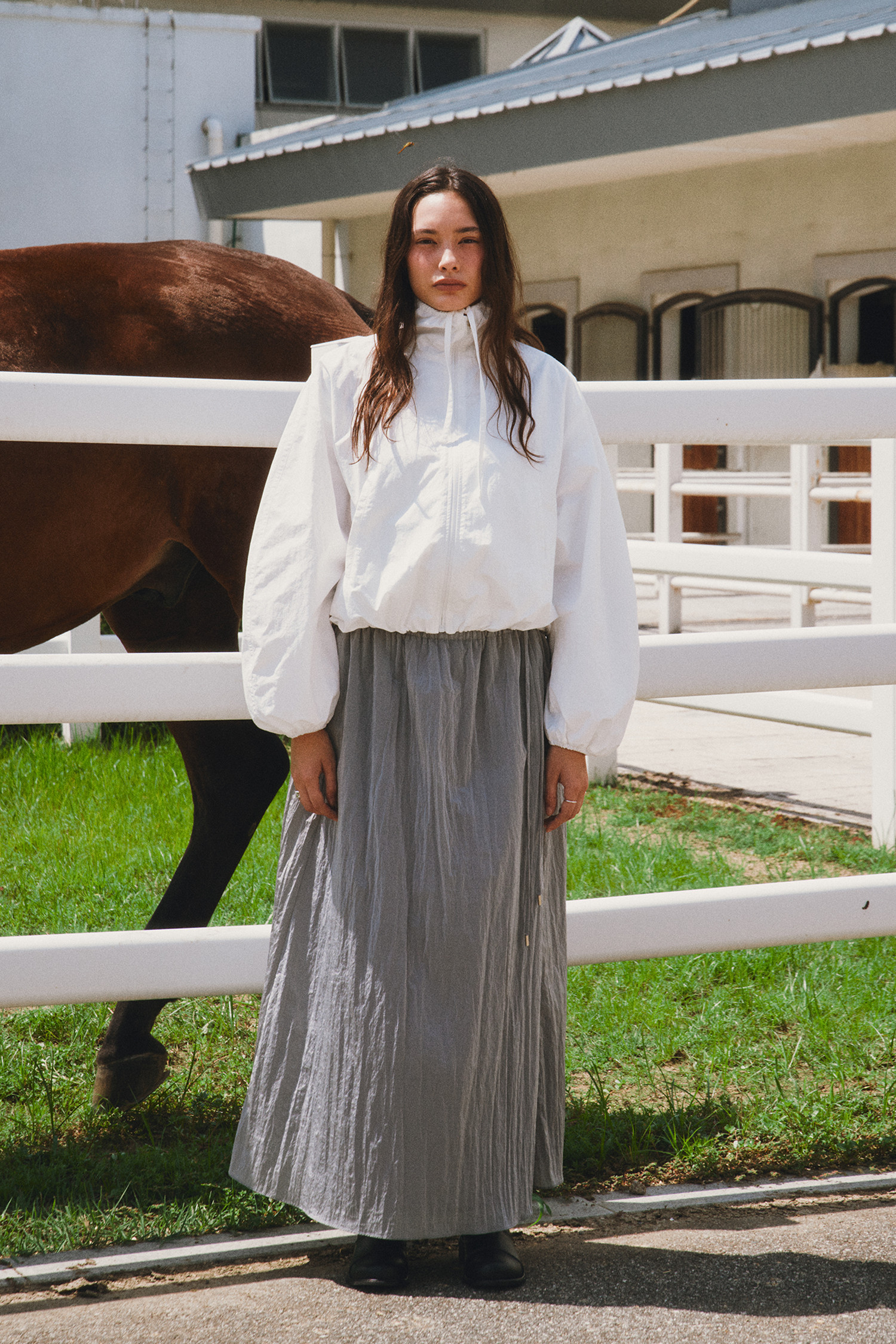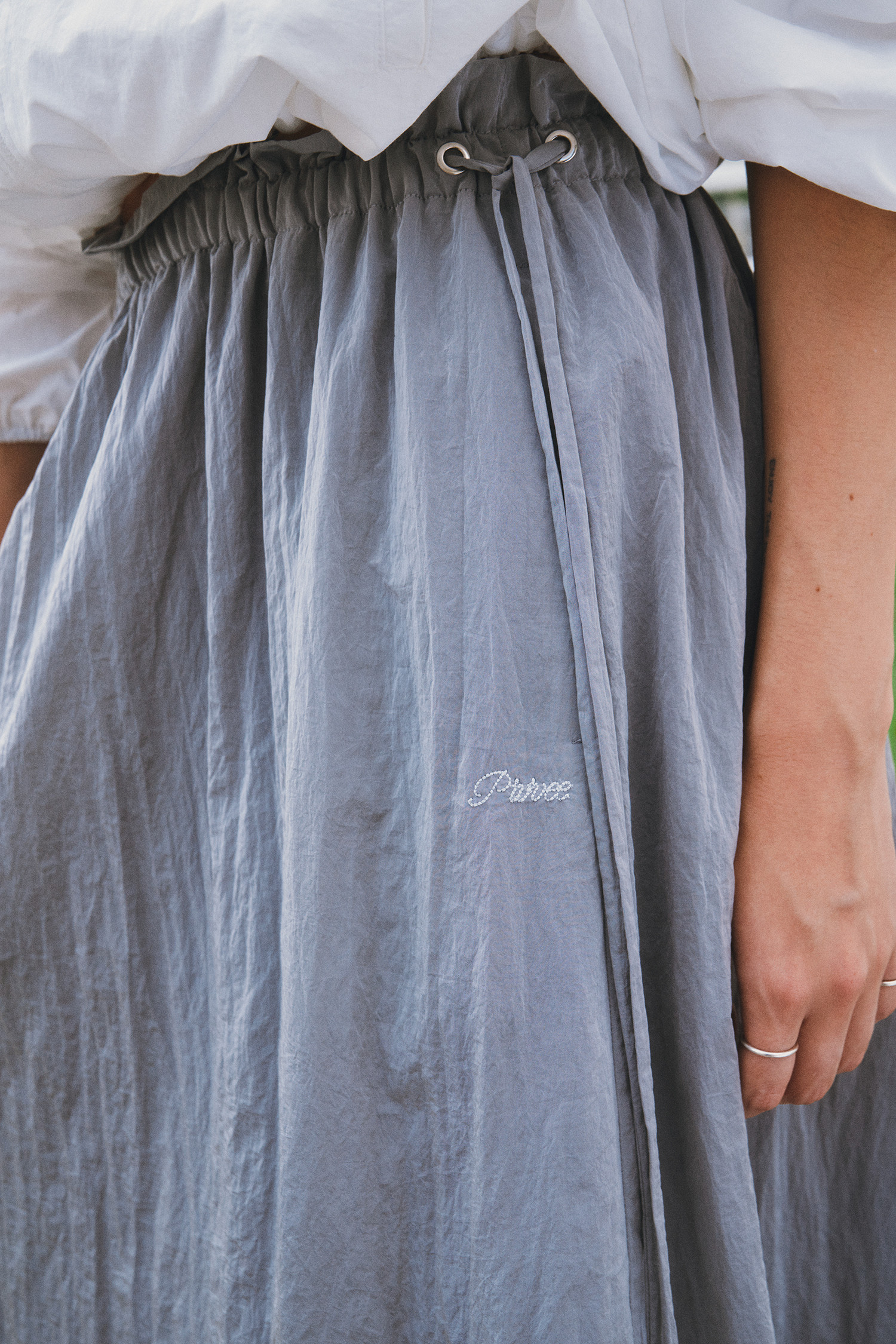 나일론 소재로 바스락거리는 터치감이 매력적인 롱 스커트