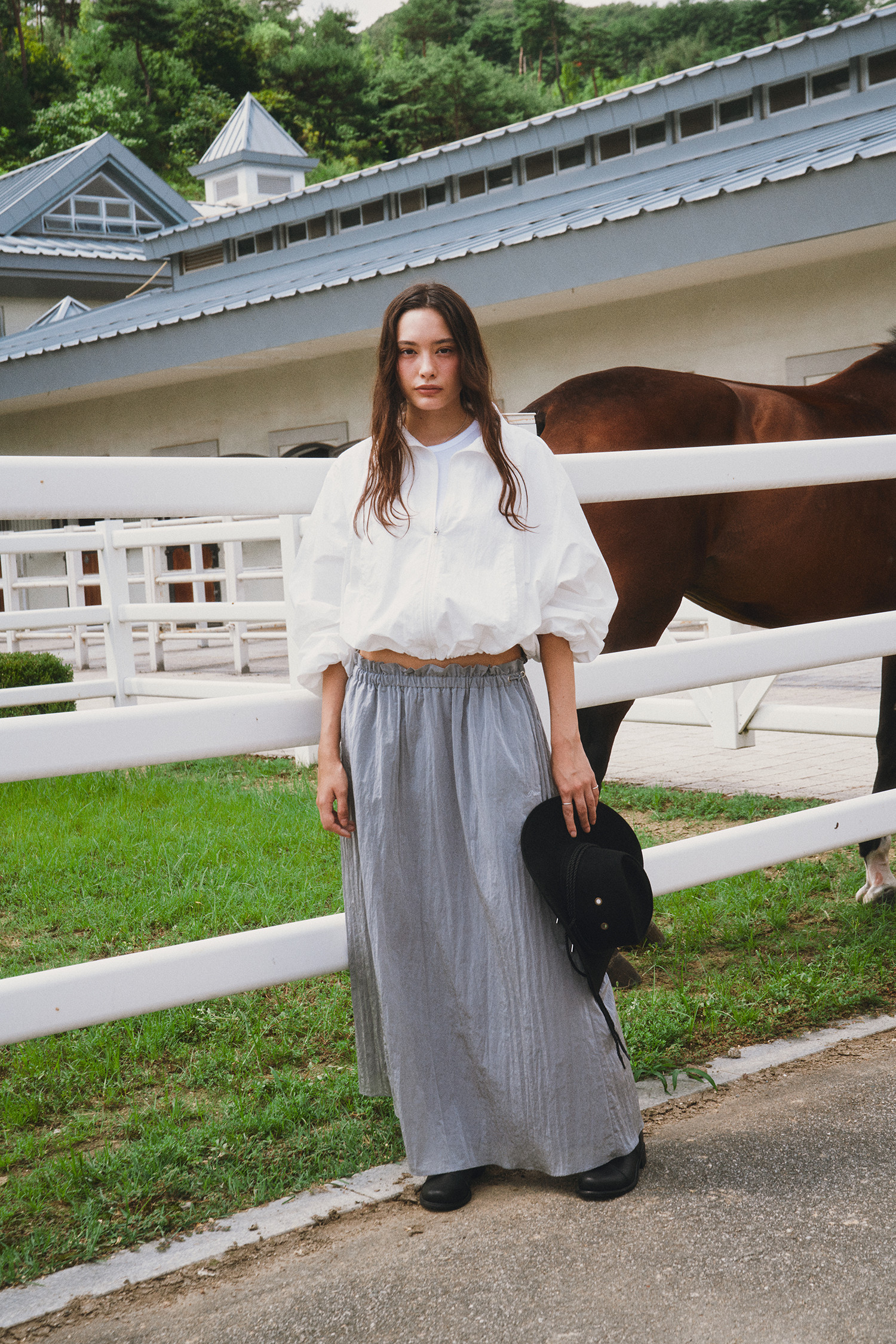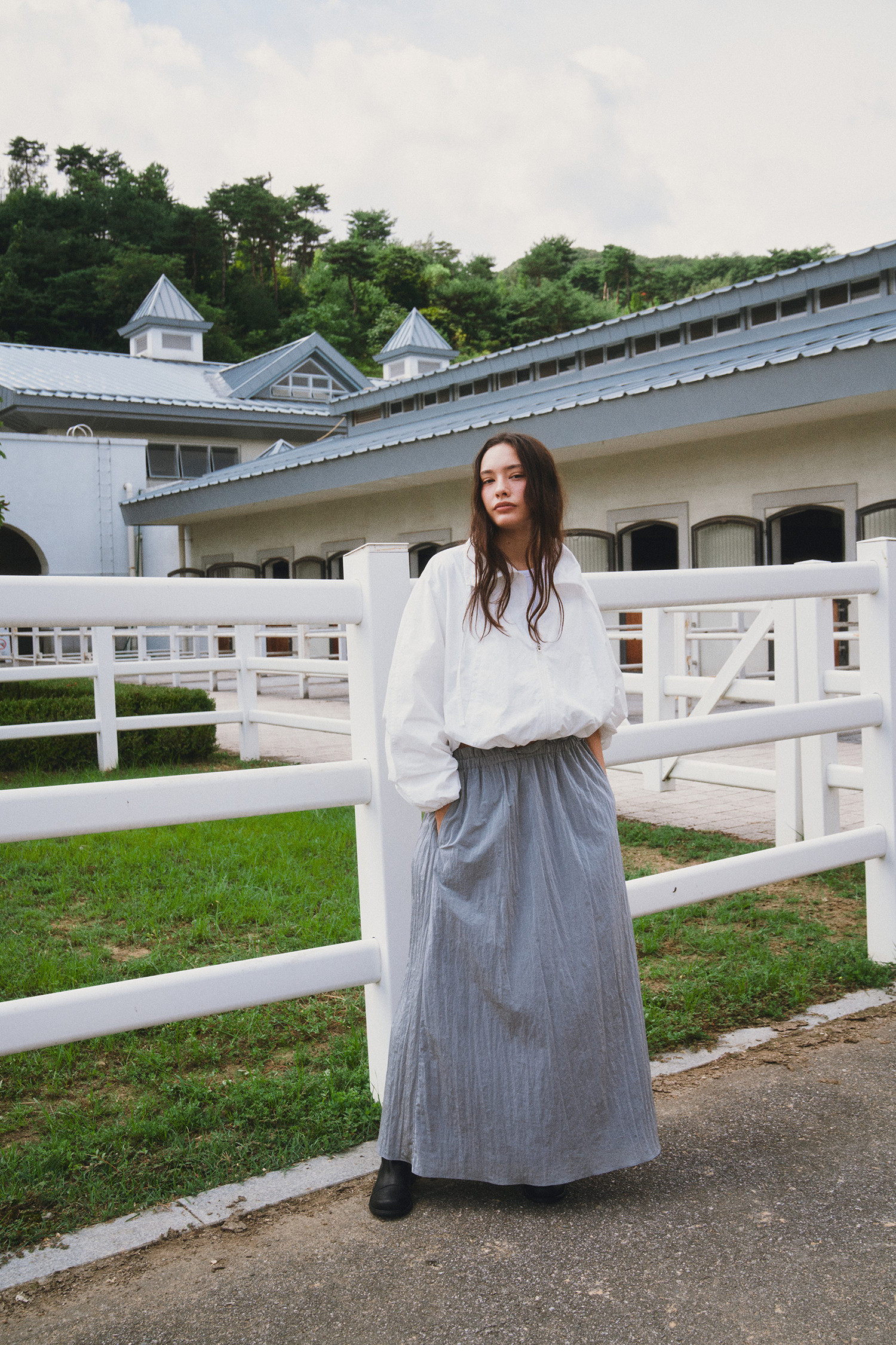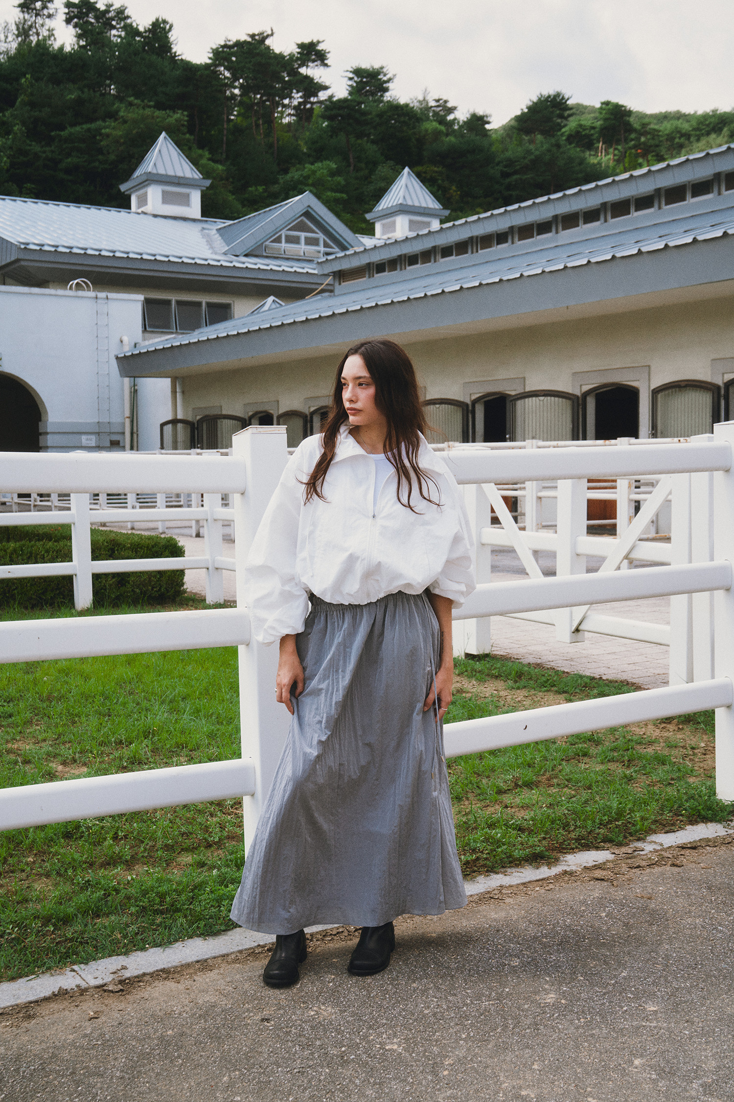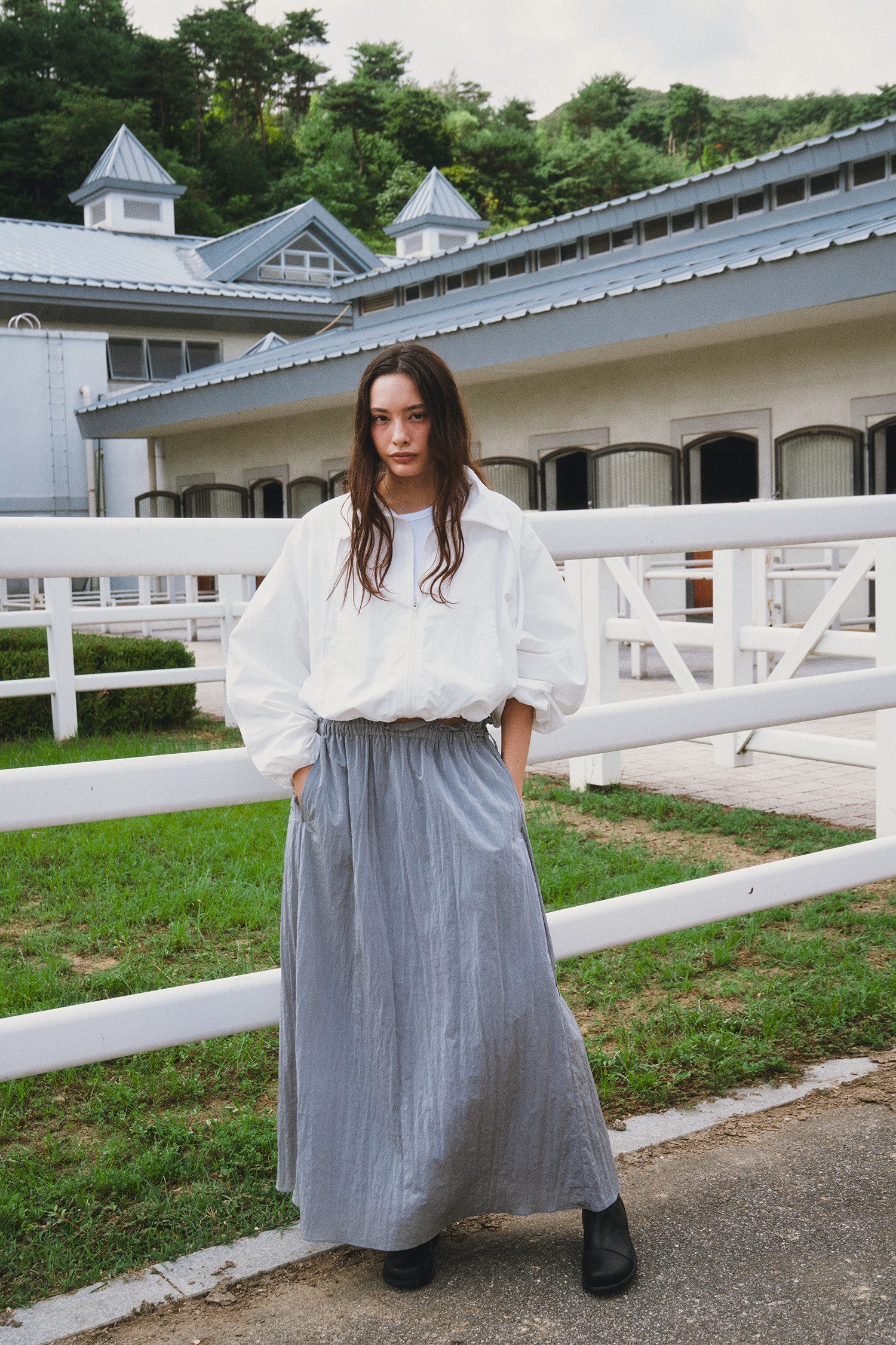 나일론 소재로 바스락거리는 터치감이 매력적인 롱 스커트