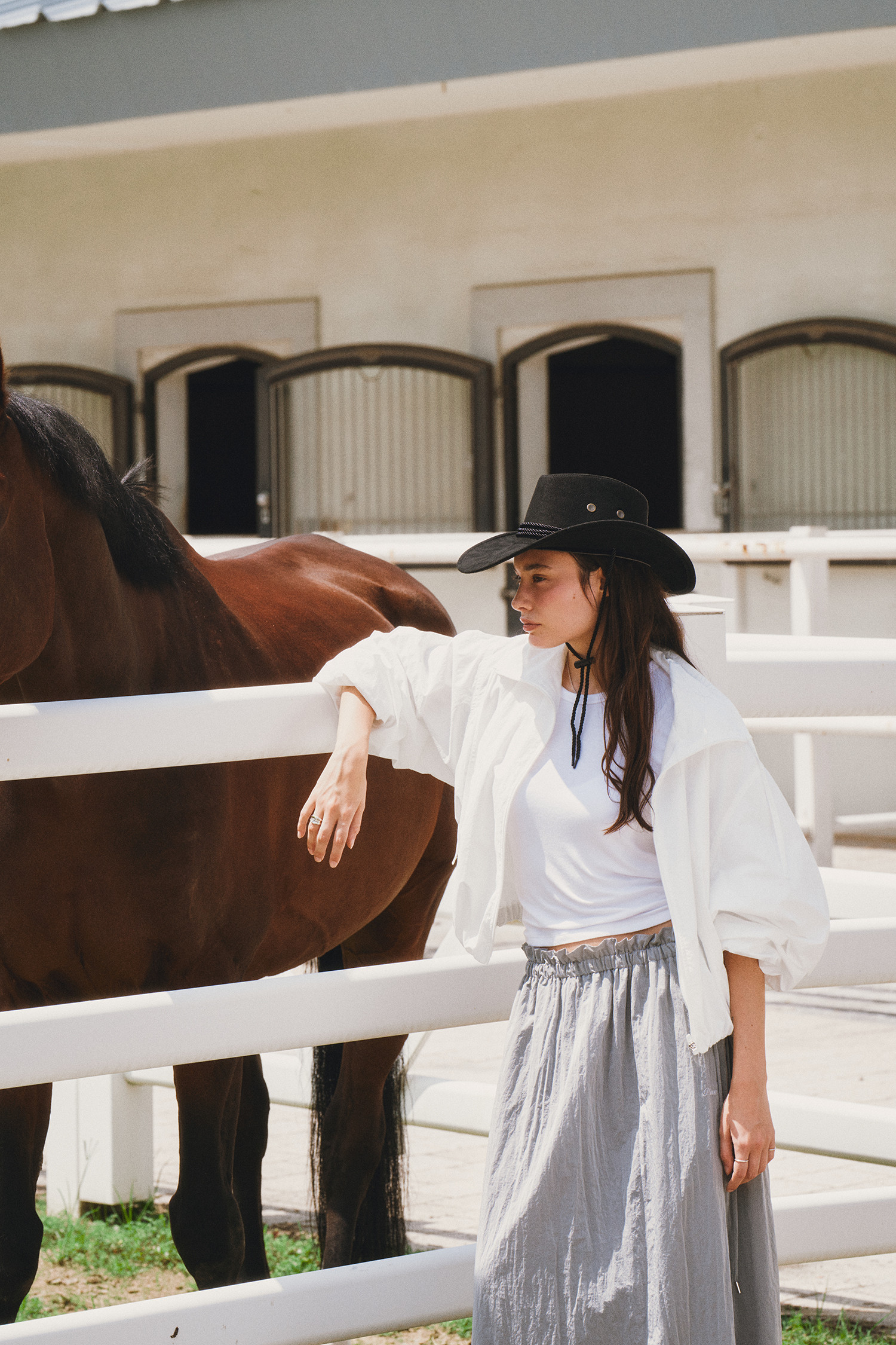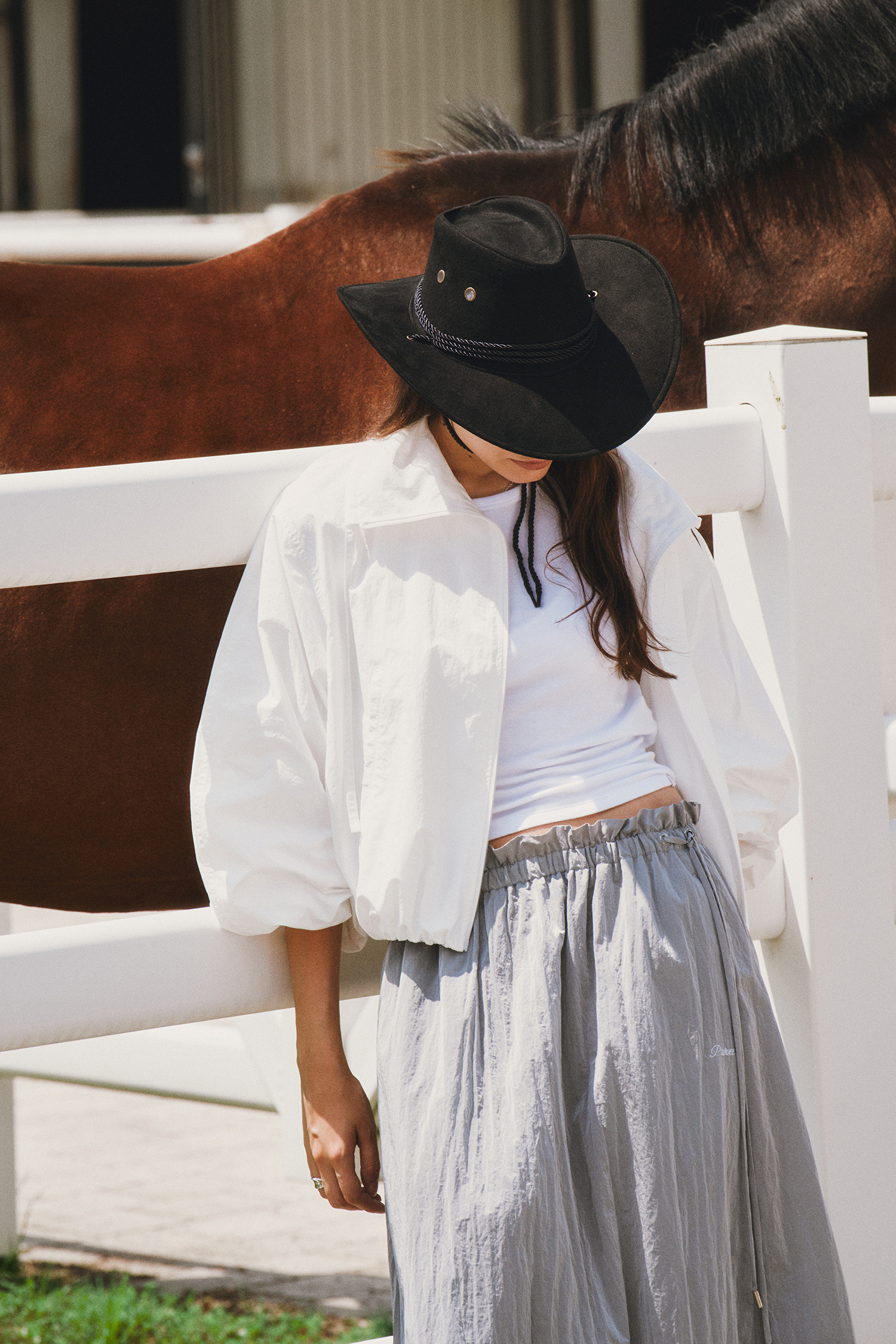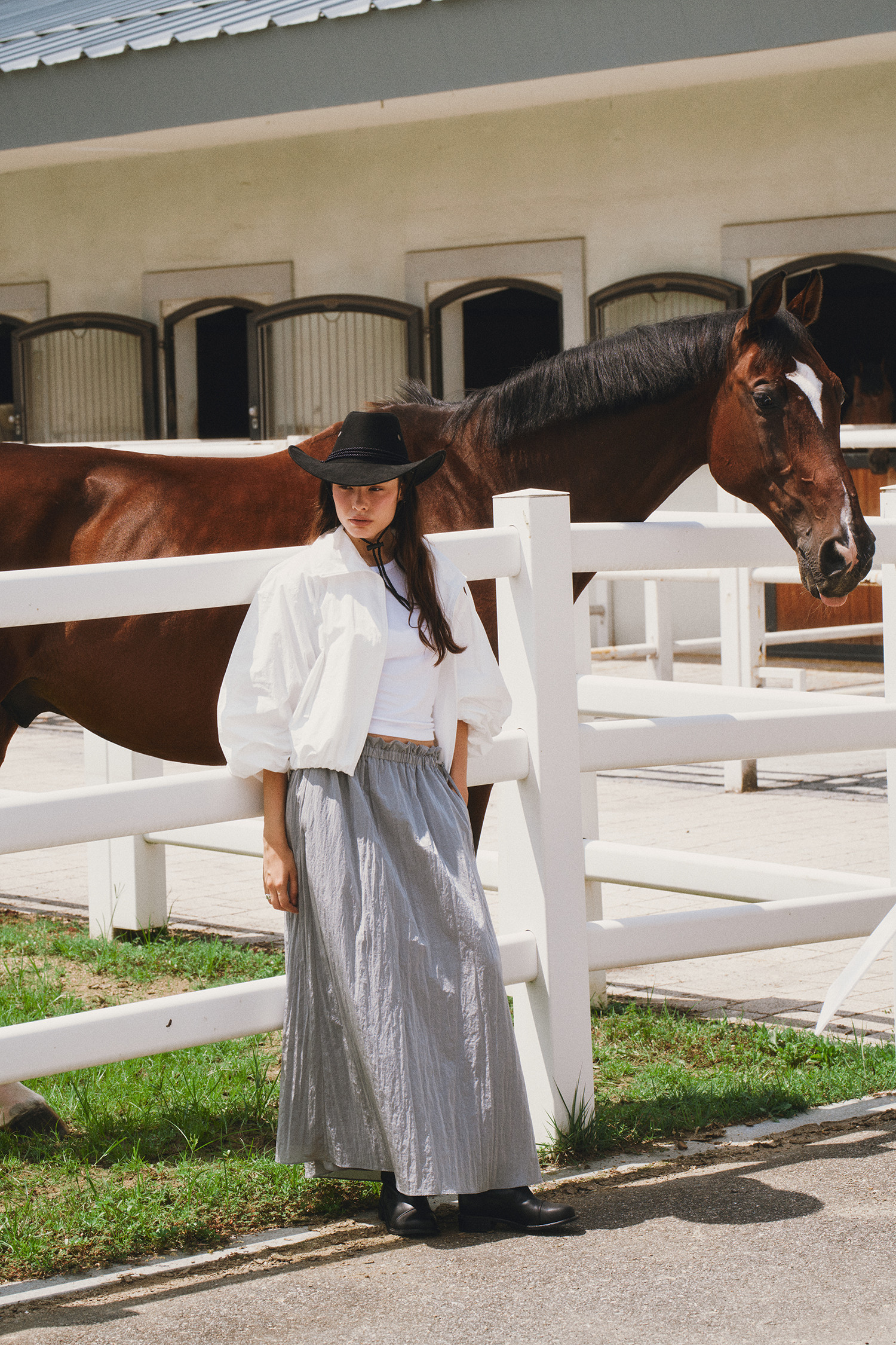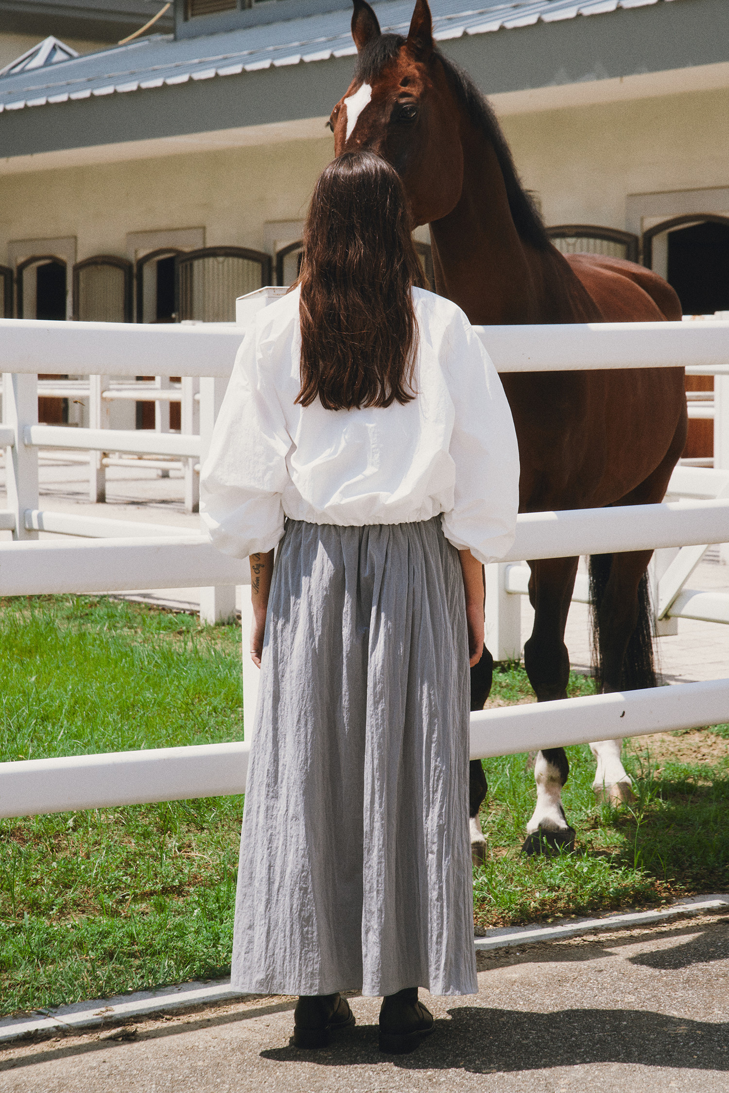 나일론 소재로 바스락거리는 터치감이 매력적인 롱 스커트