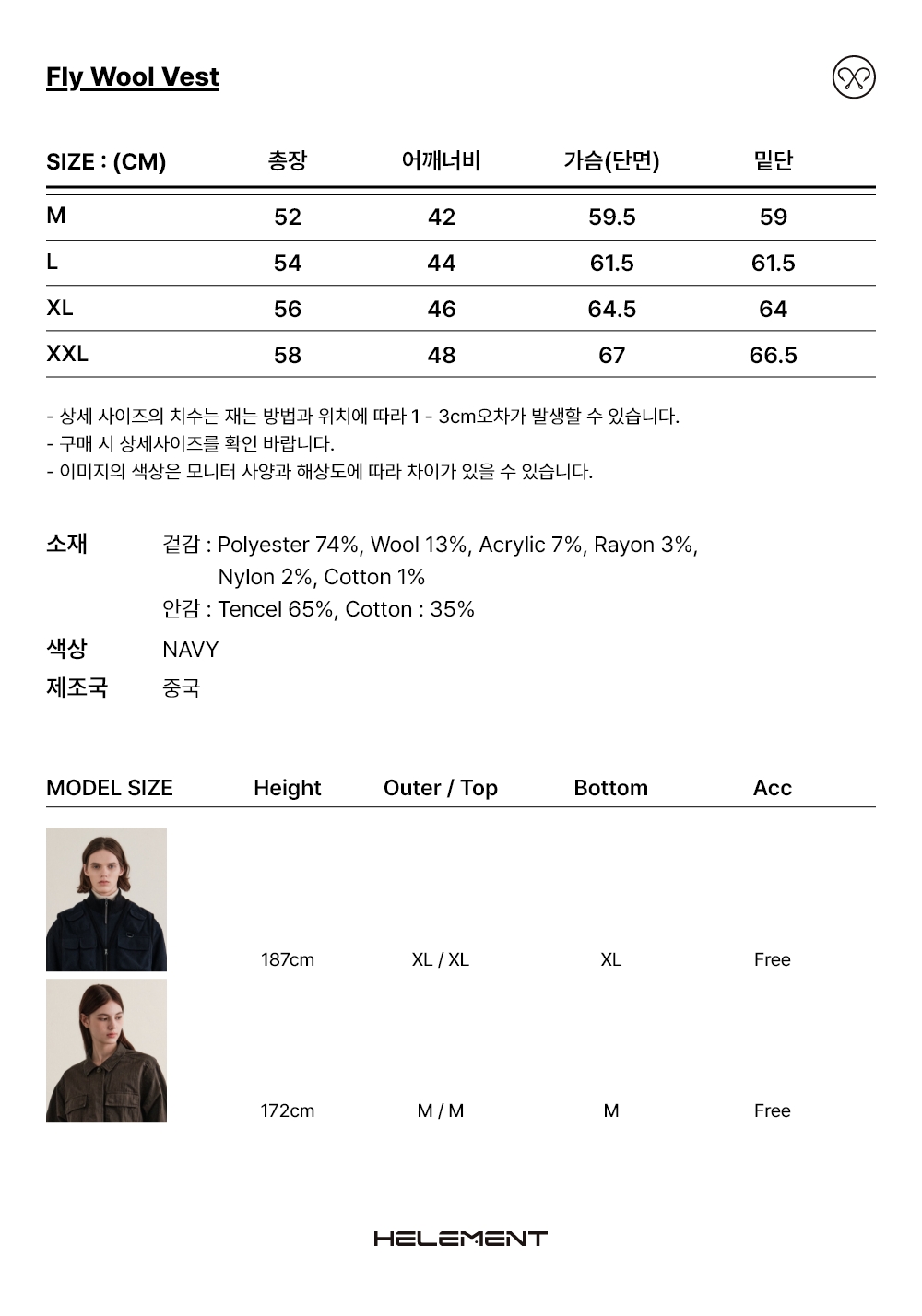 소재 | 겉감 : 폴리에스터 74%, 울 13%, 아크릴 7%, 레이온 3%, 나일론 2%, 면 1% / 안감 : 텐셀 65%, 면 : 35% |