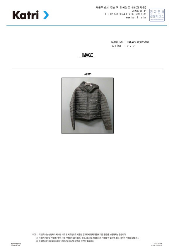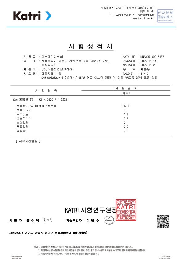 | 소재 | 겉감:폴리에스터:100% 안감:폴리에스터:100% 충전재:오리 솜털:80% 오리 깃털:15% 기타 육모:5% |