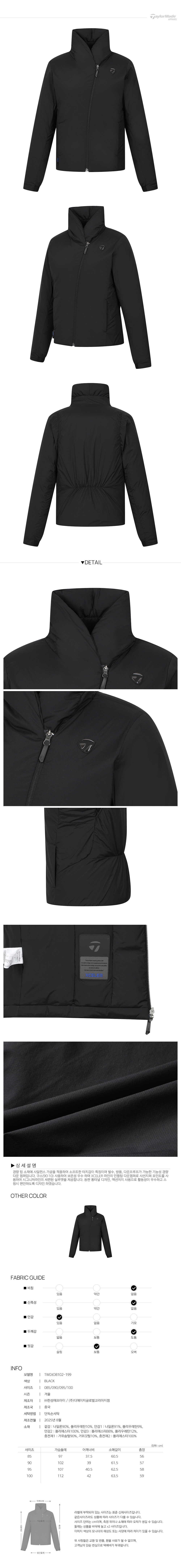 | 소재 | 겉감 : 나일론90%, 폴리우레탄10%, 안감1 : 나일론91%, 폴리우레탄9%, 안감2 : 폴리에스터100%, 안감3 : 폴리에스터88%, 폴리우레탄12%, 충전재1 : 거위솜털90%, 거위깃털10%, 충전재2 : 폴리에스터100% |