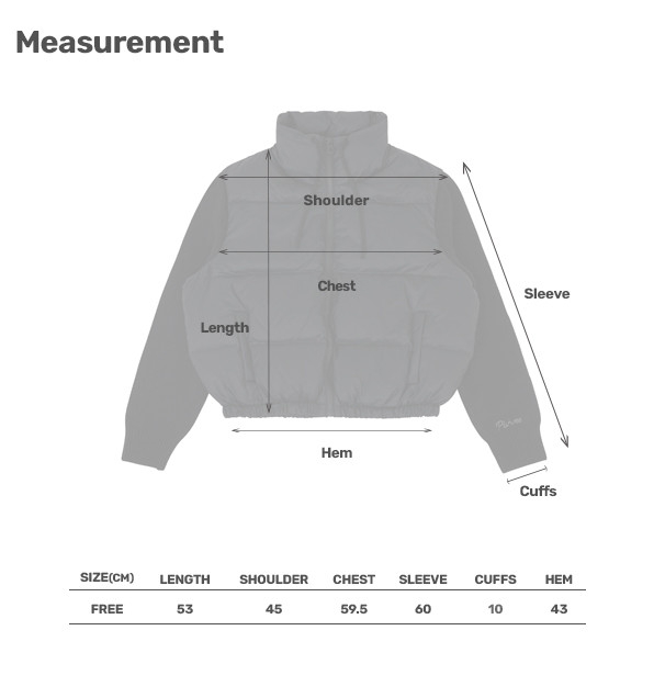 | 치수 | <MEASUREMENT> F LENGTH 53CM SHOULDER 45CM CHEST 59.5CM SLEEVE 60CM CUFFS 10CM HEM 43CM |