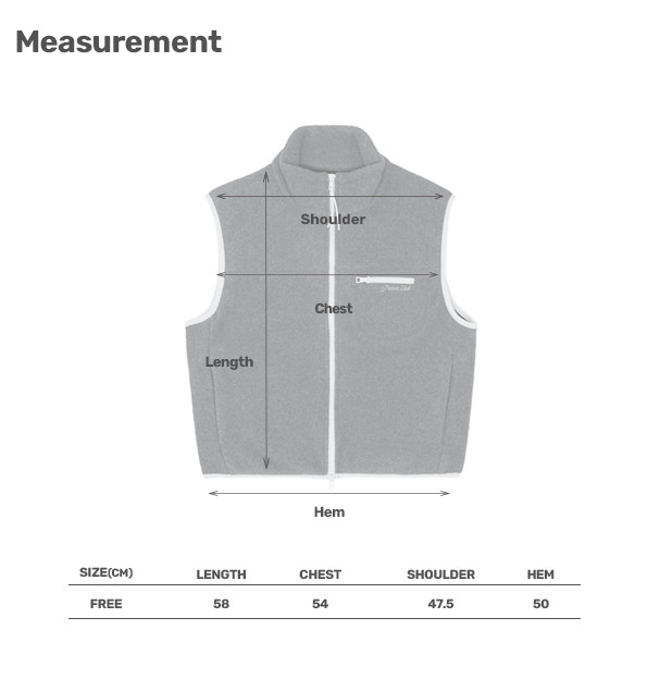 치수<MEASUREMENT> F LENGTH 58CM SHOULDER 47.5CM CHEST 54CM HEM 50CM