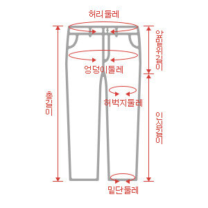 | 사이즈 | 허리둘레 | 엉덩이둘레 | 허벅지둘레 | 밑단둘레 | 총기장(아웃심) |