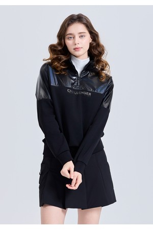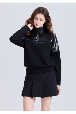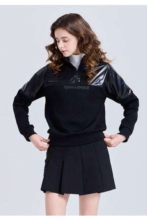 여성 우븐패치 하이넥 반집업 기모 긴팔 티셔츠 블랙