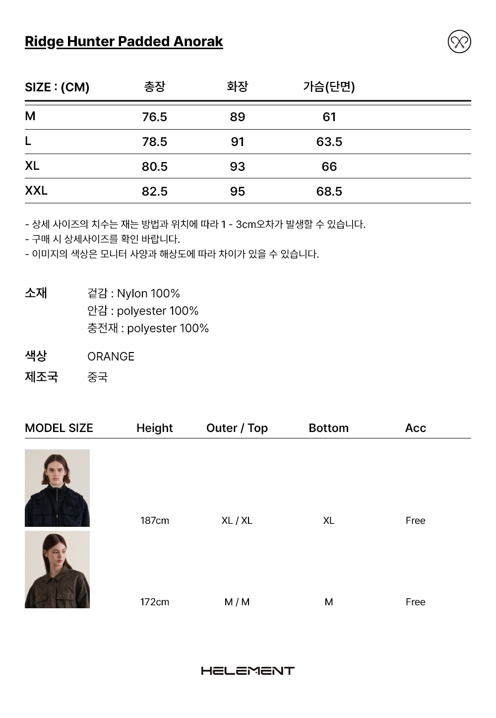 [힐리먼트] 릿지 헌터 패딩 아노락 (ORANGE)