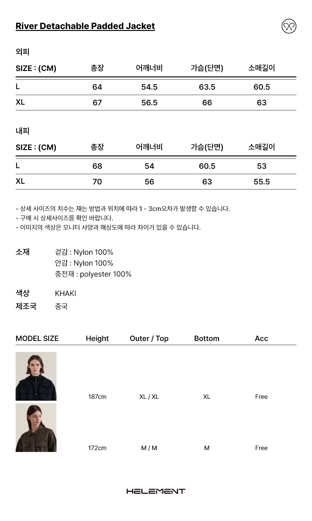 [힐리먼트] 리버 디테쳐블 패딩 자켓 (KHAKI)