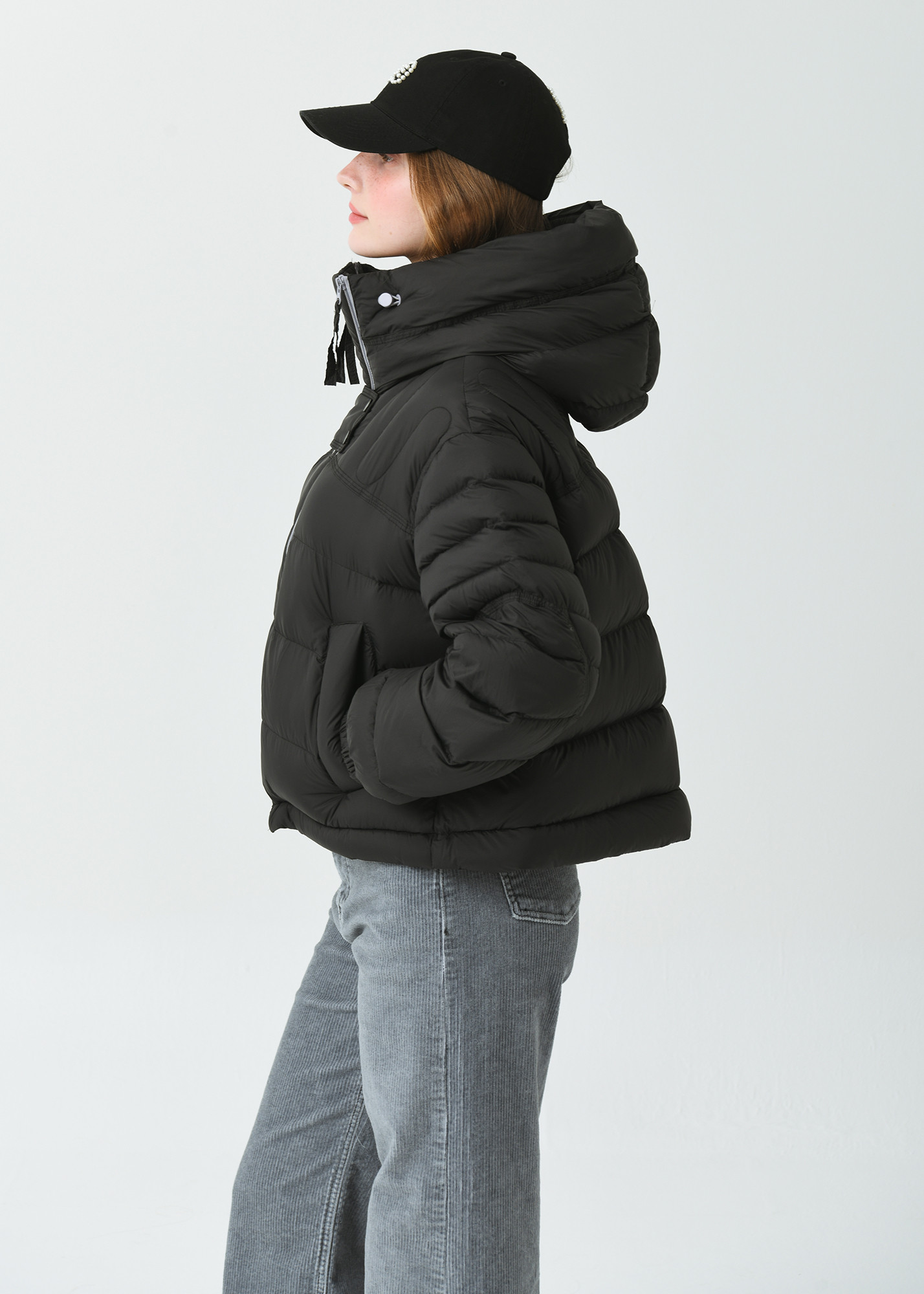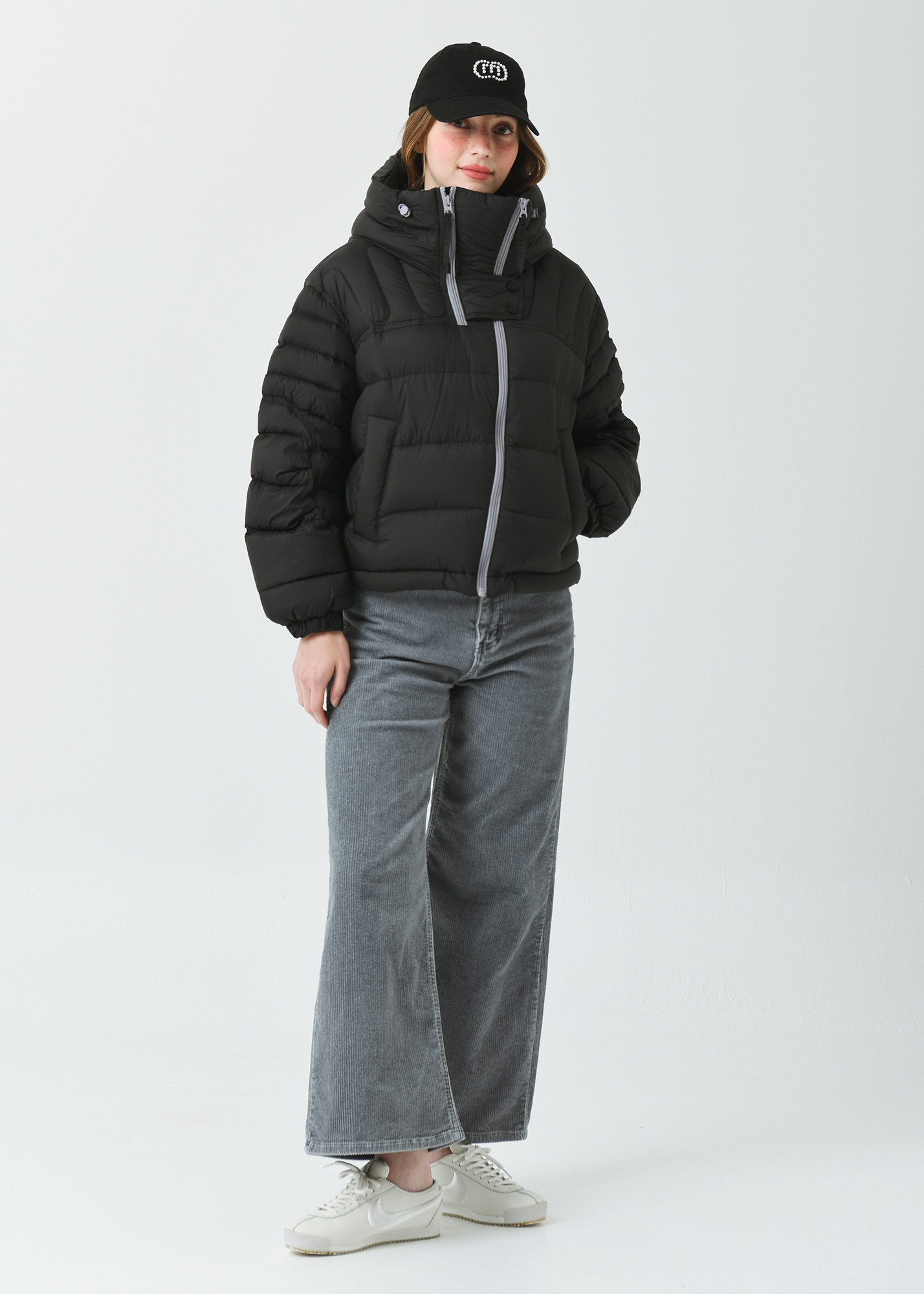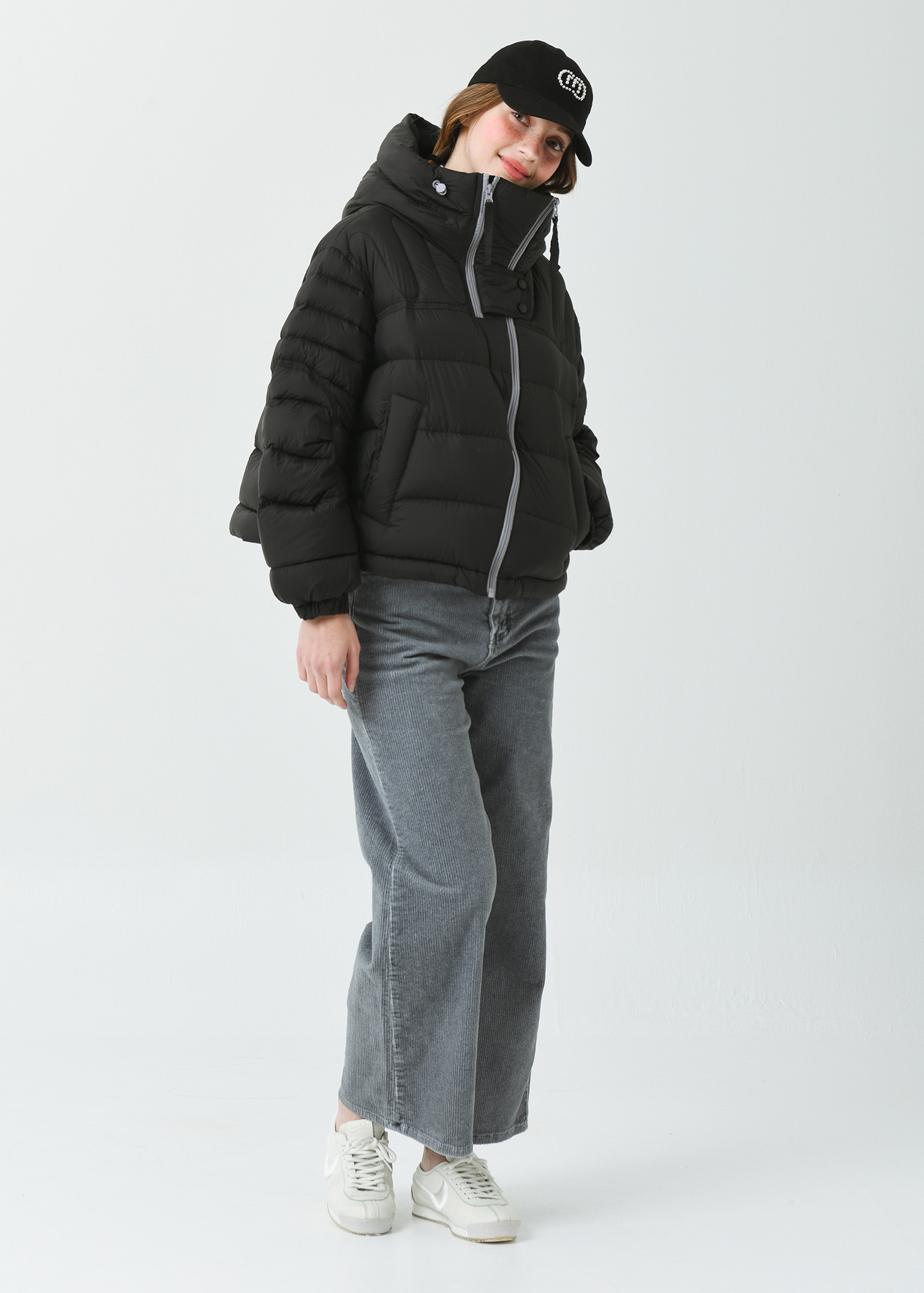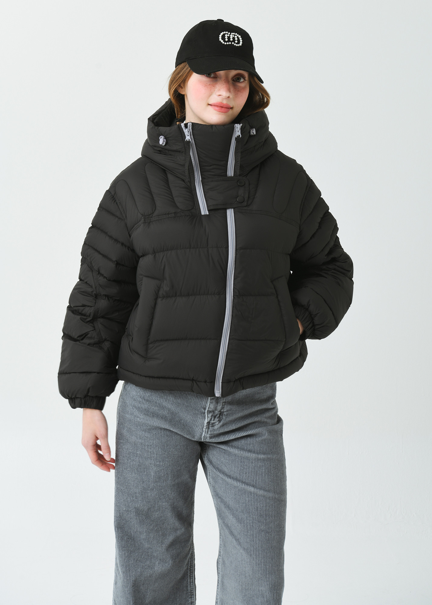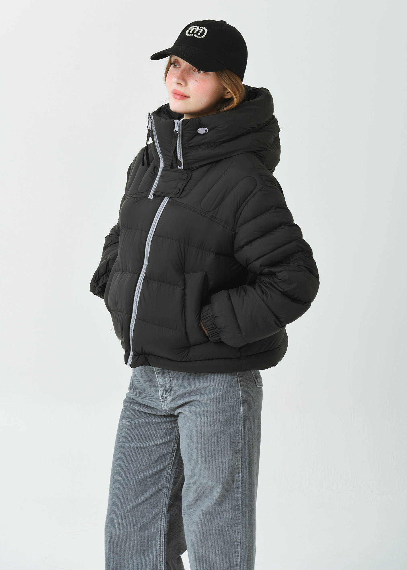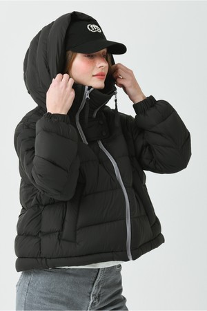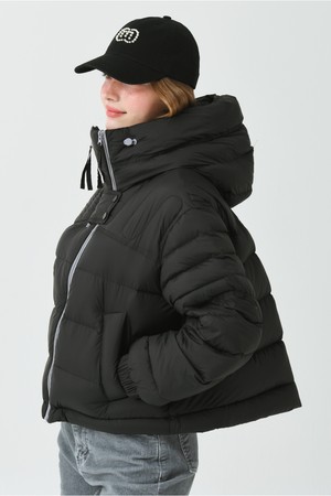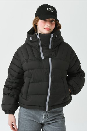 DETAIL:배색 작업된 사선형 지퍼가 포인트인 크롭 길이감의 헤비 덕 다운 점퍼입니다.