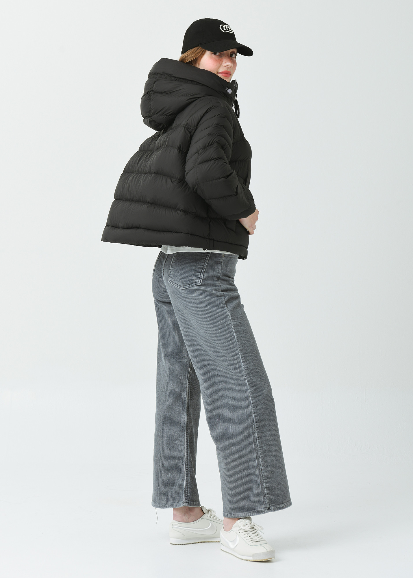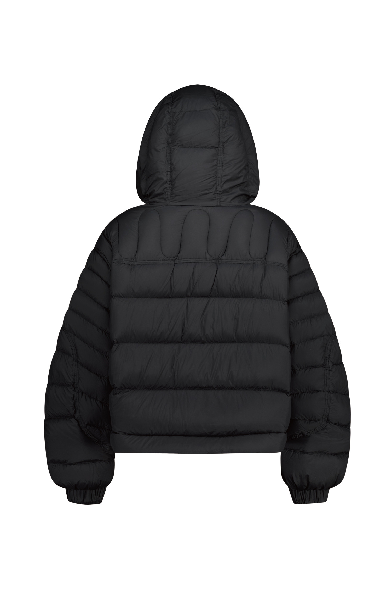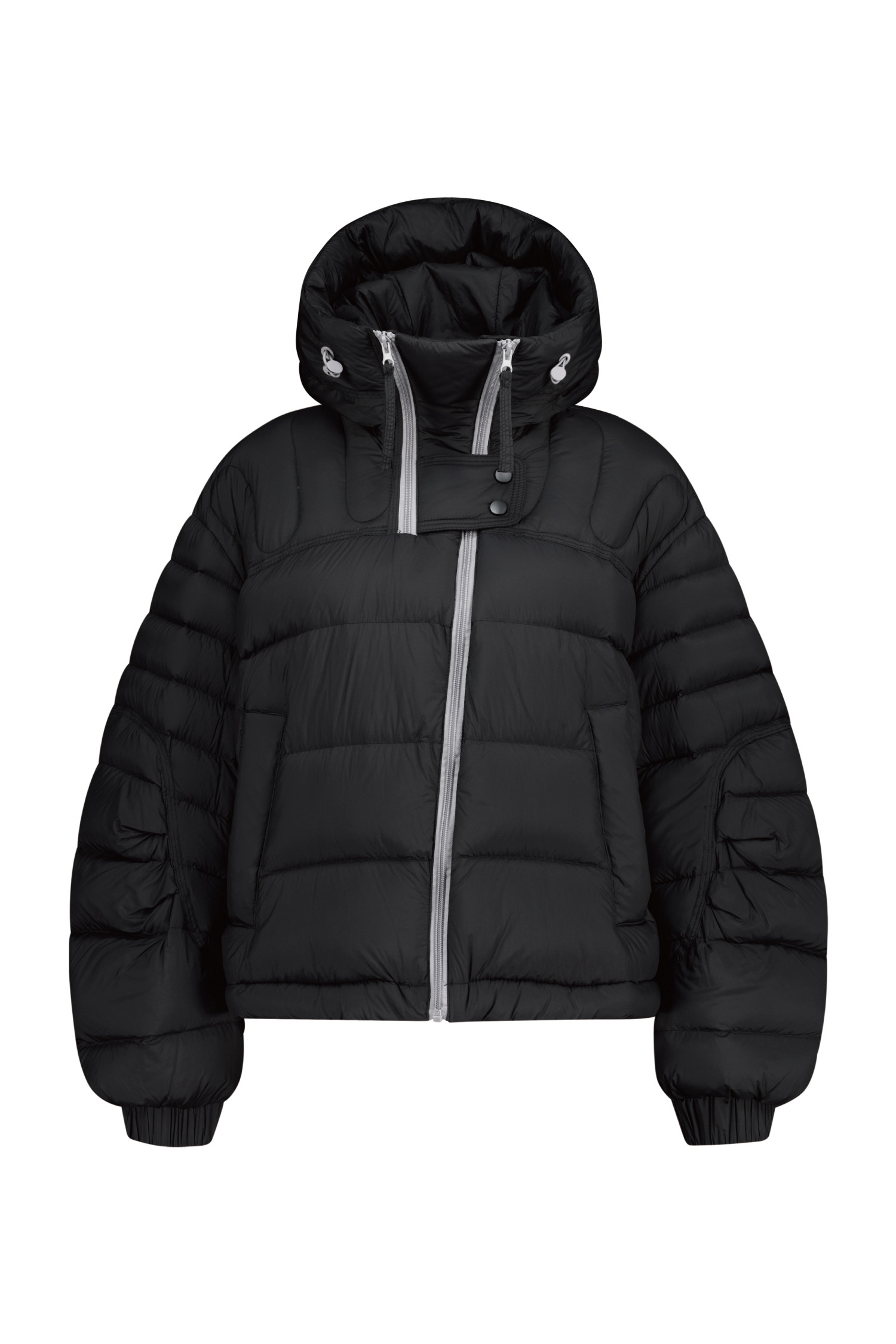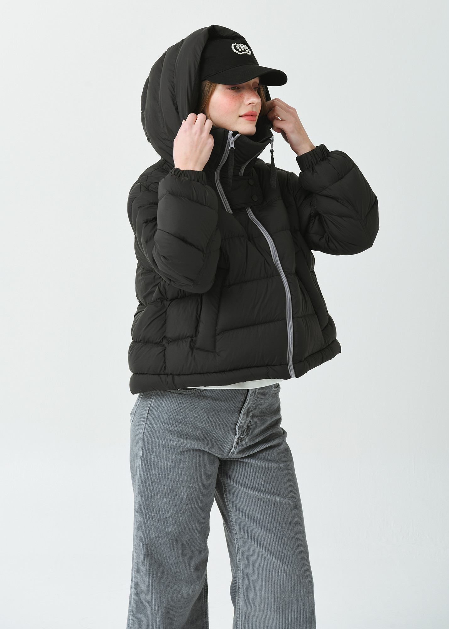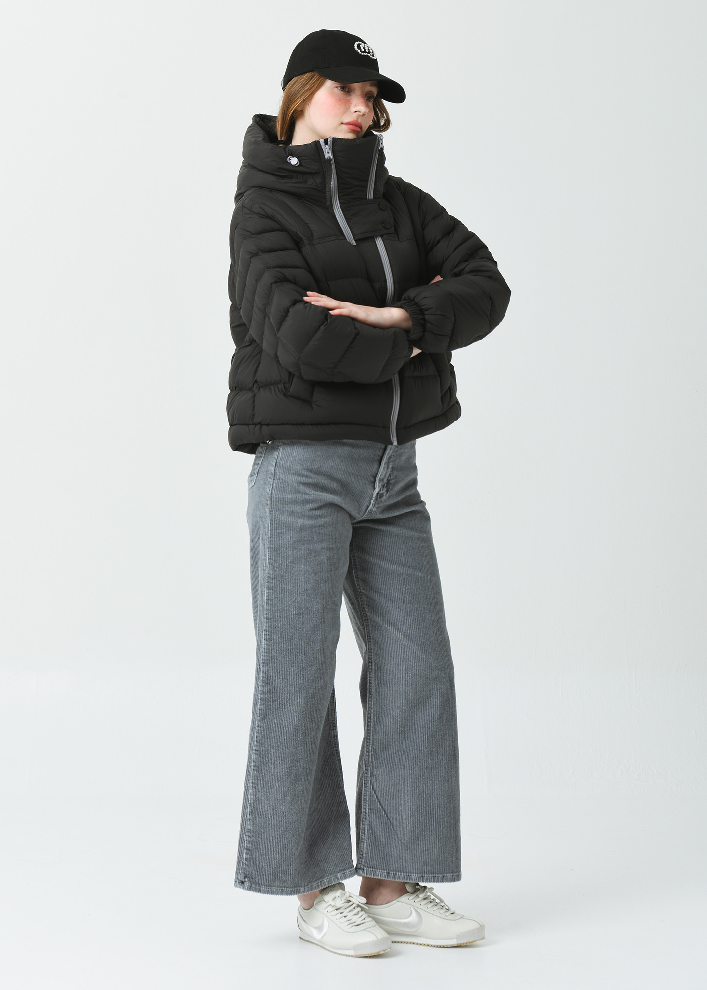 DETAIL:배색 작업된 사선형 지퍼가 포인트인 크롭 길이감의 헤비 덕 다운 점퍼입니다.