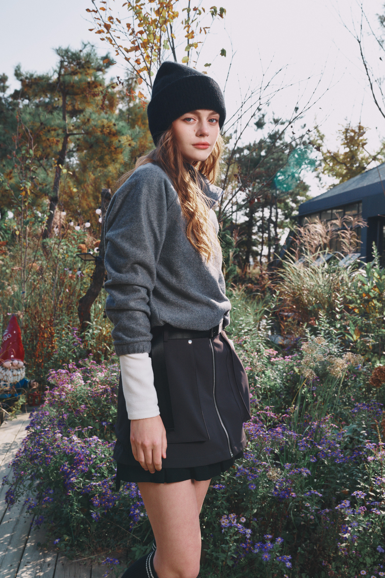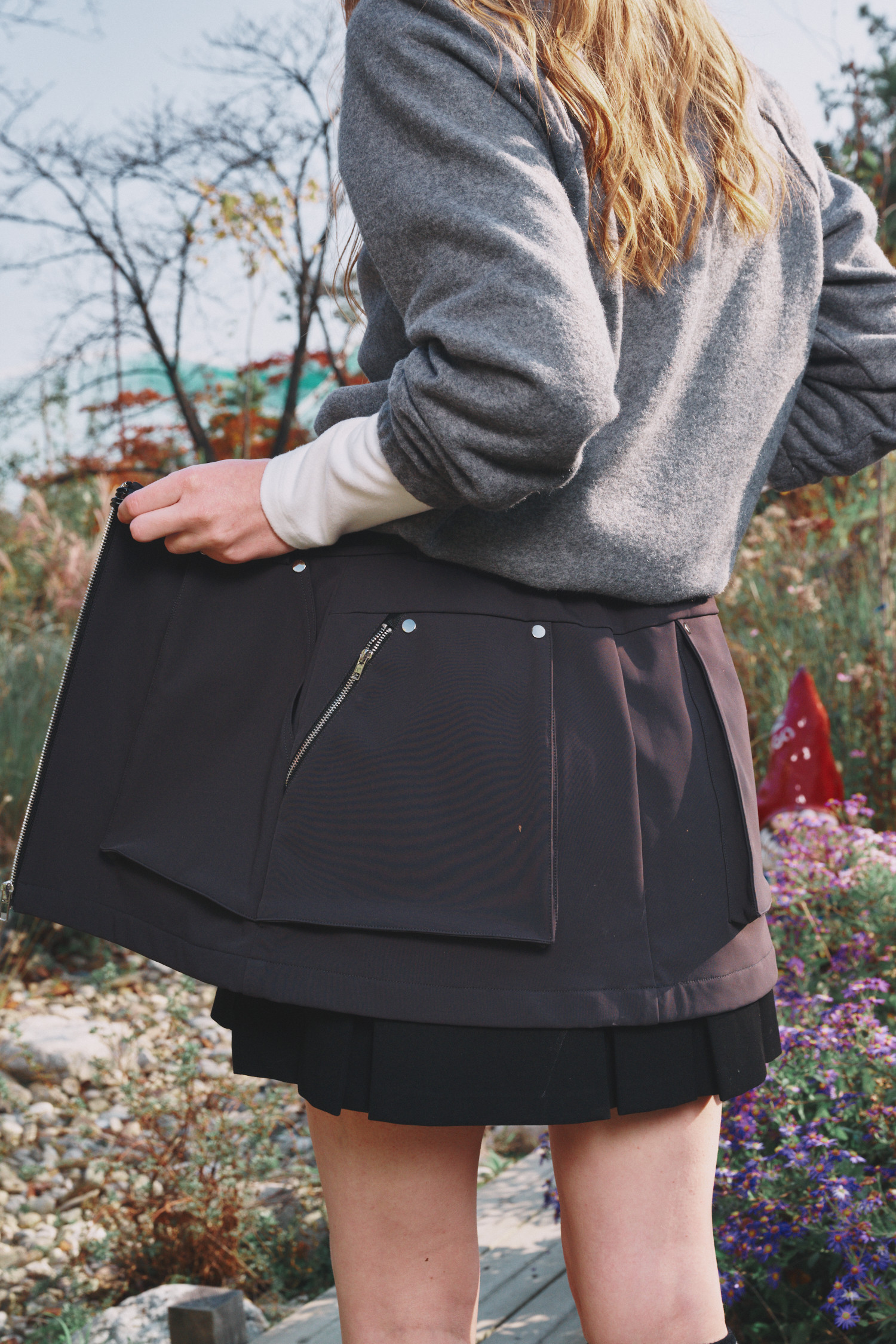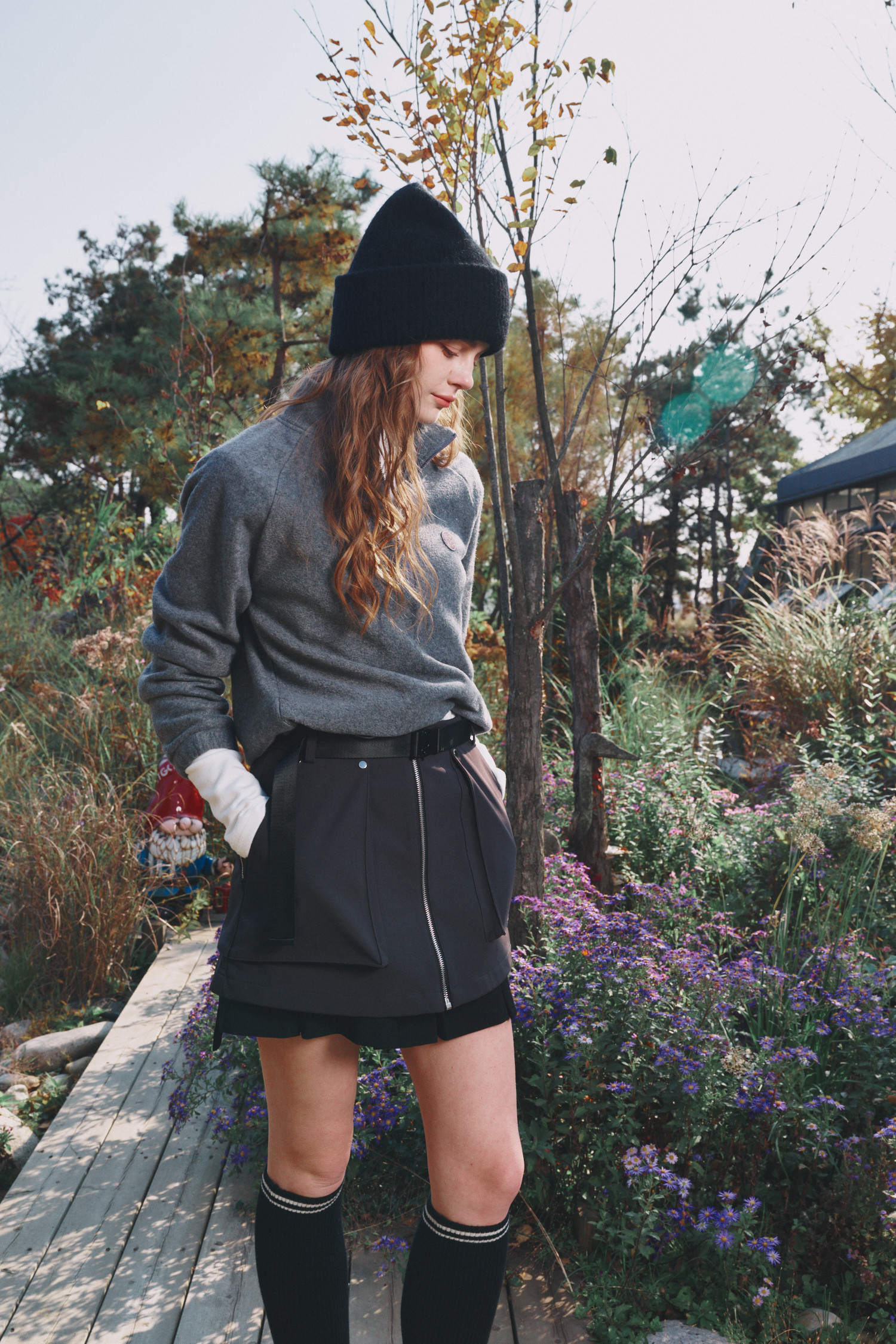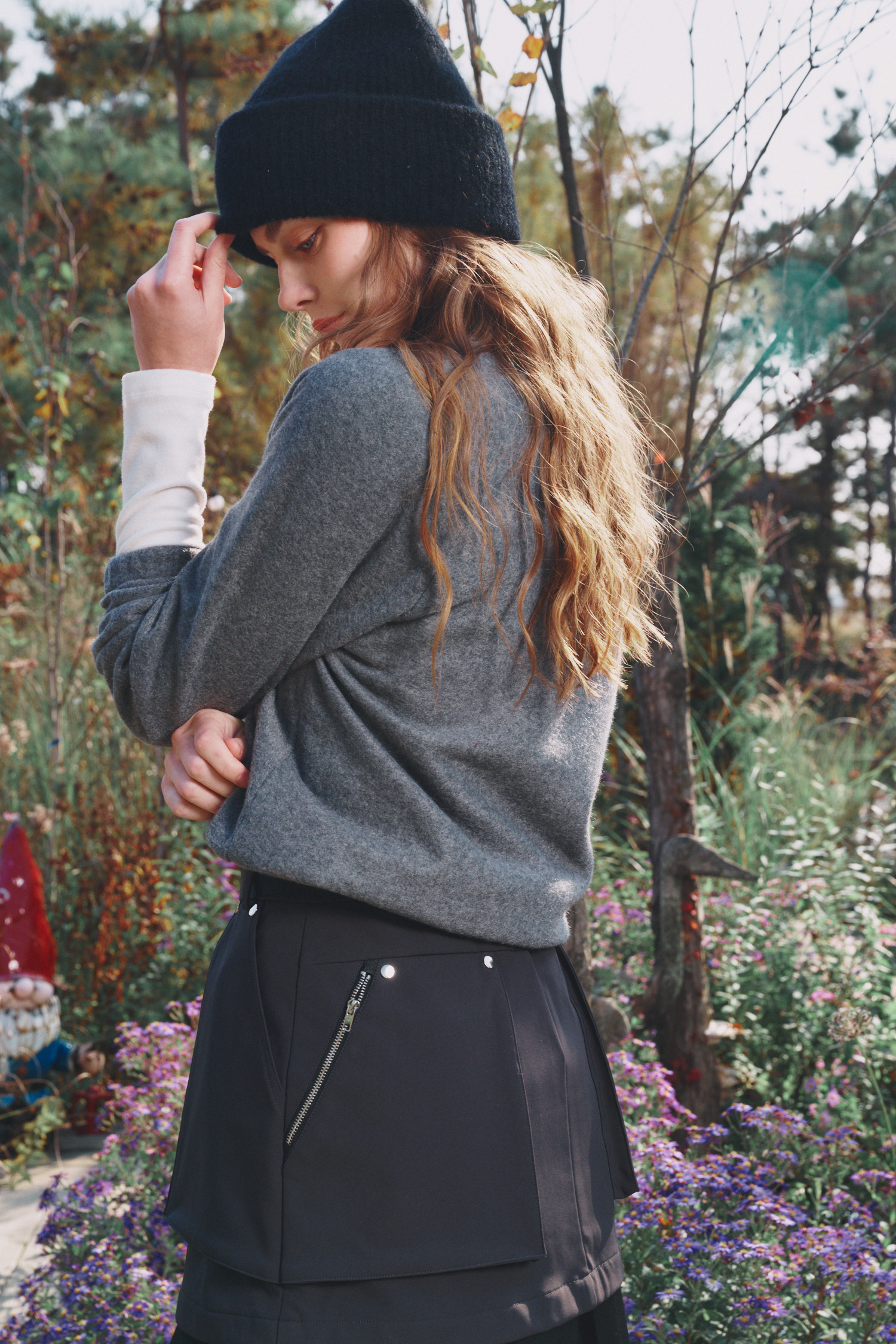 앞중심에 실버 컬러 지퍼와 실버 컬러 리벳 디테일들로 엣지 있는 룩이 완성되는 아이템입니다