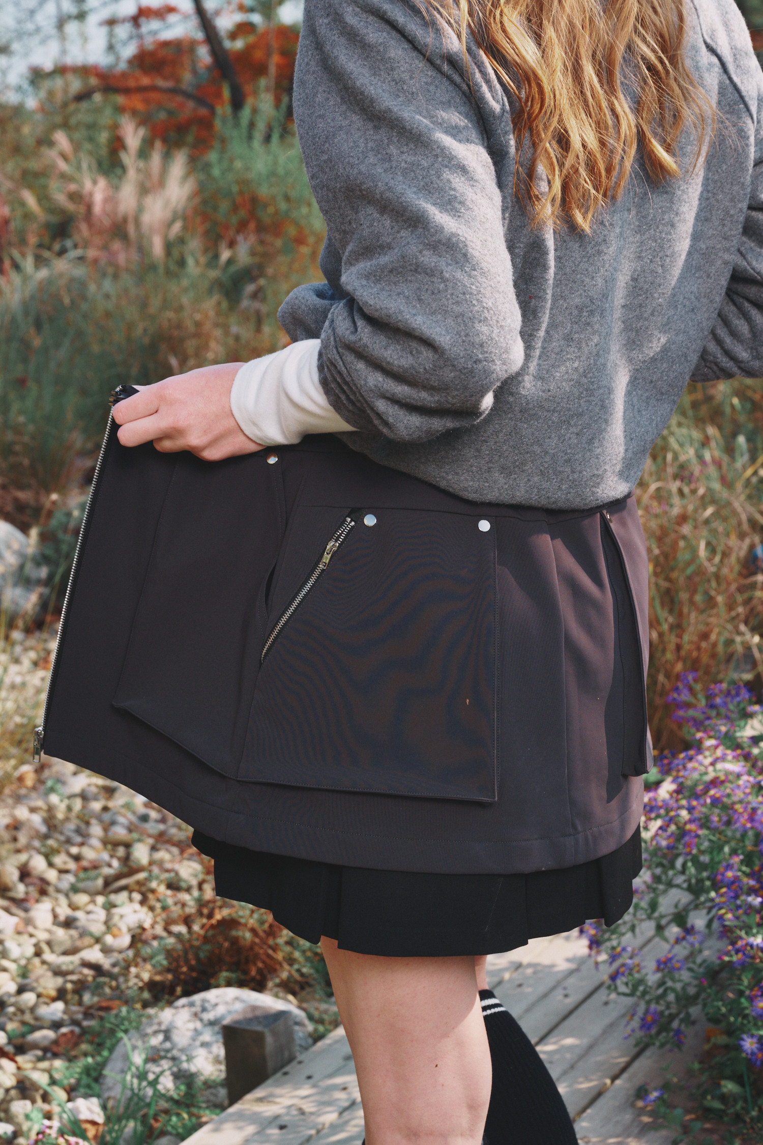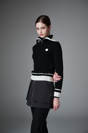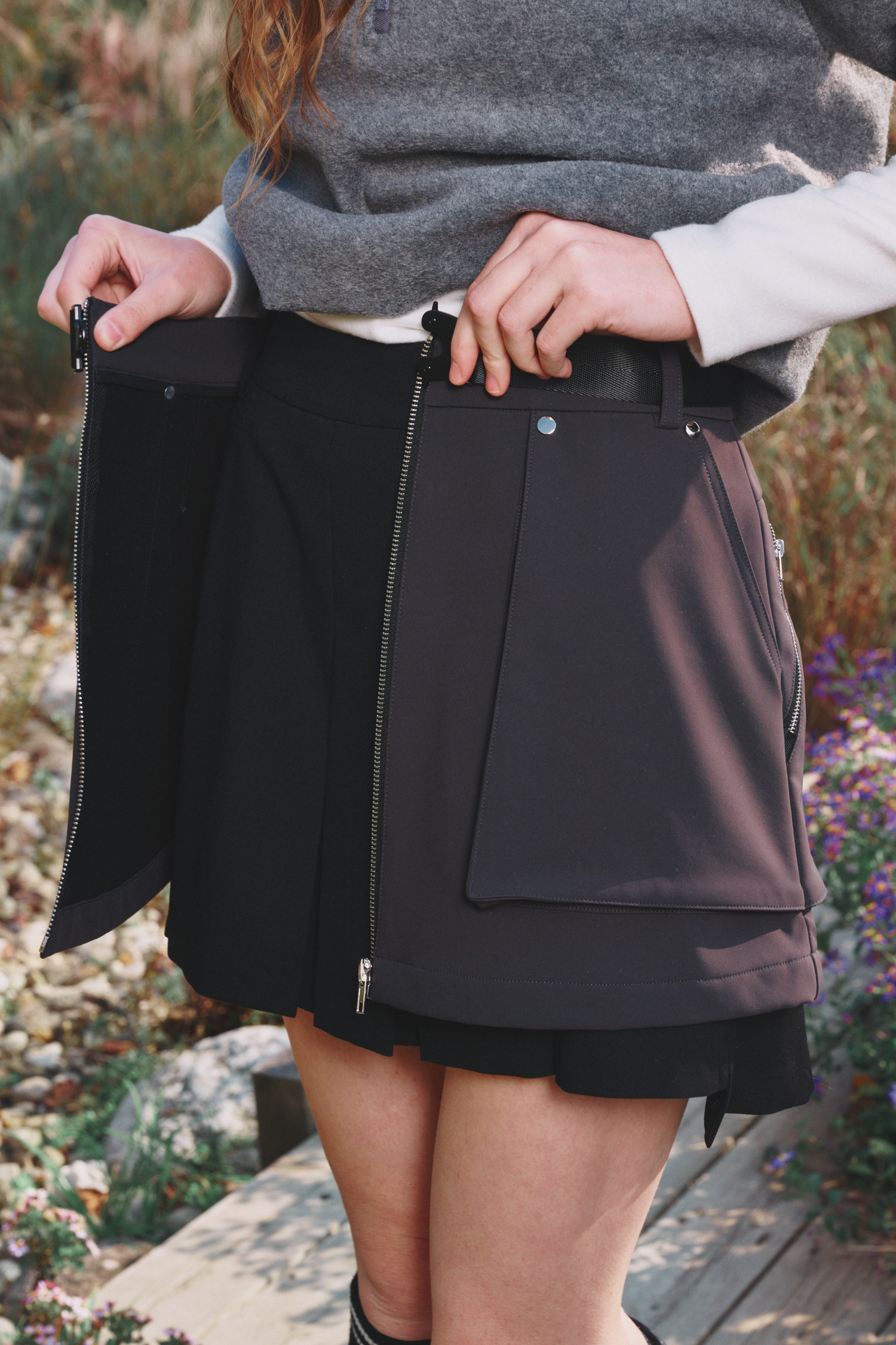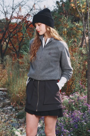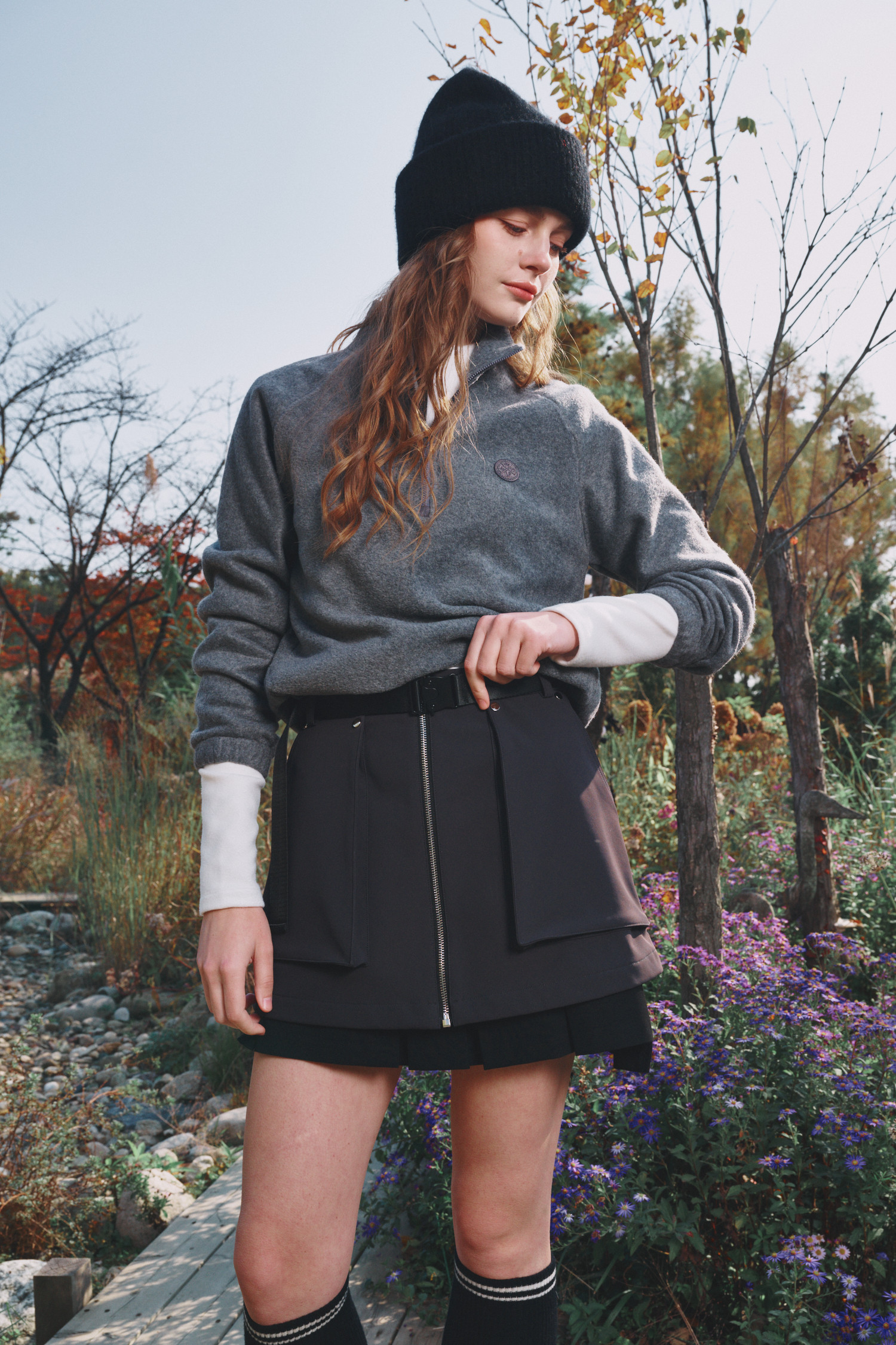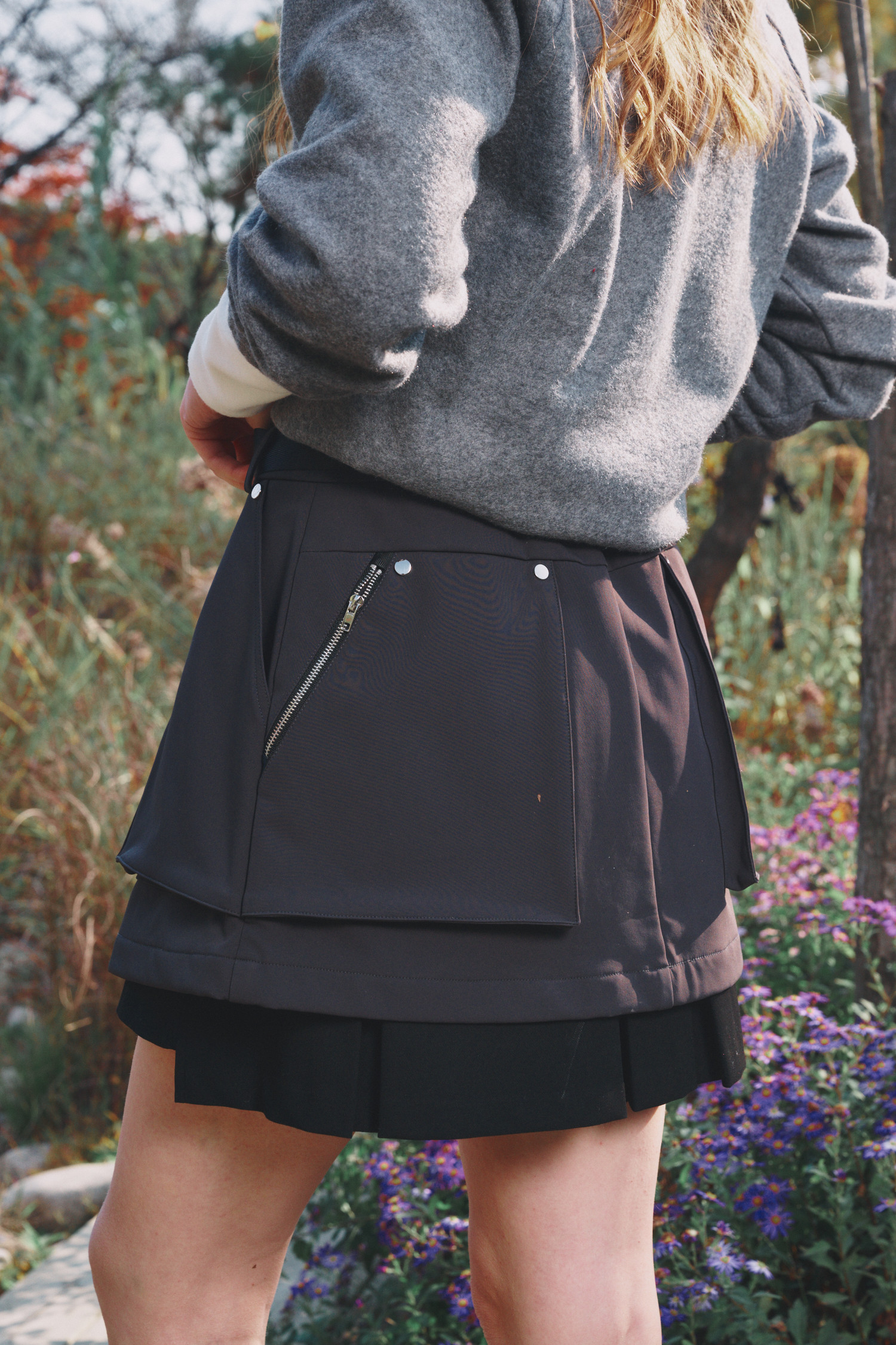 앞중심에 실버 컬러 지퍼와 실버 컬러 리벳 디테일들로 엣지 있는 룩이 완성되는 아이템입니다
