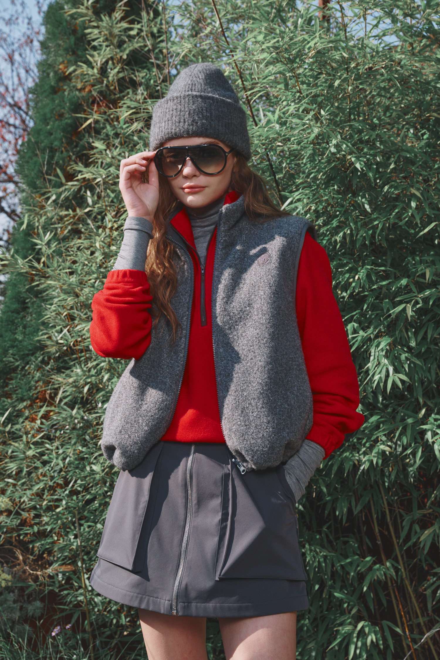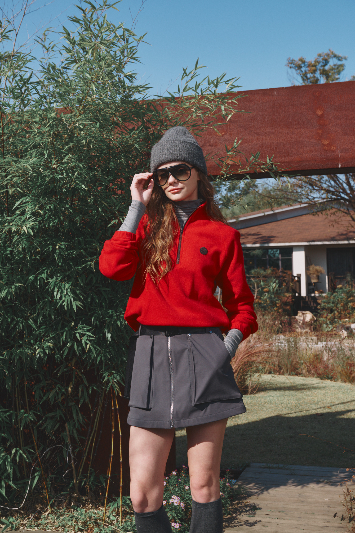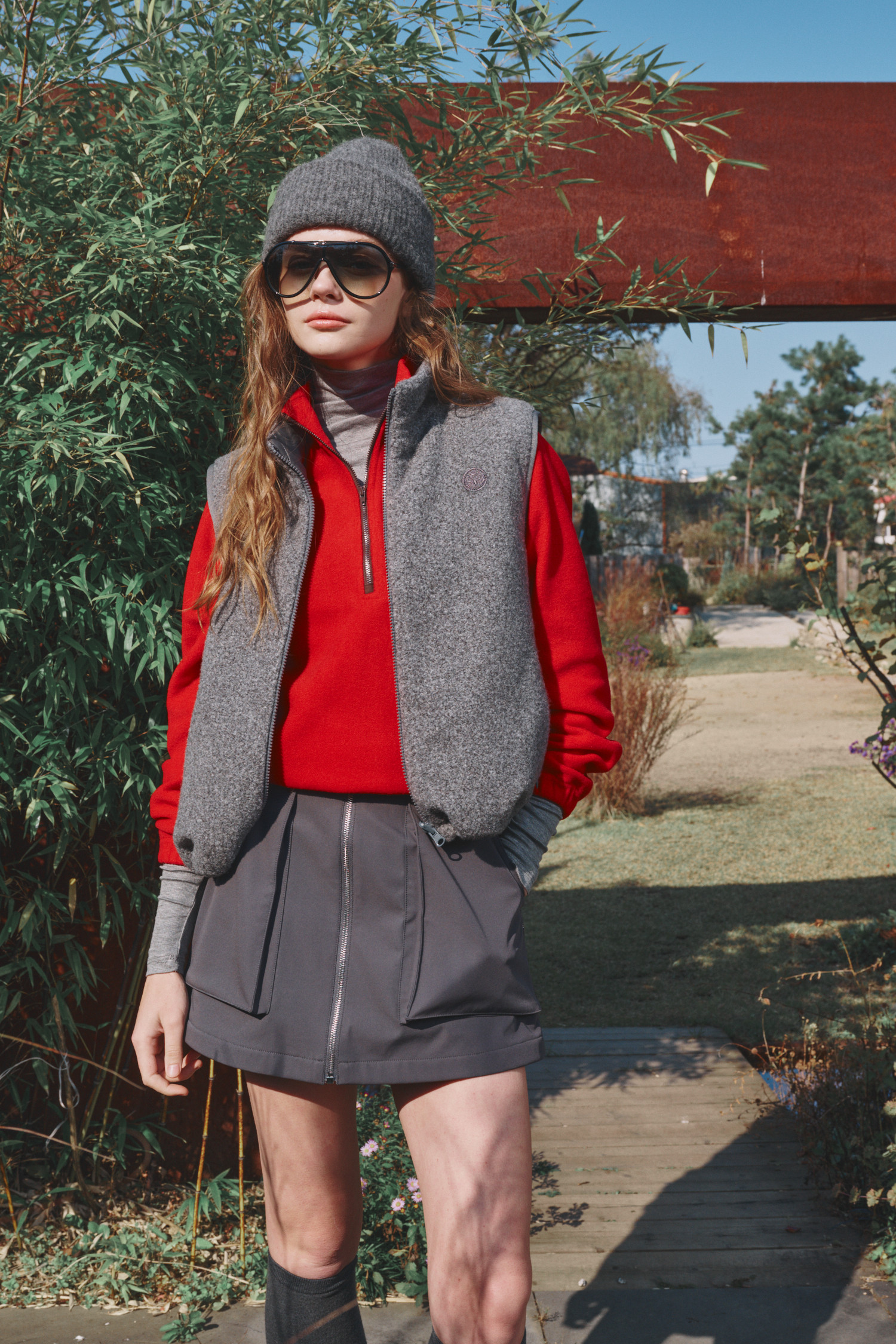 앞중심에 실버 컬러 지퍼와 실버 컬러 리벳 디테일들로 엣지 있는 룩이 완성되는 아이템입니다