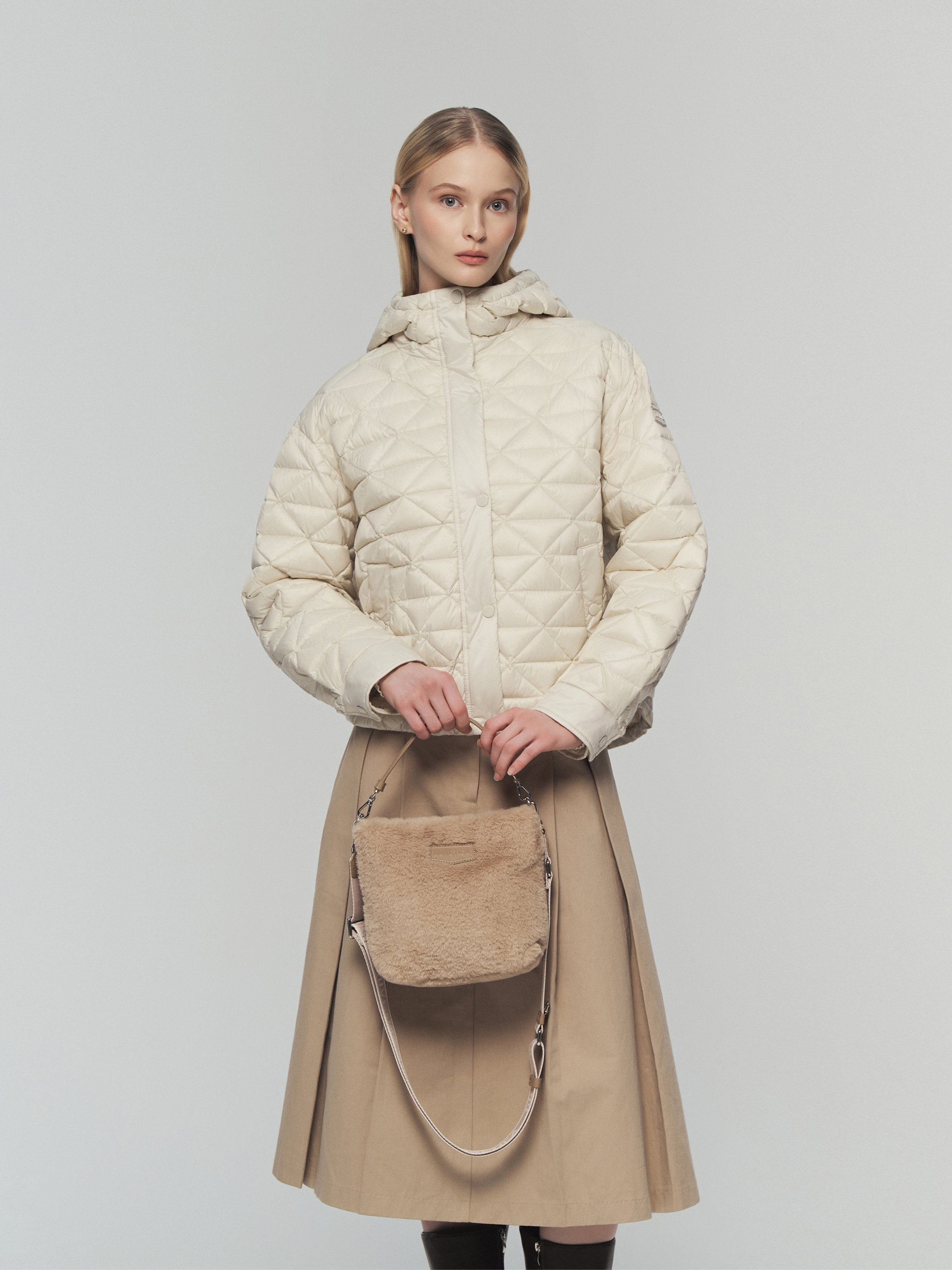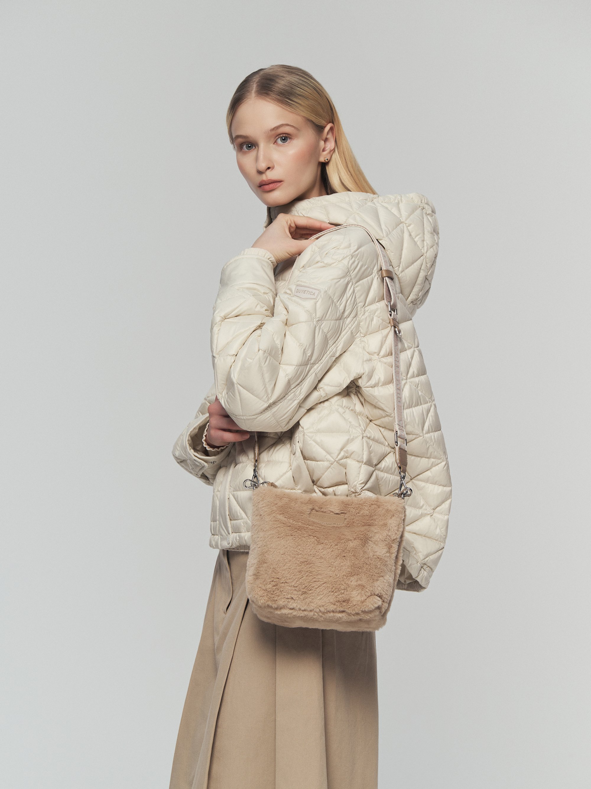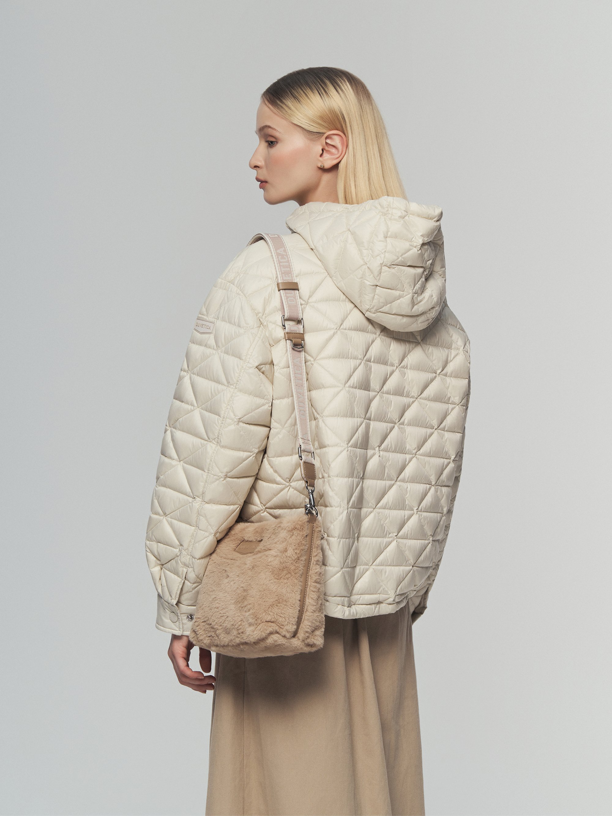 - 전면 DUVETICA 로고 와펜은 양각 PU레더 소재로 새로운 디자인의 브랜딩 포인트 제안