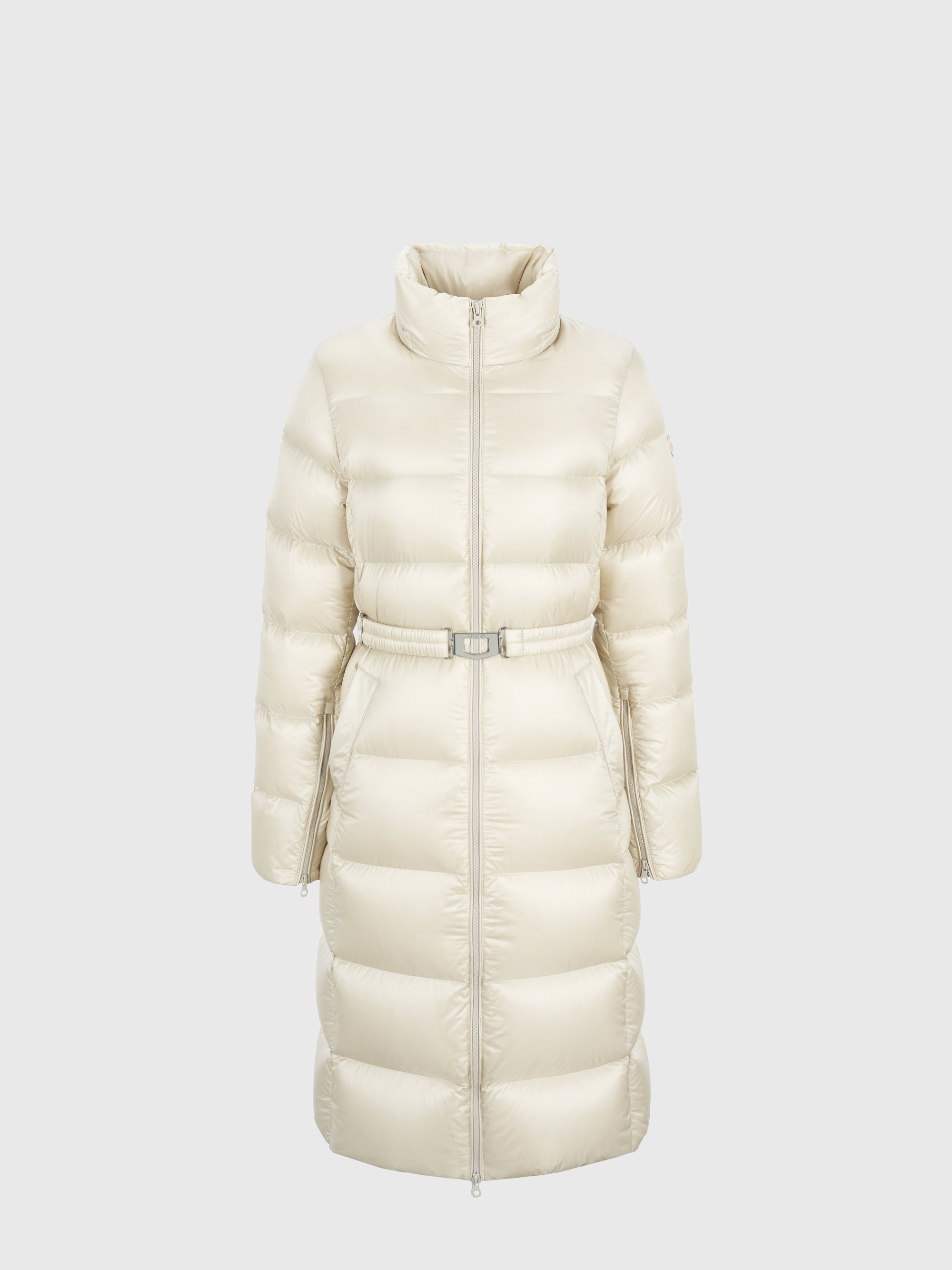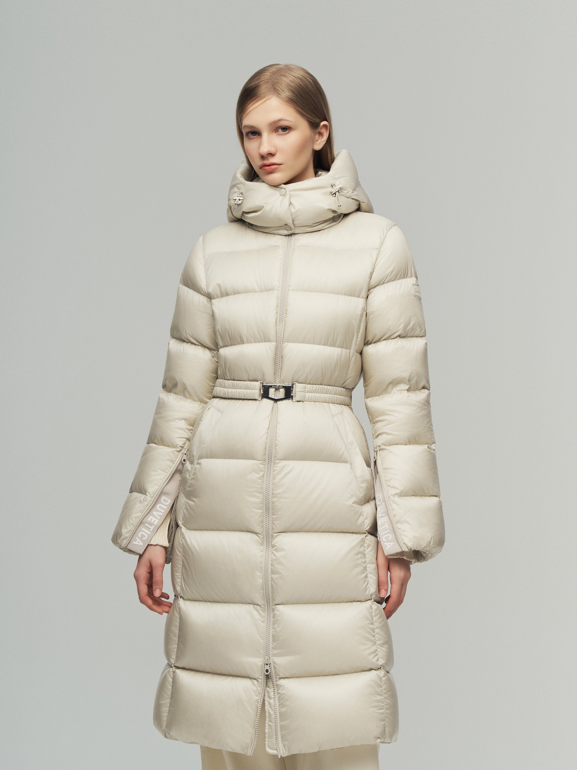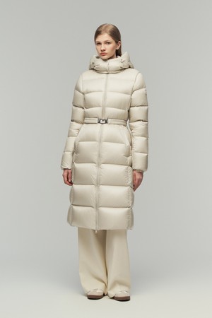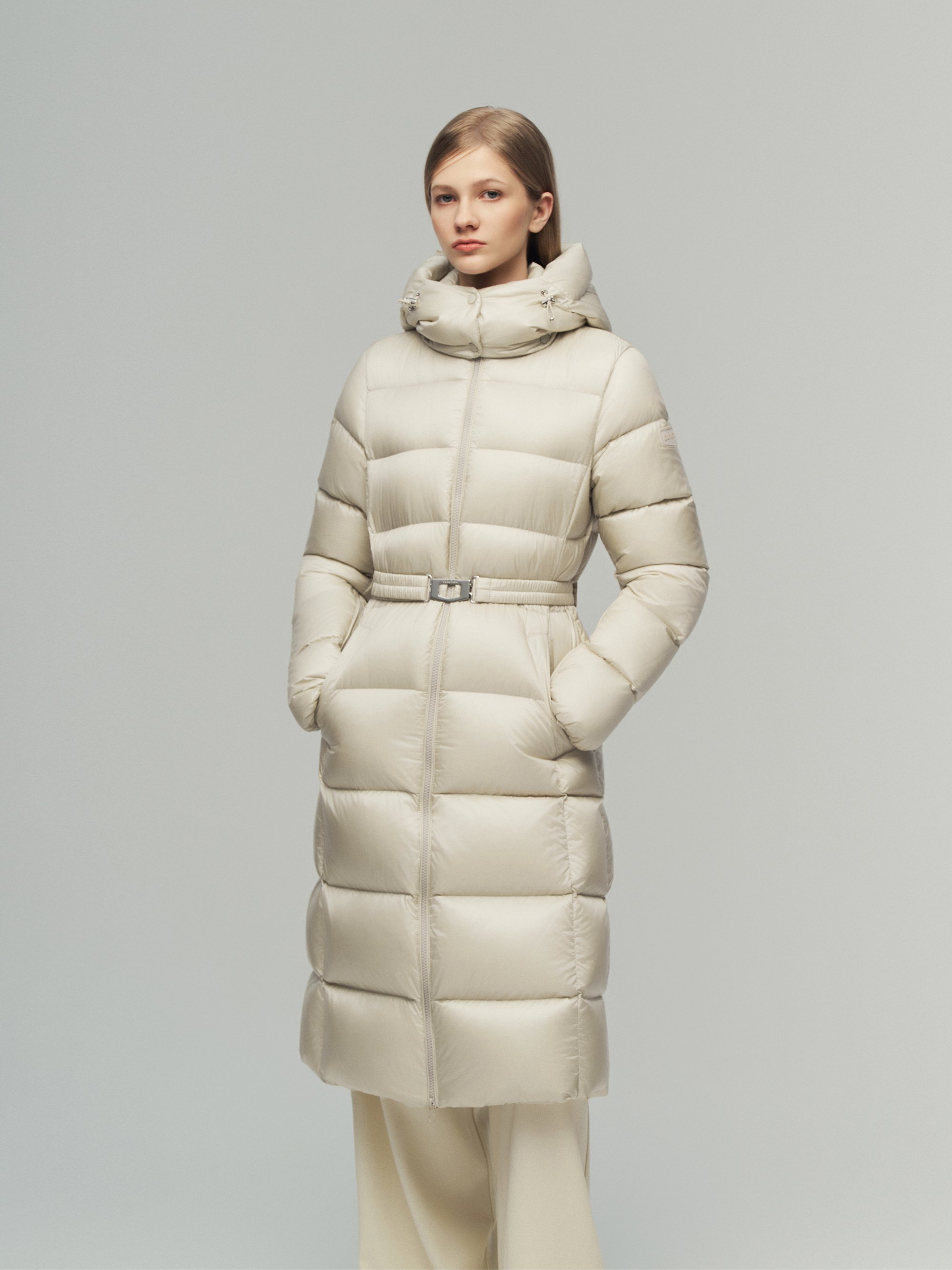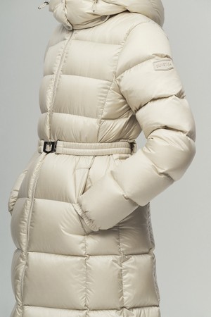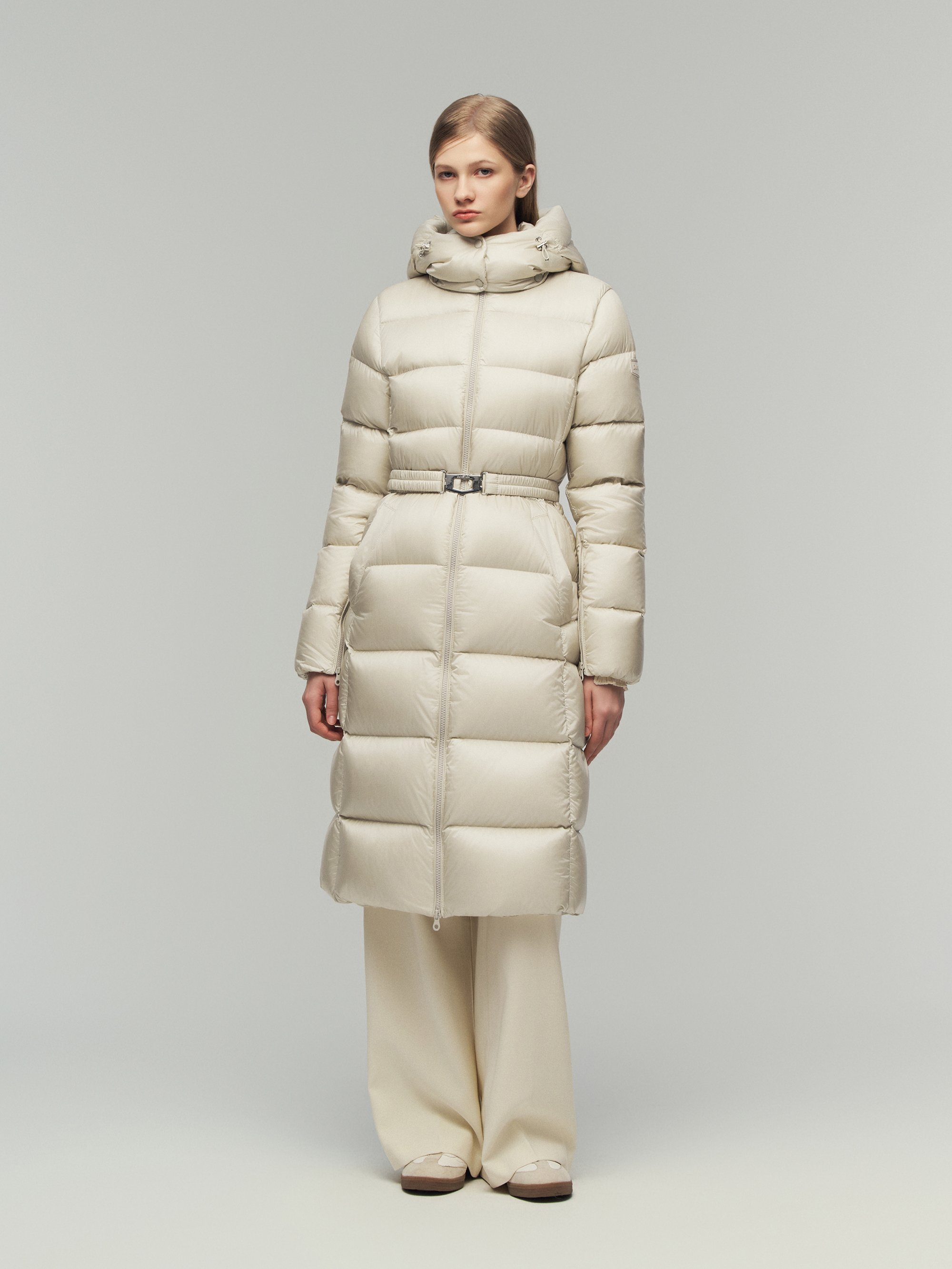 - 페미닌 실루엣과 은은한 반광 소재의 조화가 돋보이는 롱기장 다운 자켓