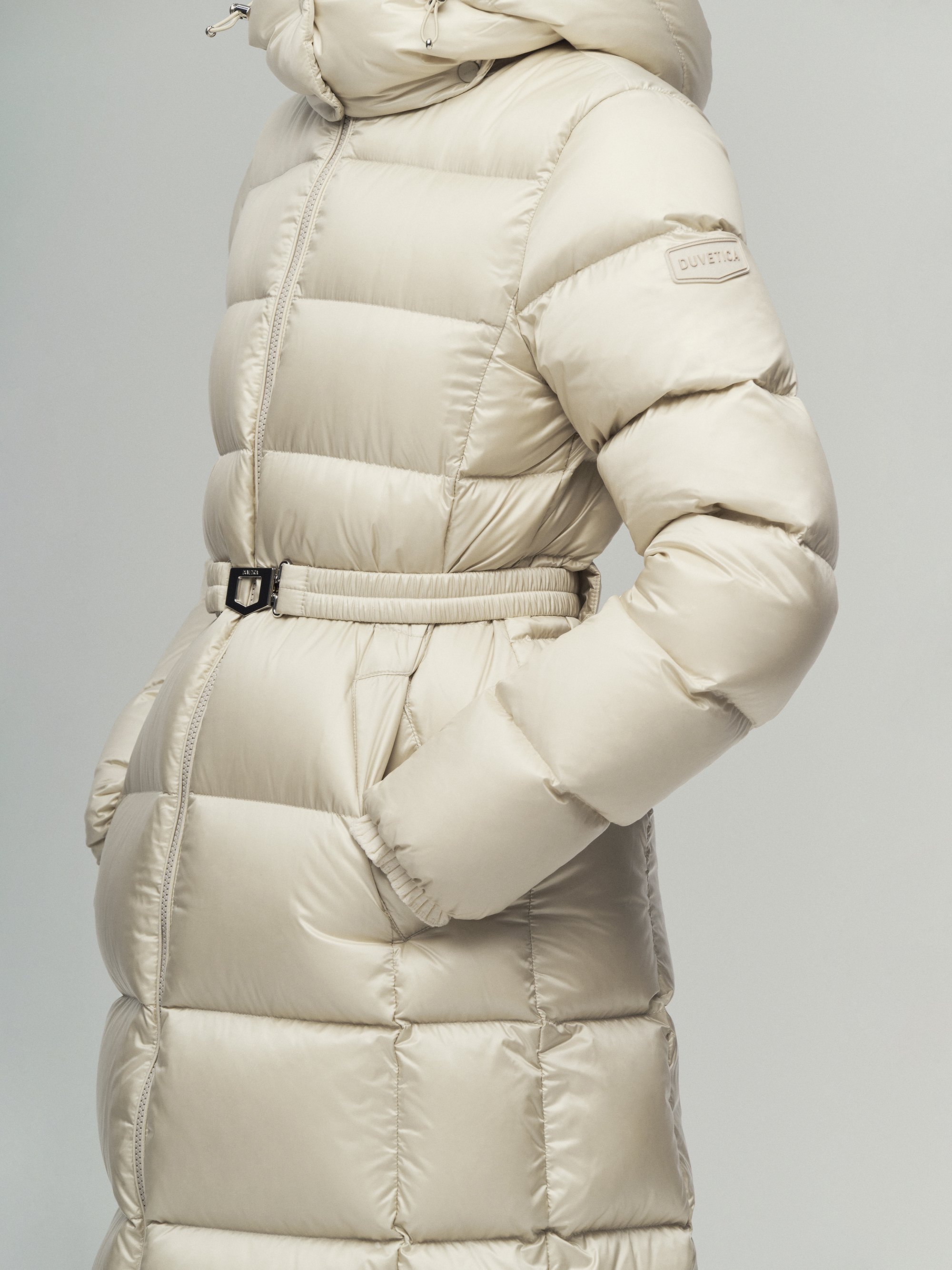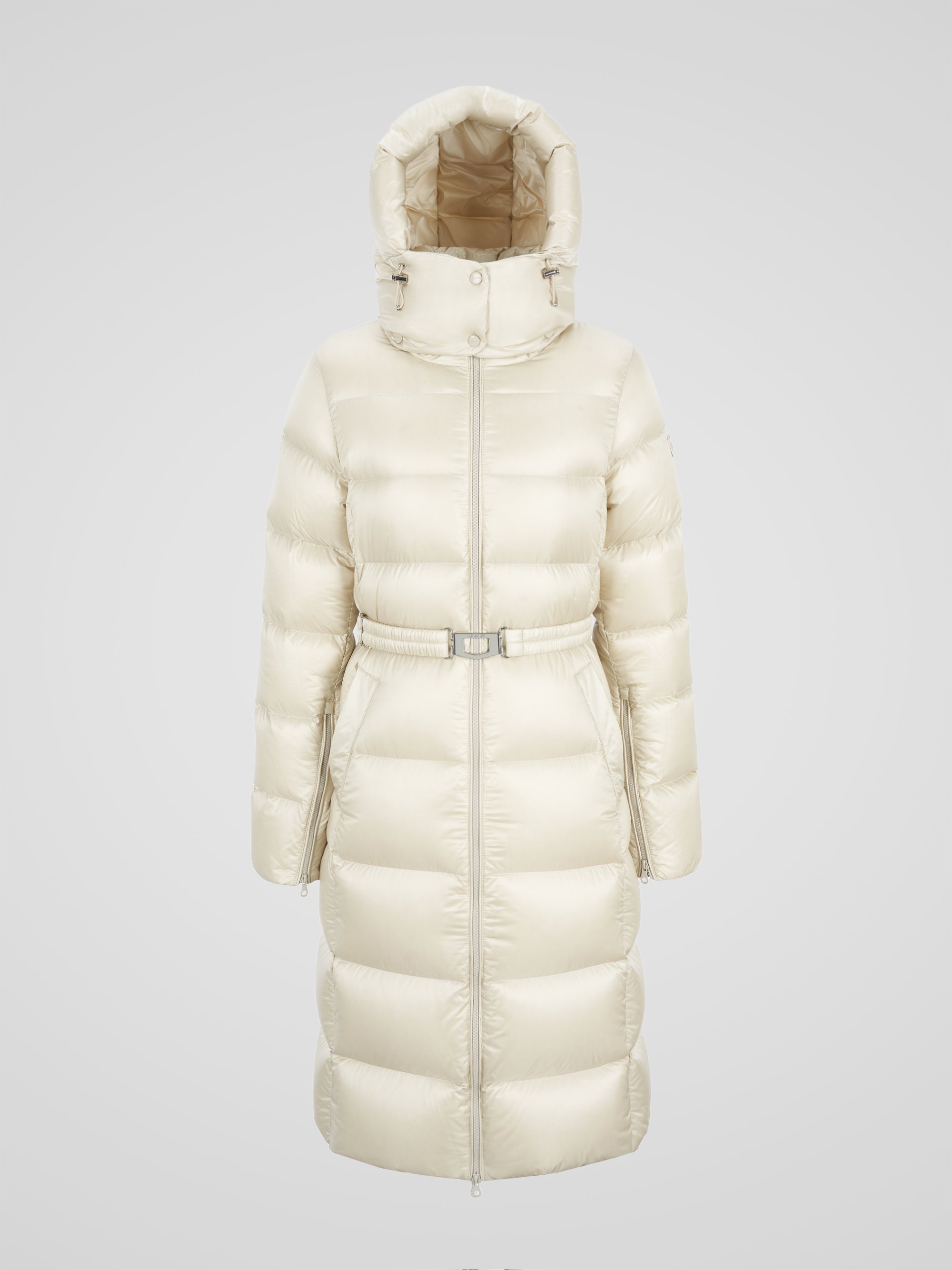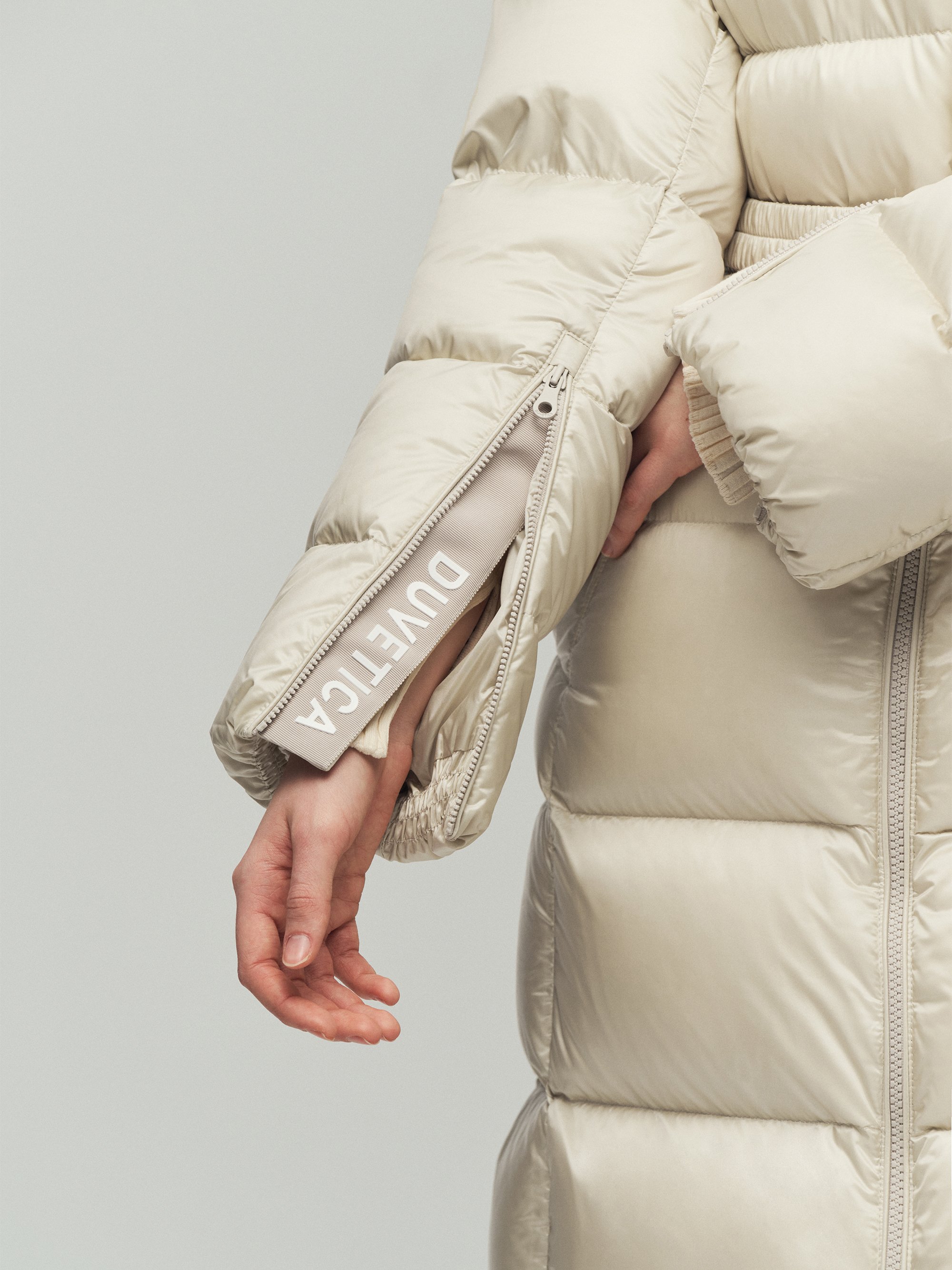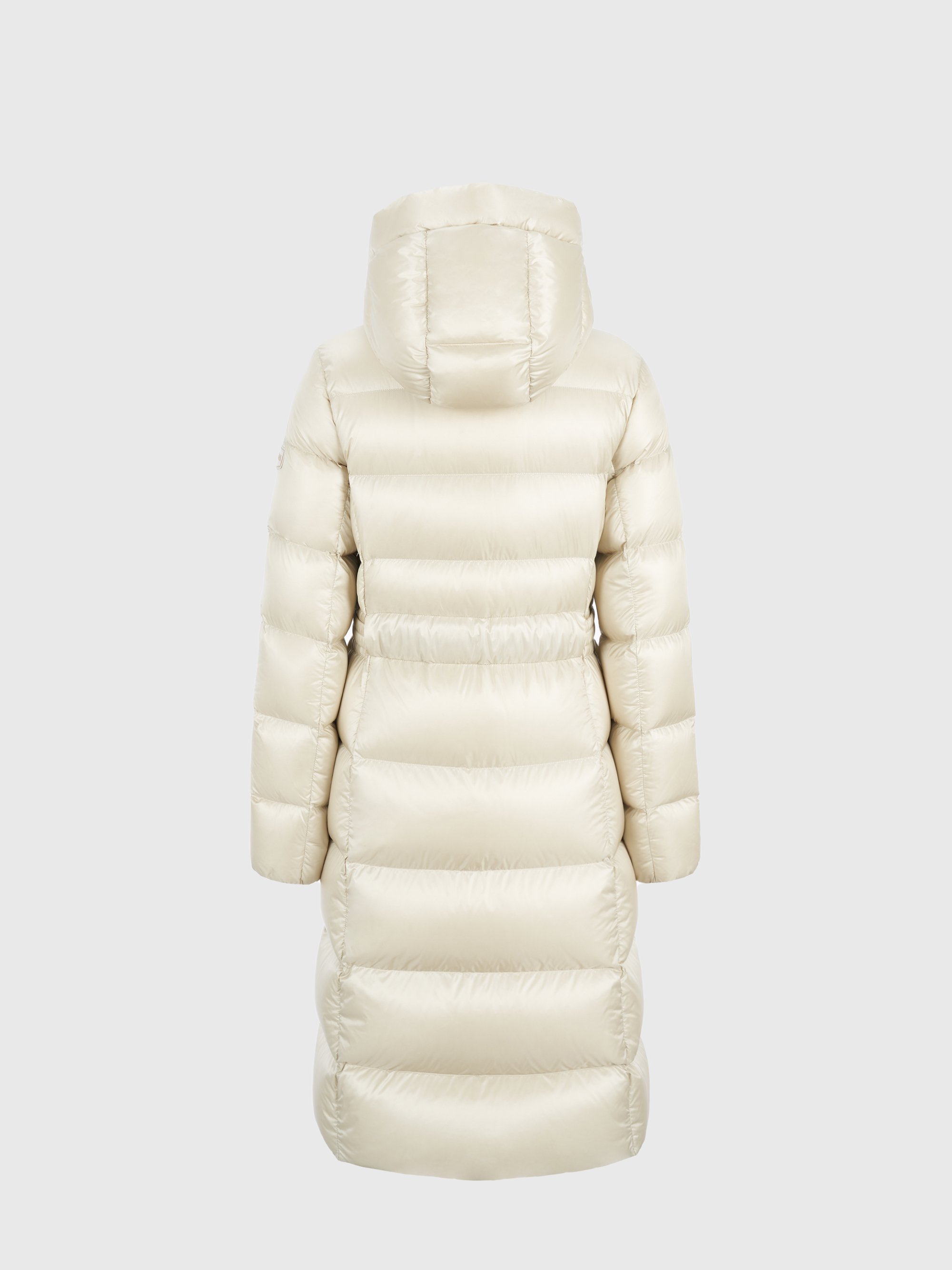 - 페미닌 실루엣과 은은한 반광 소재의 조화가 돋보이는 롱기장 다운 자켓