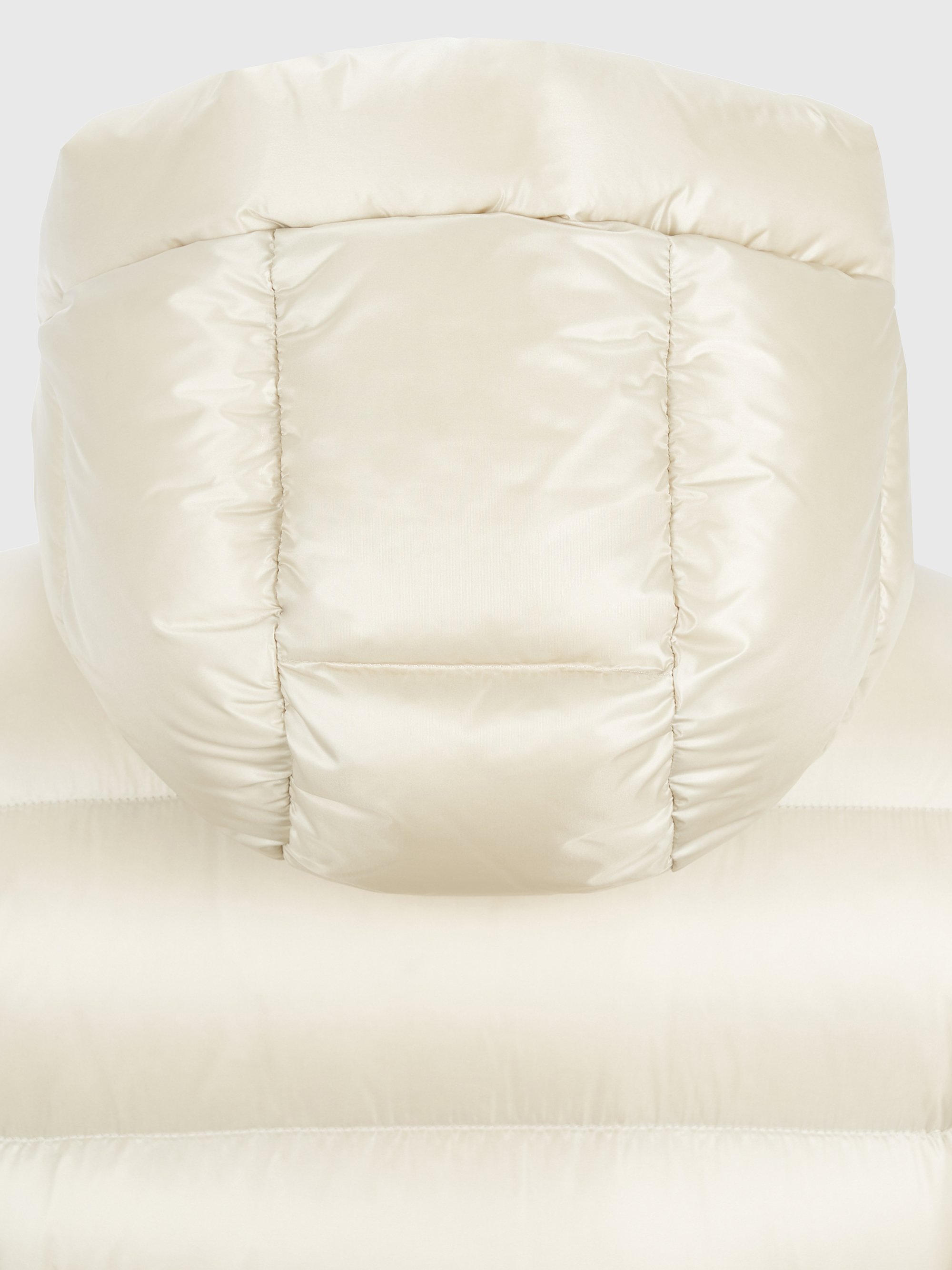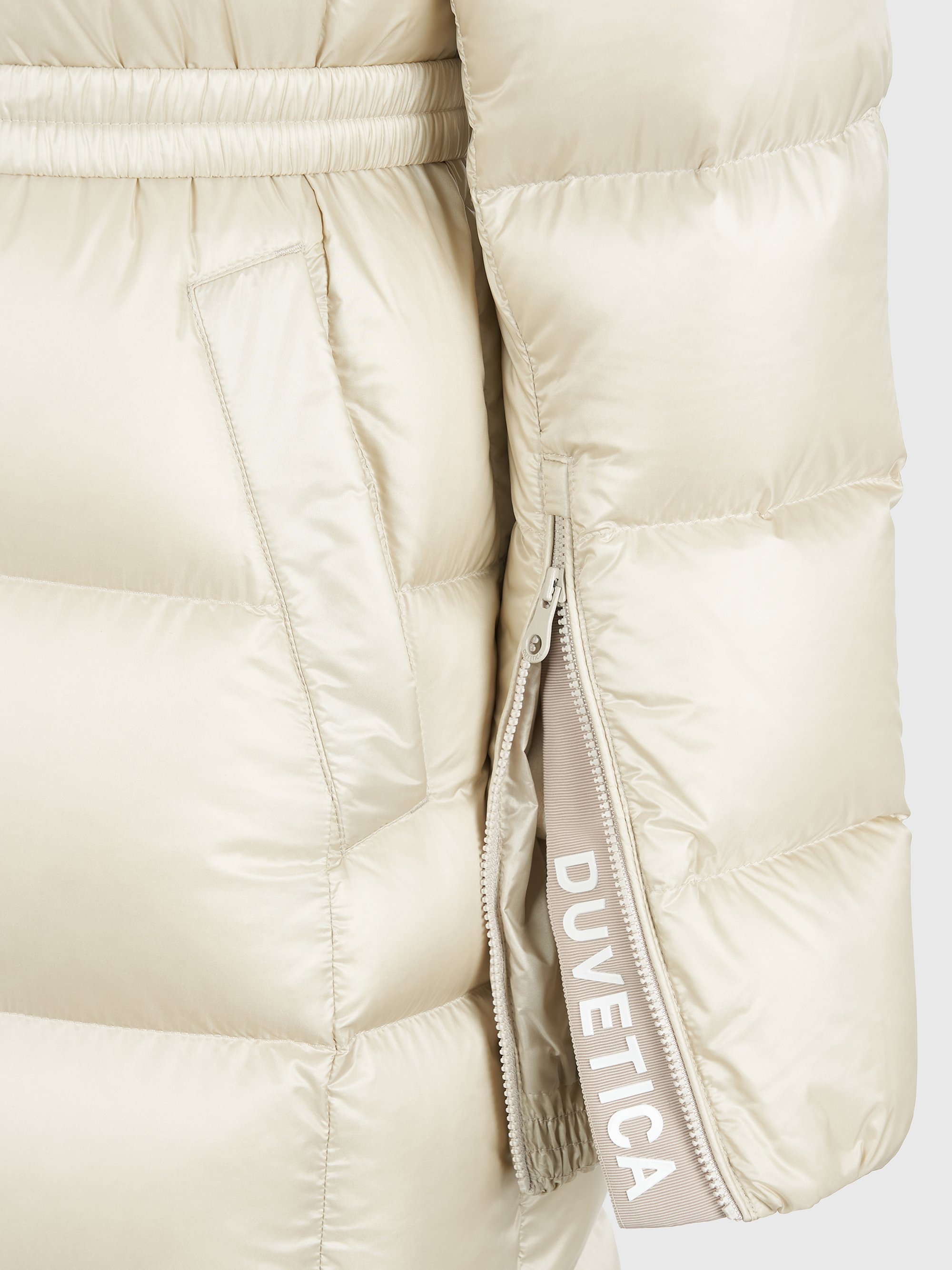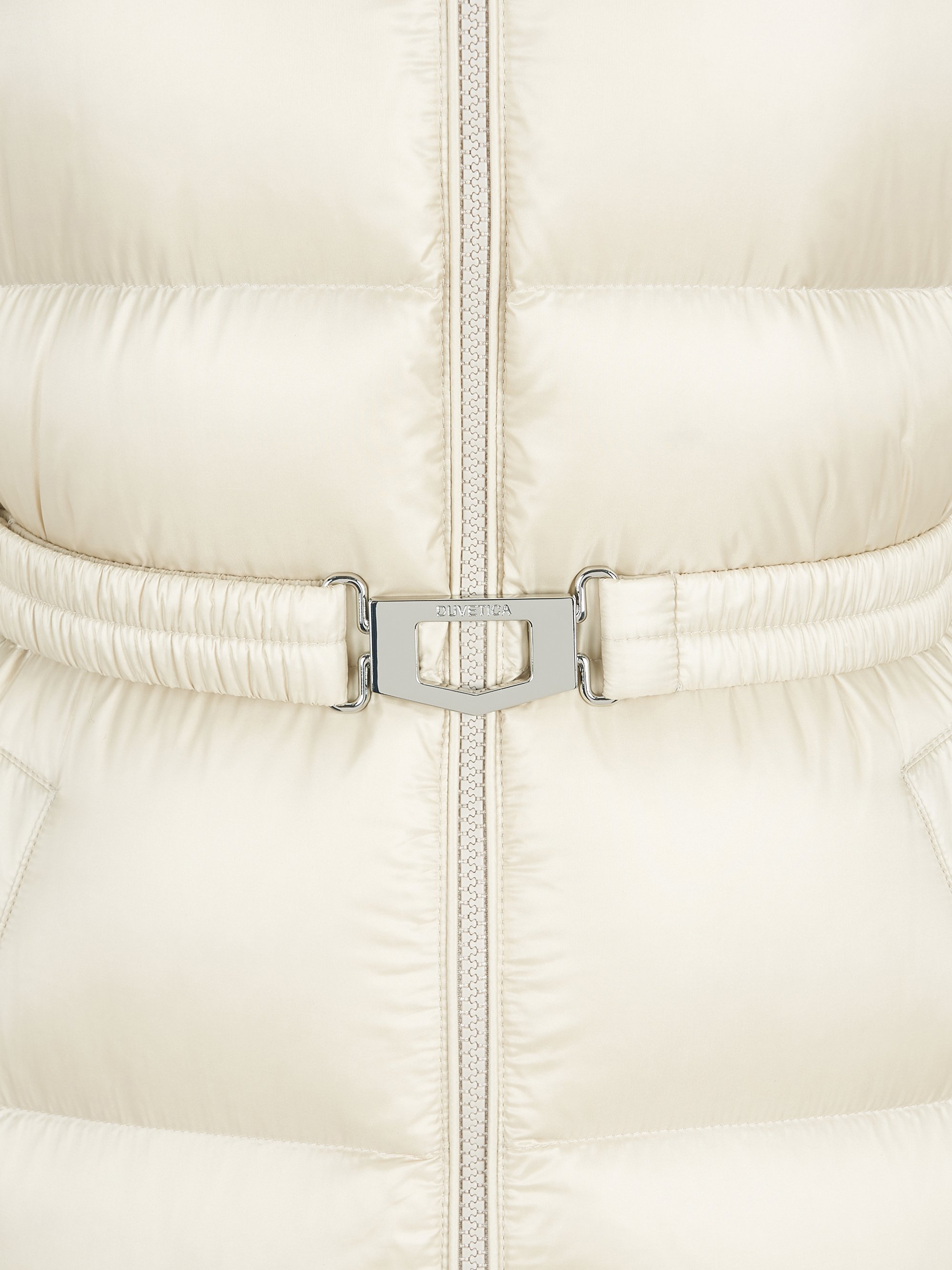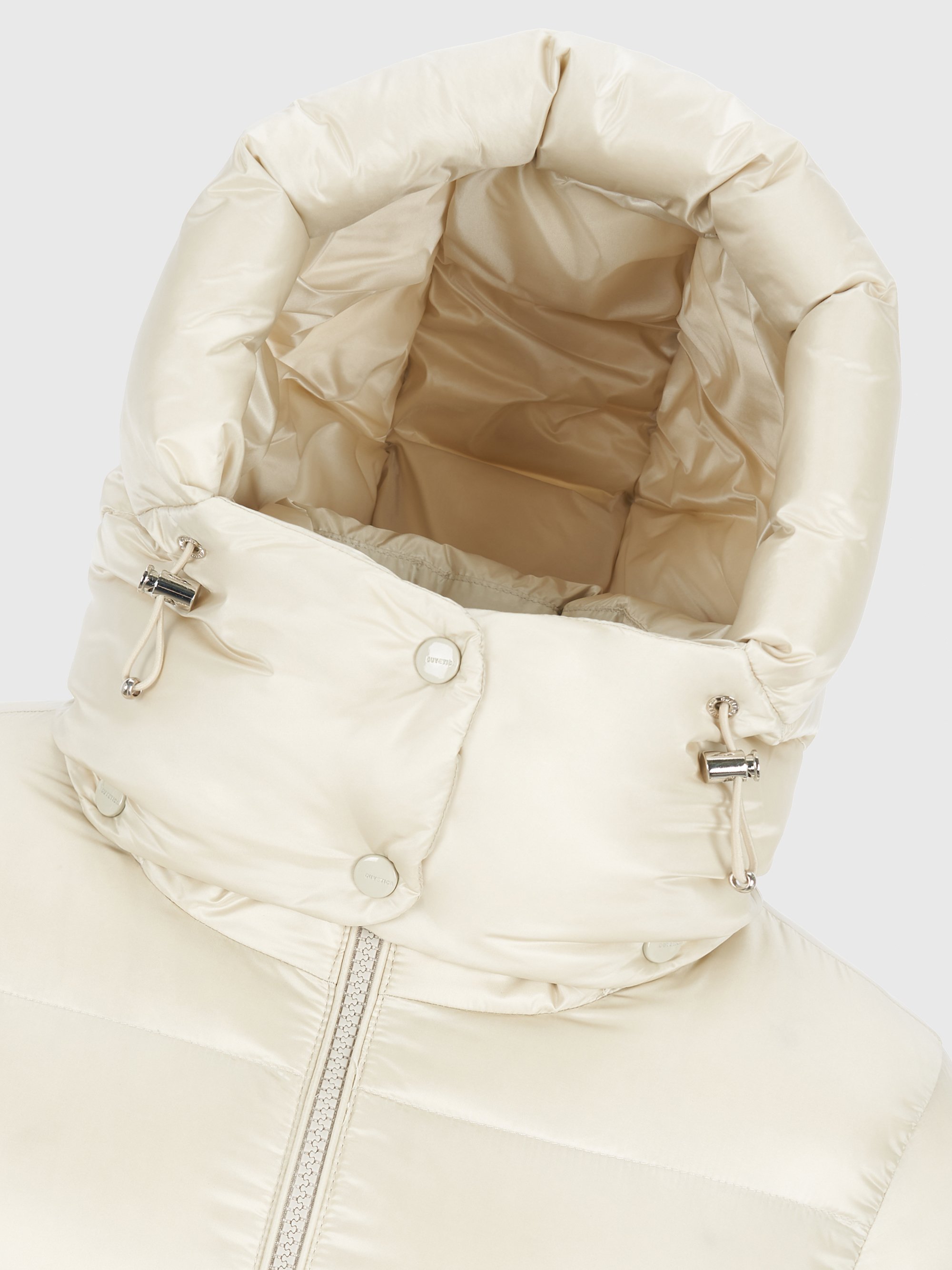 - 페미닌 실루엣과 은은한 반광 소재의 조화가 돋보이는 롱기장 다운 자켓
