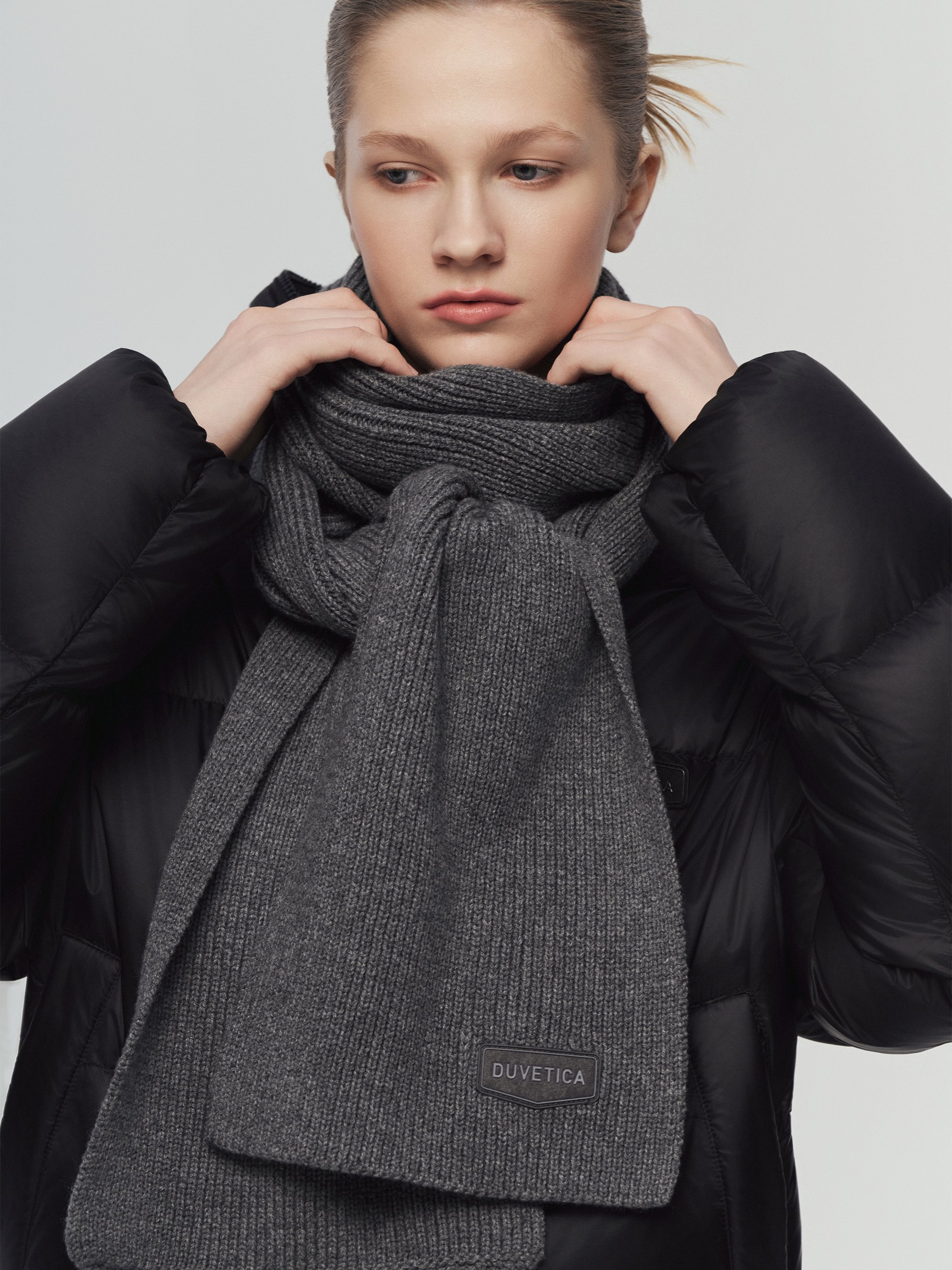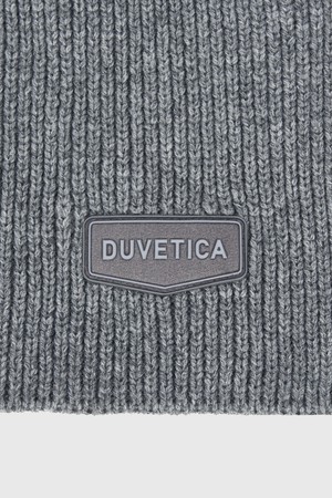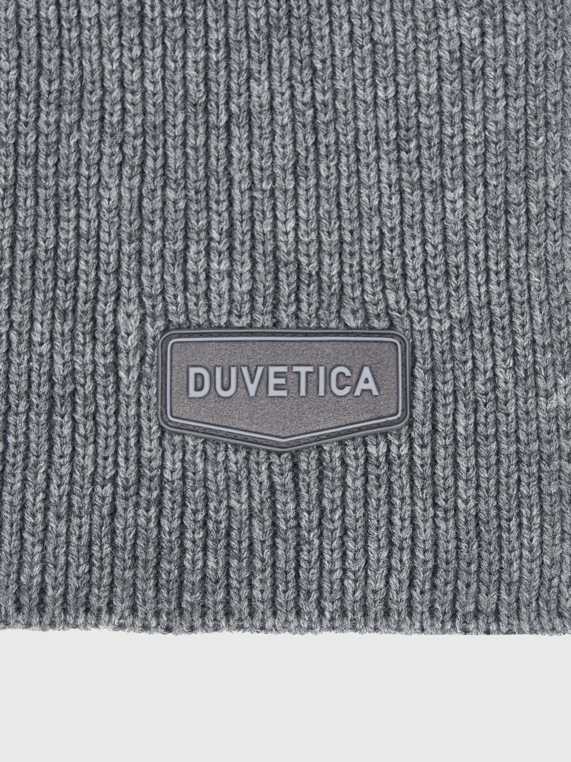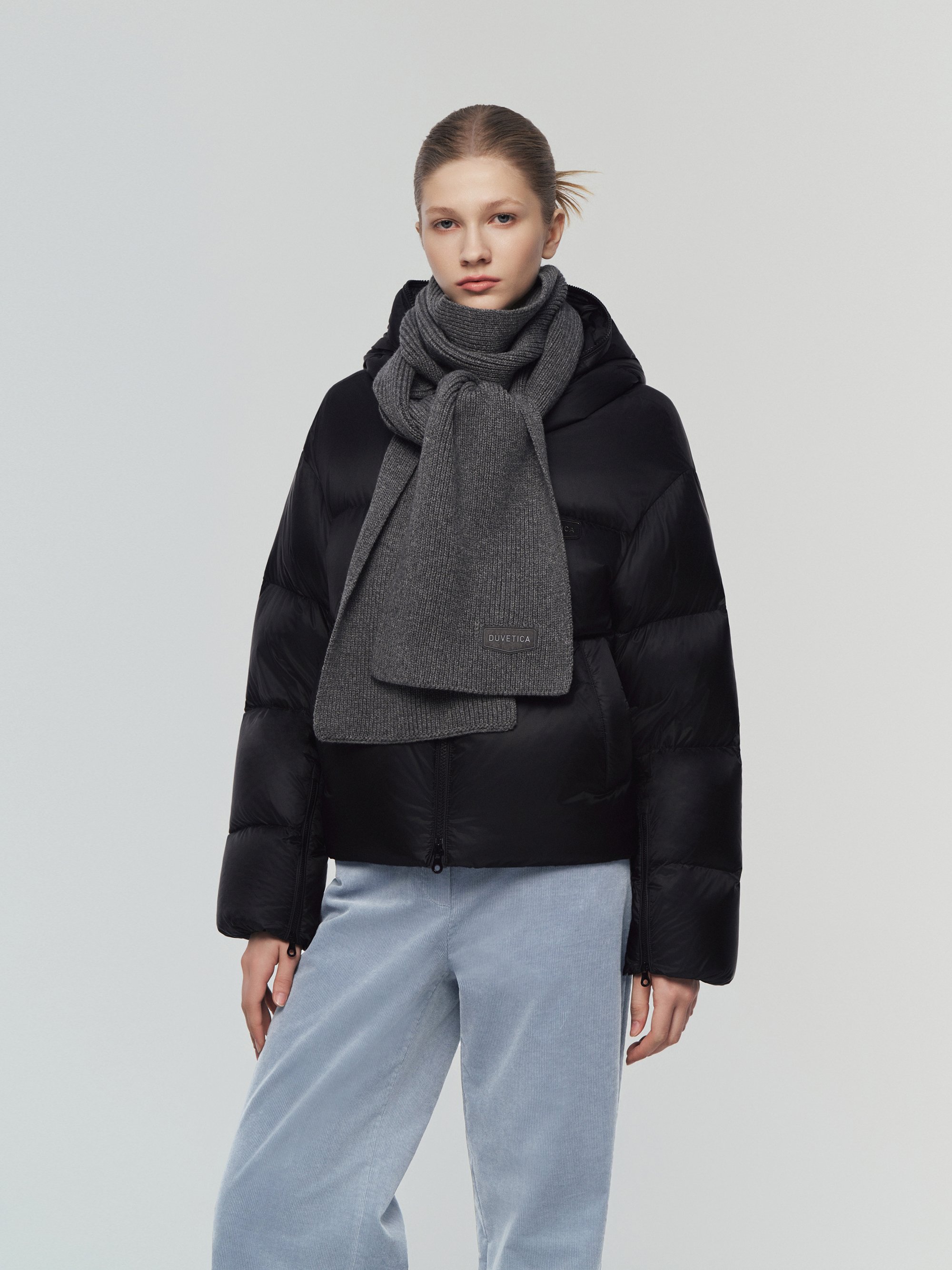 - 끝단에 위치한 톤온톤 DUVETICA 오각로고 와펜으로 브랜딩 포인트 강조