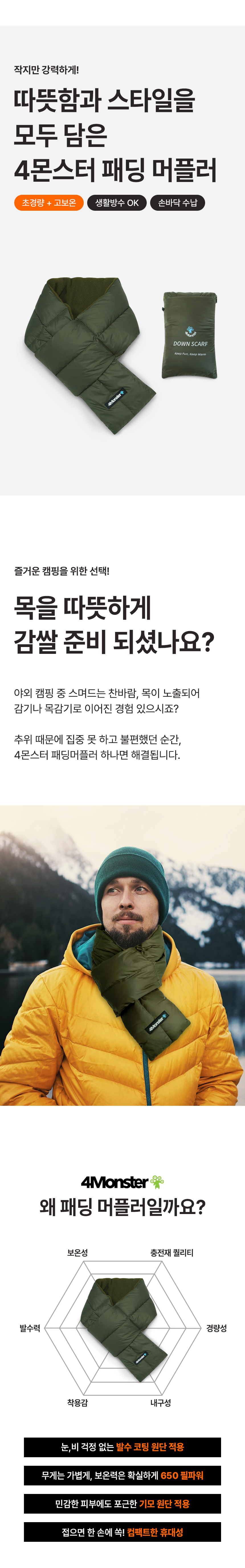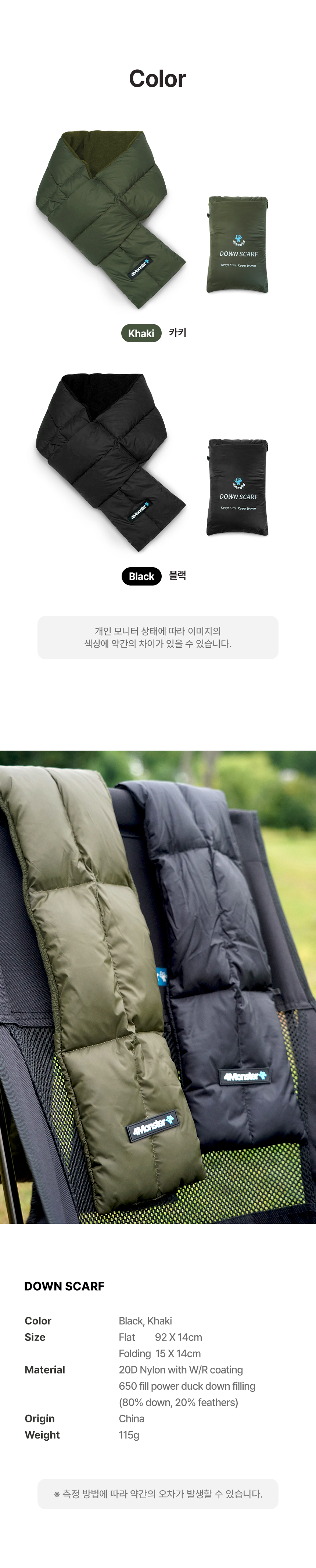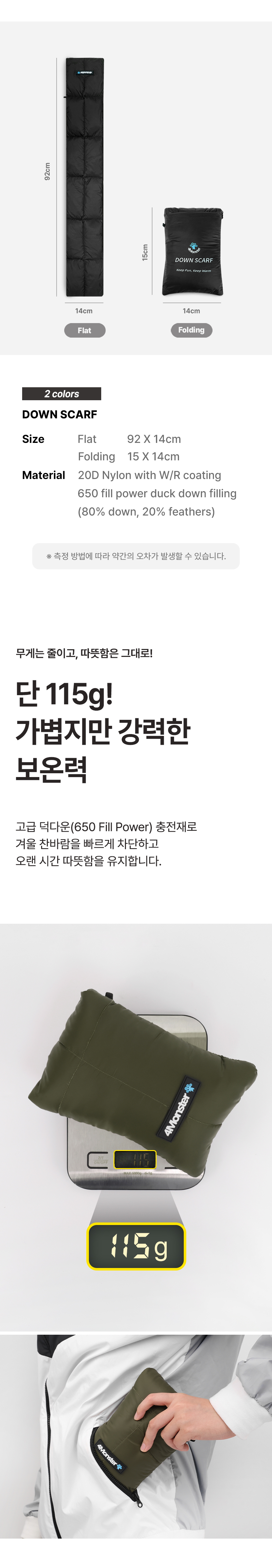 | 재질 | (겉감) 20D Nylon with W/R coating / (충전재) 650 fill power duck down filling (80% down, 20% feathers) |