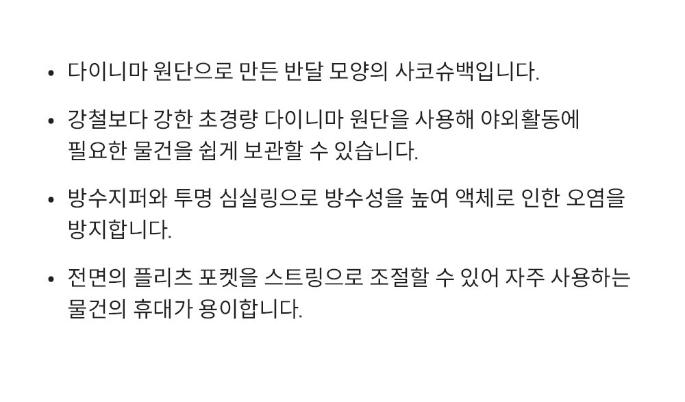 | 소재 | 겉감: Polyethylene Fiber 100% 코팅 : Polyester 100% 매쉬: Polyester 100% |