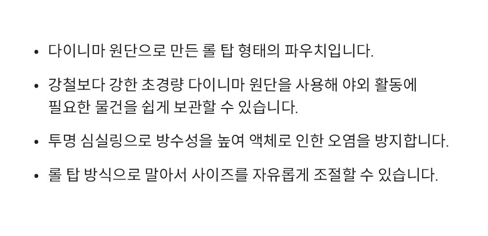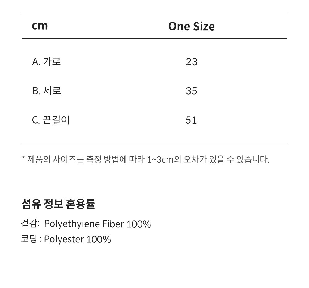 | 소재 | 겉감: Polyethylene Fiber 100% 코팅 : Polyester 100% |