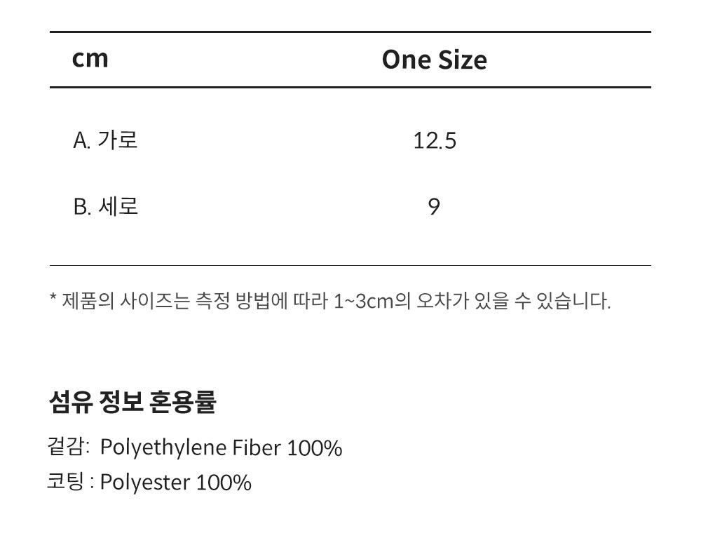 | 소재 | 겉감: Polyethylene Fiber 100% 코팅 : Polyester 100% |
