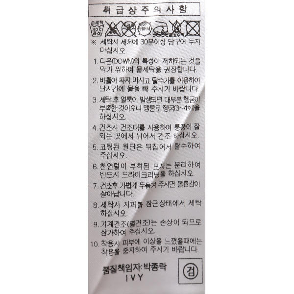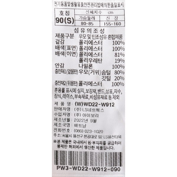 | 소재 | 겉감: 폴리에스터 100% / 배색표면 : 폴리에스터 100% / 배색이면 : 폴리에스터 81% 폴리우레탄 19% / 안감: 나일론 100% / 충전재1(앞몸판): 우모(거위) 솜털 80% 깃털 20% / 충전재2(뒤몸판): 폴리에스터 100% |