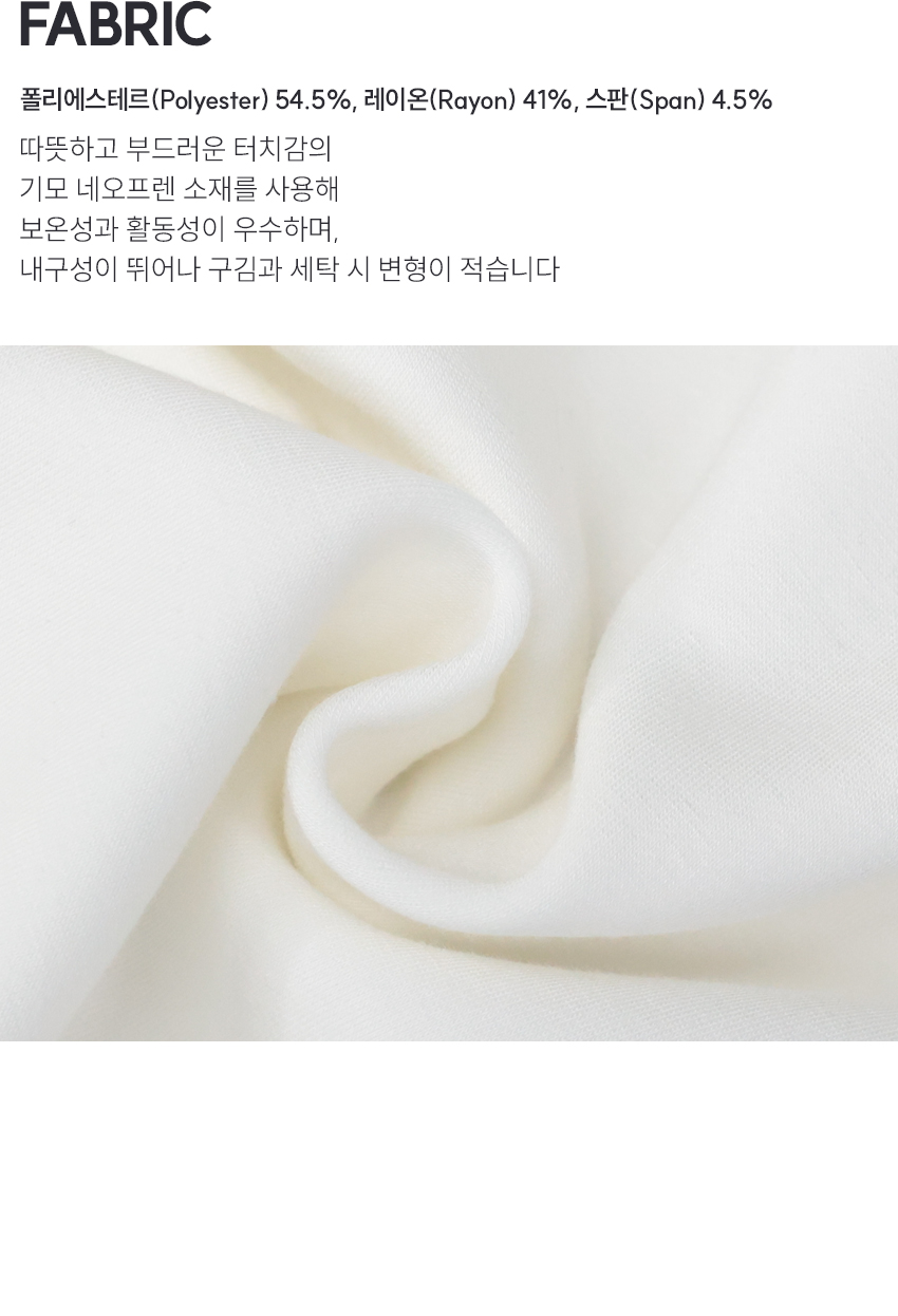 | 소재 | 폴리에스테르 54.5% + 레이온 41% + 스판 4.5% |