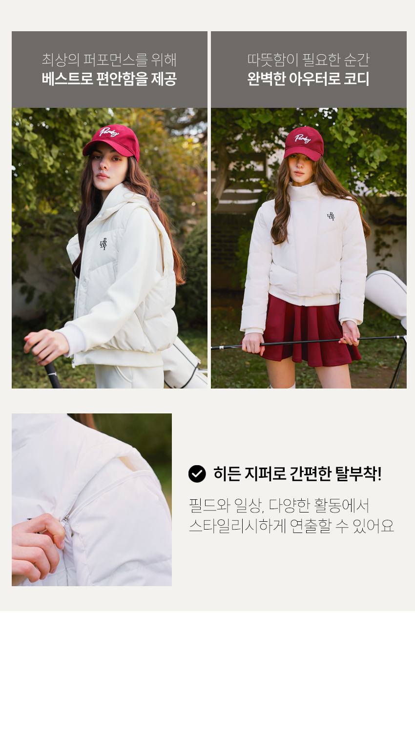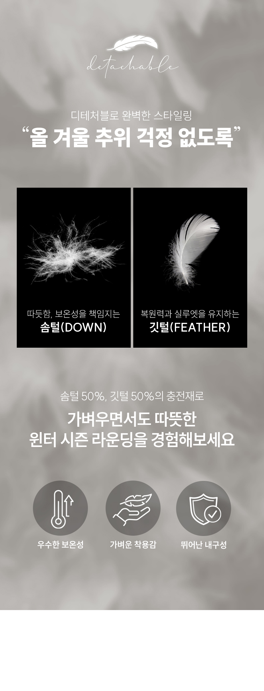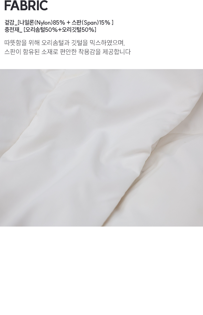 | 소재 | 나일론85%+스판15% / 충전재_오리솜털50%+오리깃털50% |
