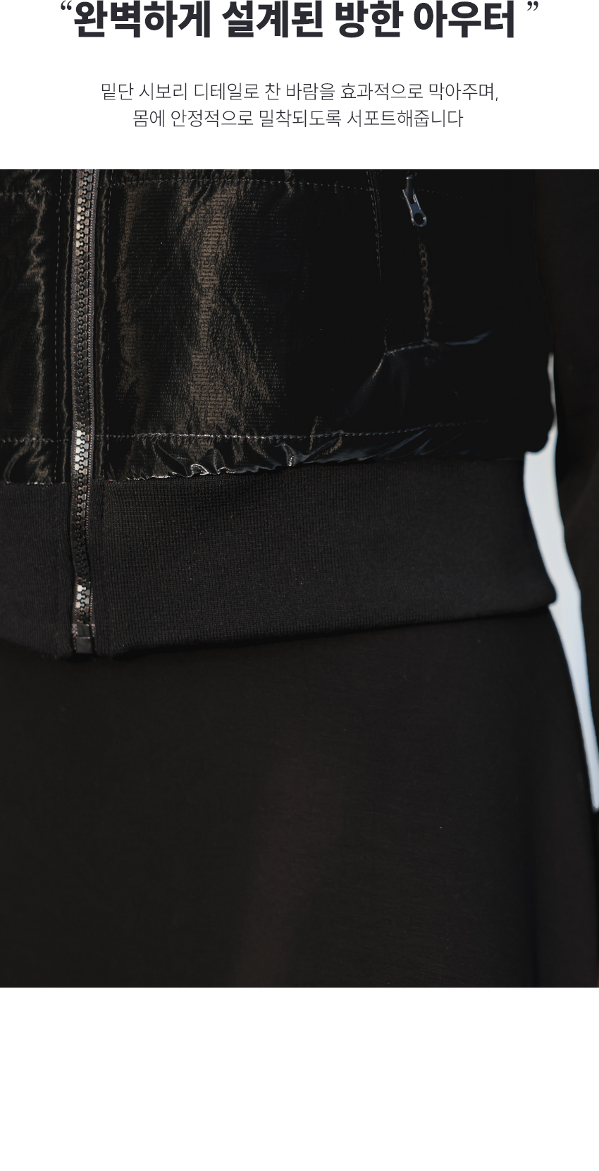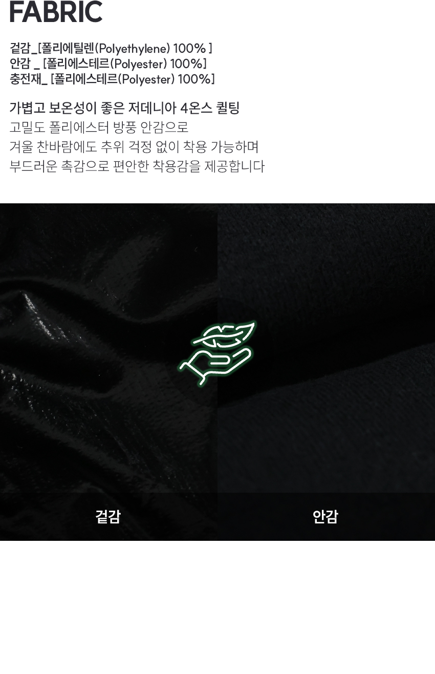 | 소재 | 겉감_폴리에틸렌 100% / 안감_폴리에스테르 100% / 충전재_ 폴리에스테르 100% / *방풍안감입니다 |