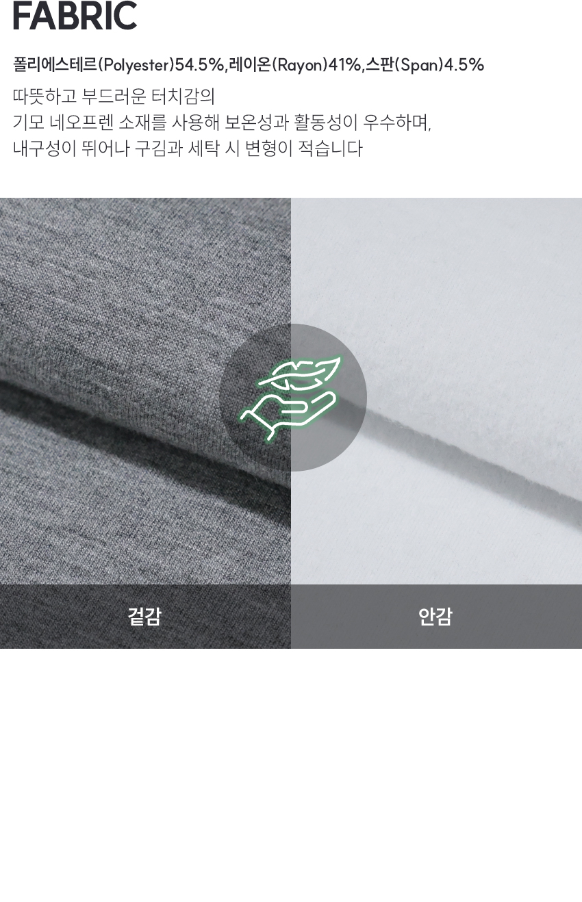 | 소재 | 폴리에스테르 54.5% + 레이온 41% + 스판 4.5% |