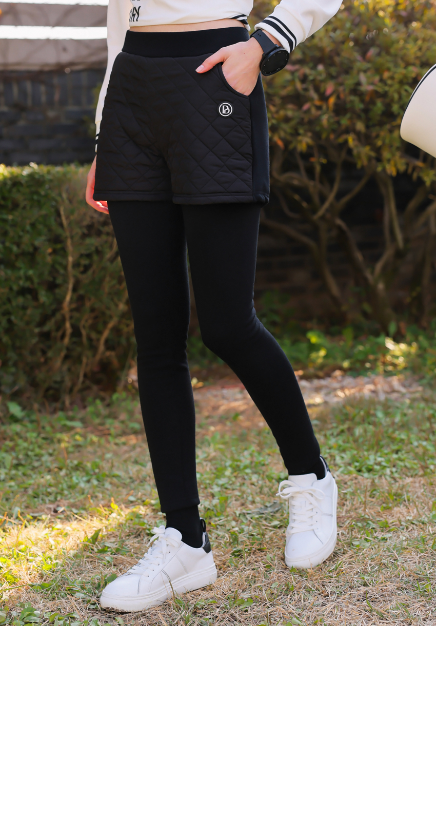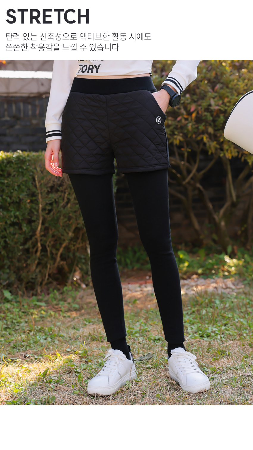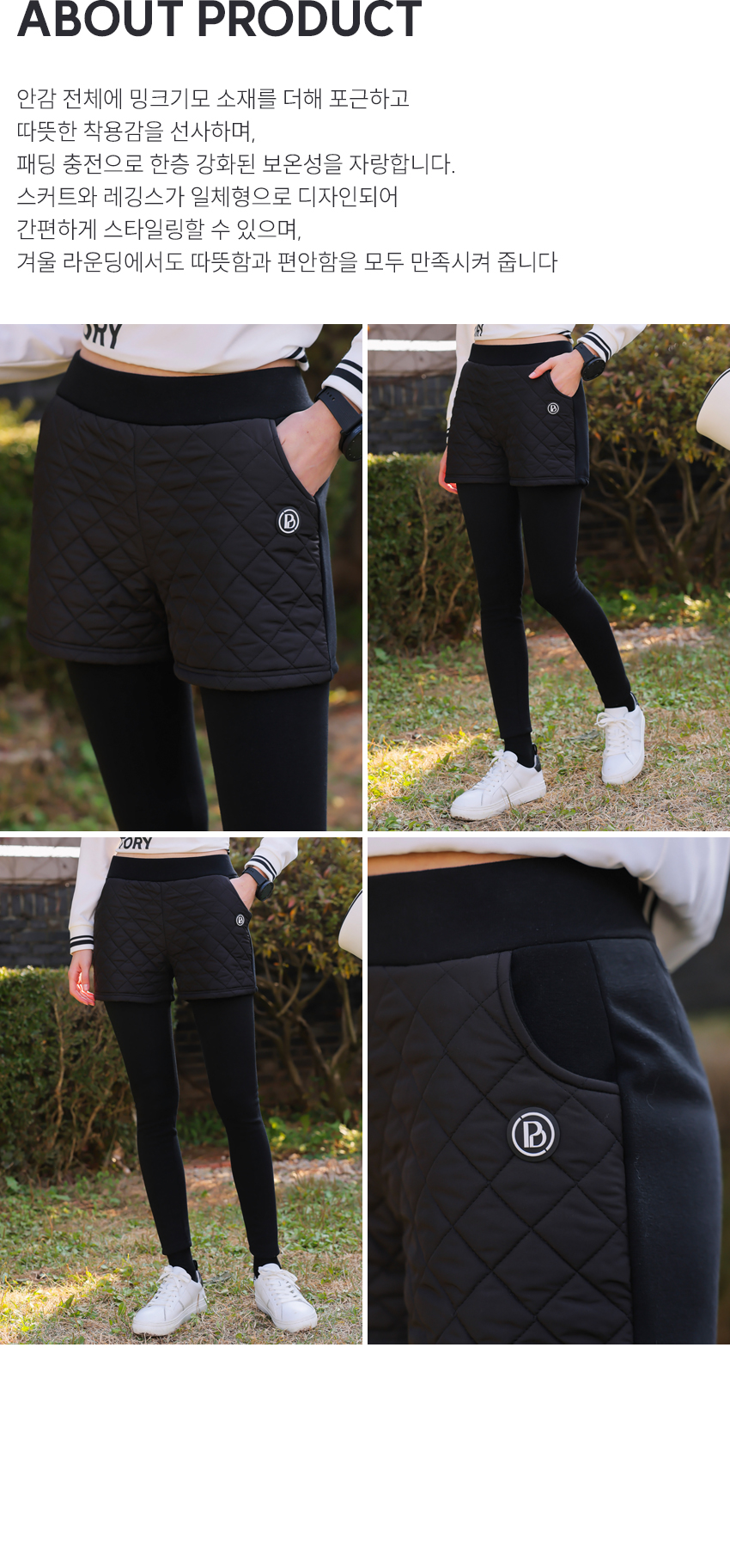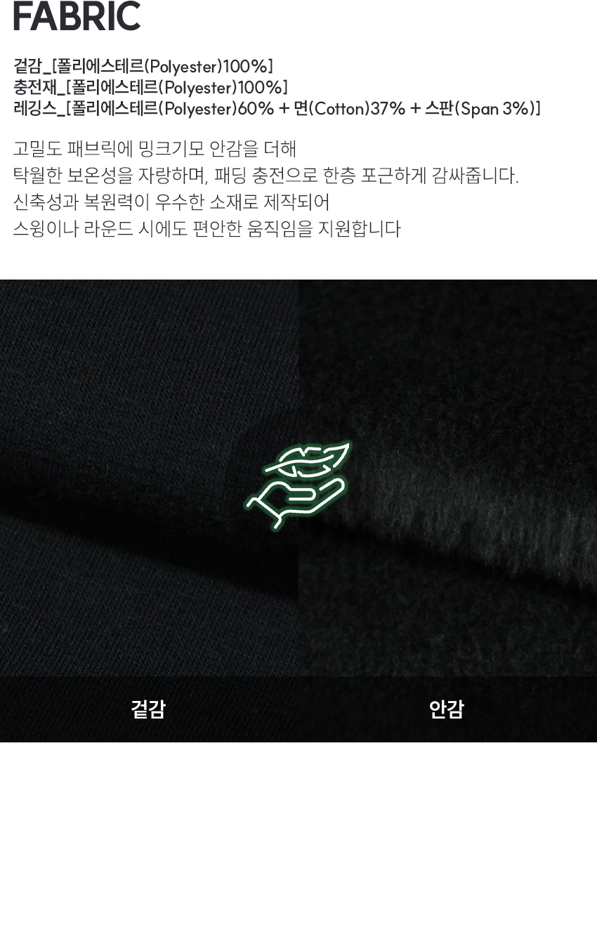 | 소재 | 팬츠 겉감_폴리에스테르100% / 충전재_폴리에스테르100% 레깅스_폴리에스테르60% + 면37% + 스판 3% |