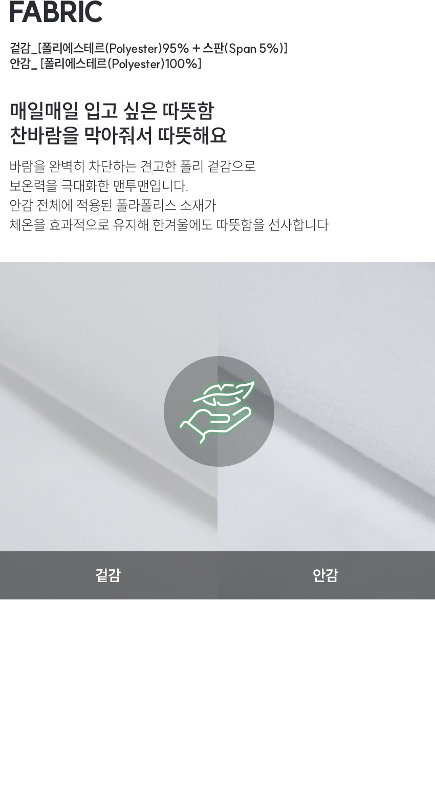 | 소재 | 겉감_폴리에스테르 95% + 스판 5% 안감_폴리에스테르 100% / *폴라폴리스 안감입니다 |