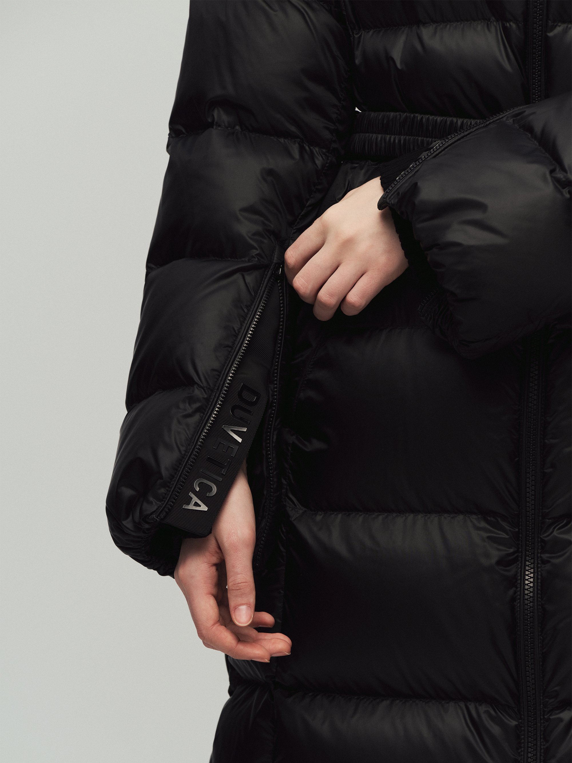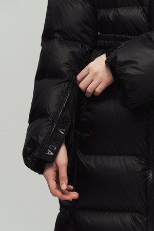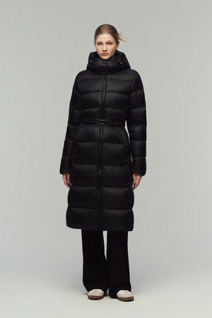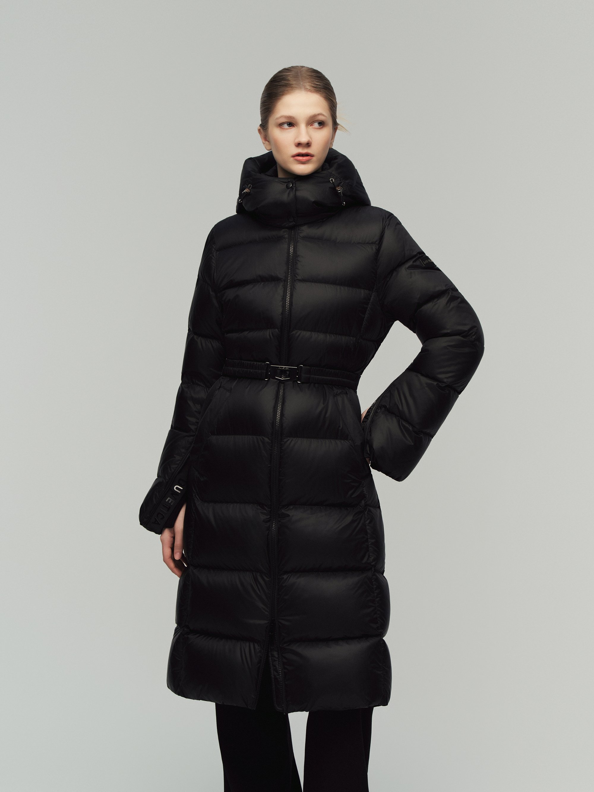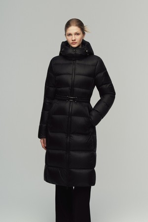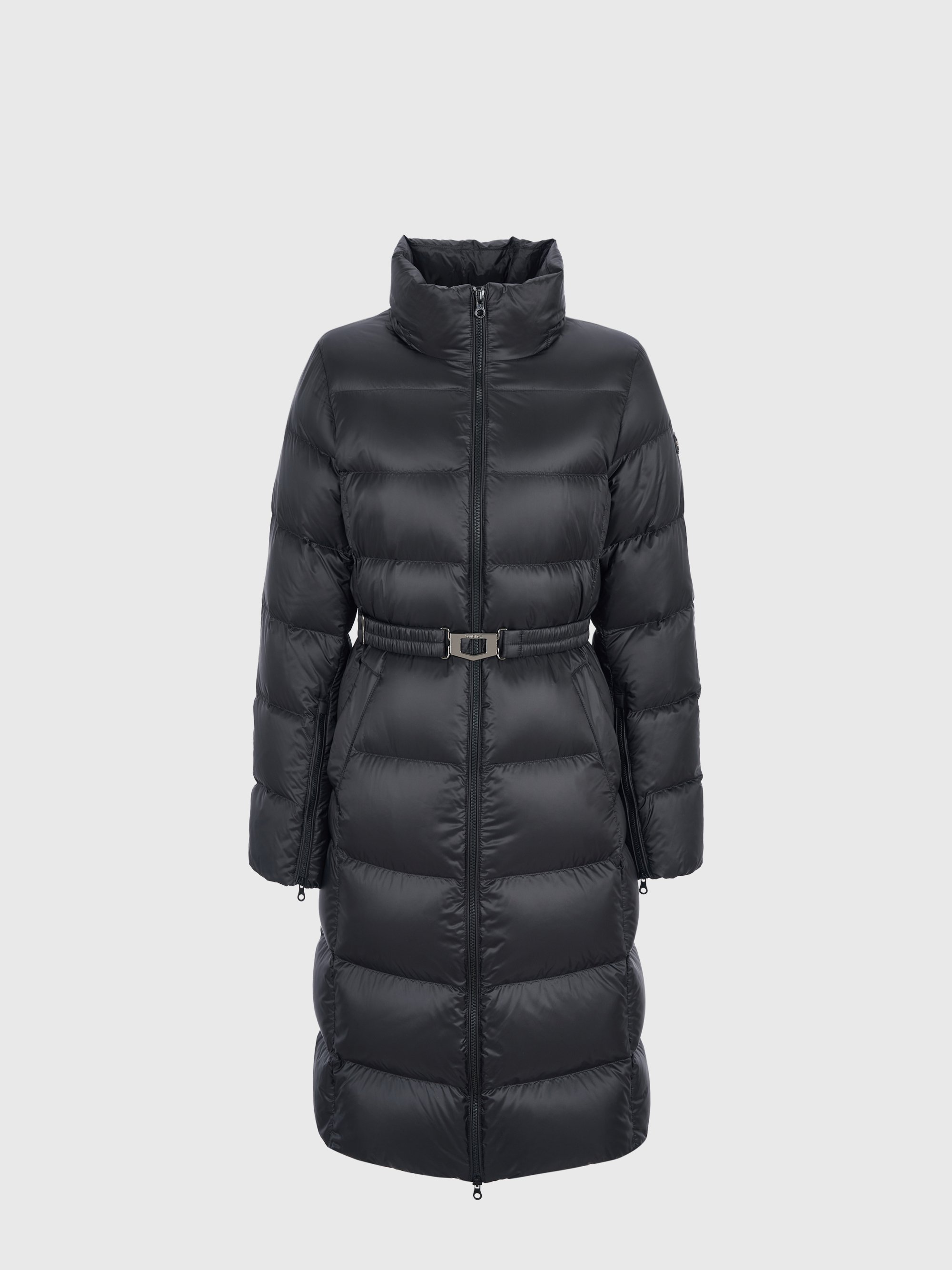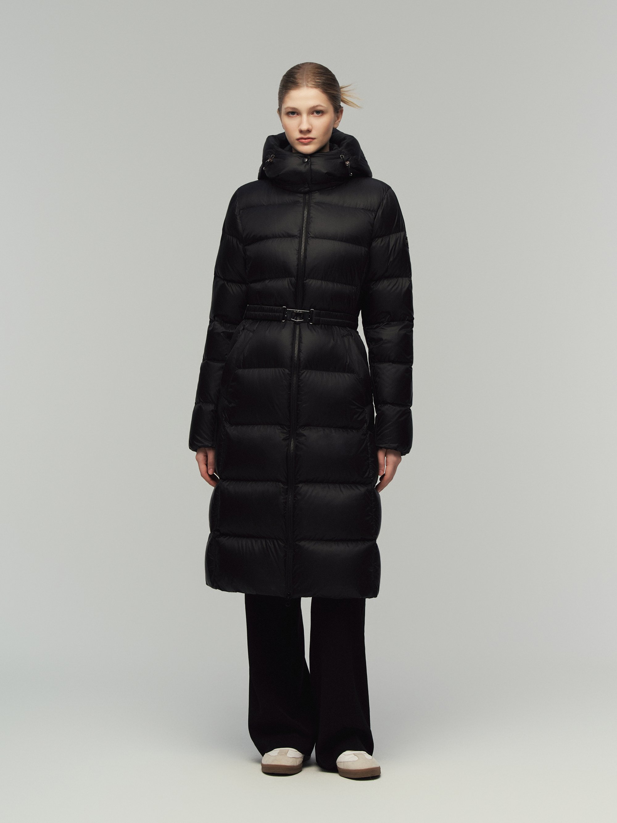 - 페미닌 실루엣과 은은한 반광 소재의 조화가 돋보이는 롱기장 다운 자켓