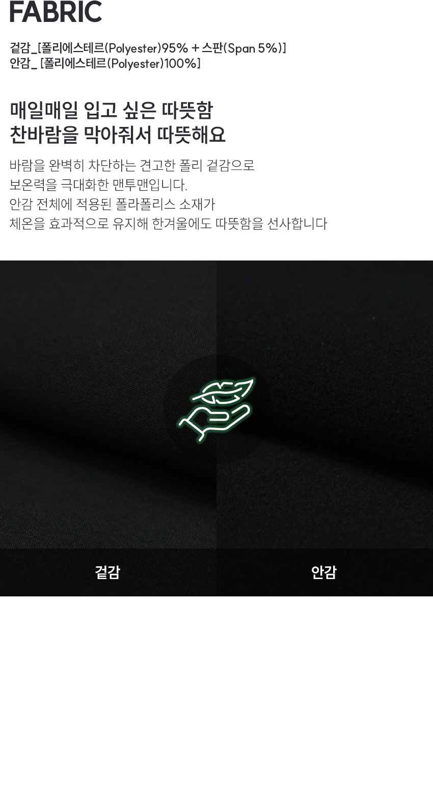 | 소재 | 겉감_폴리에스테르 95% + 스판 5% 안감_폴리에스테르 100% / *폴라폴리스 안감입니다 |