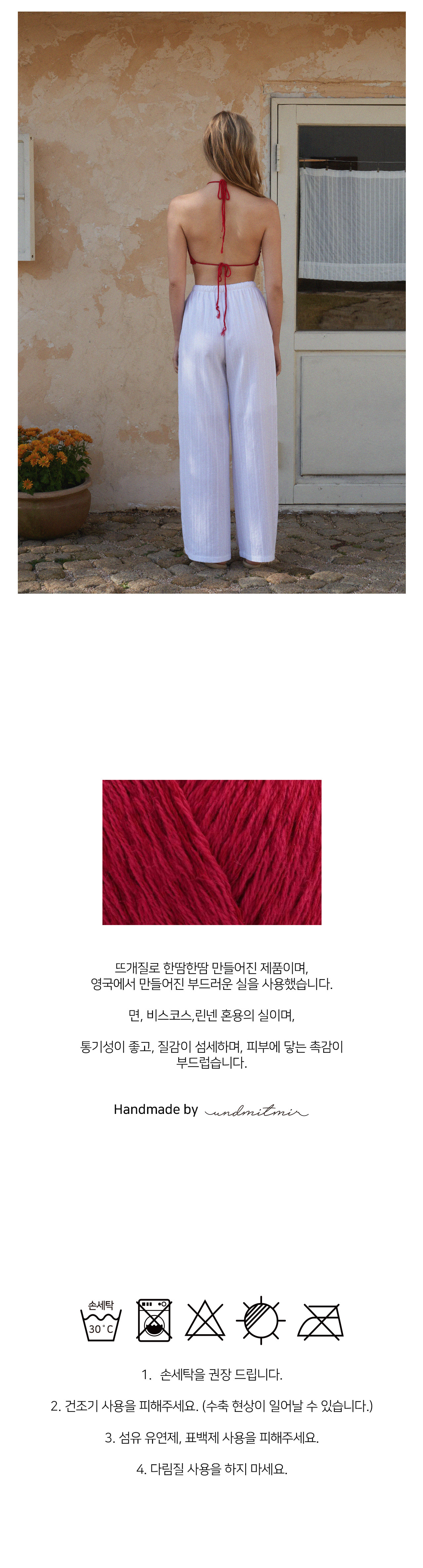| 세탁방법 및 취급시 주의사항 | 1. 손세탁을 권장 드립니다. 2. 건조기 사용을 피해주세요. (수축 현상이 일어날 수 있습니다.) 3. 섬유 유연제, 표백제 사용을 피해주세요. 4. 다림질 사용을 하지 마세요. |