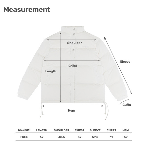 | 치수 | <MEASUREMENT> F LENGTH 69CM SHOULDER 48.5CM CHEST 59CM SLEEVE 59.5CM CUFFS 11CM HEM 59CM |