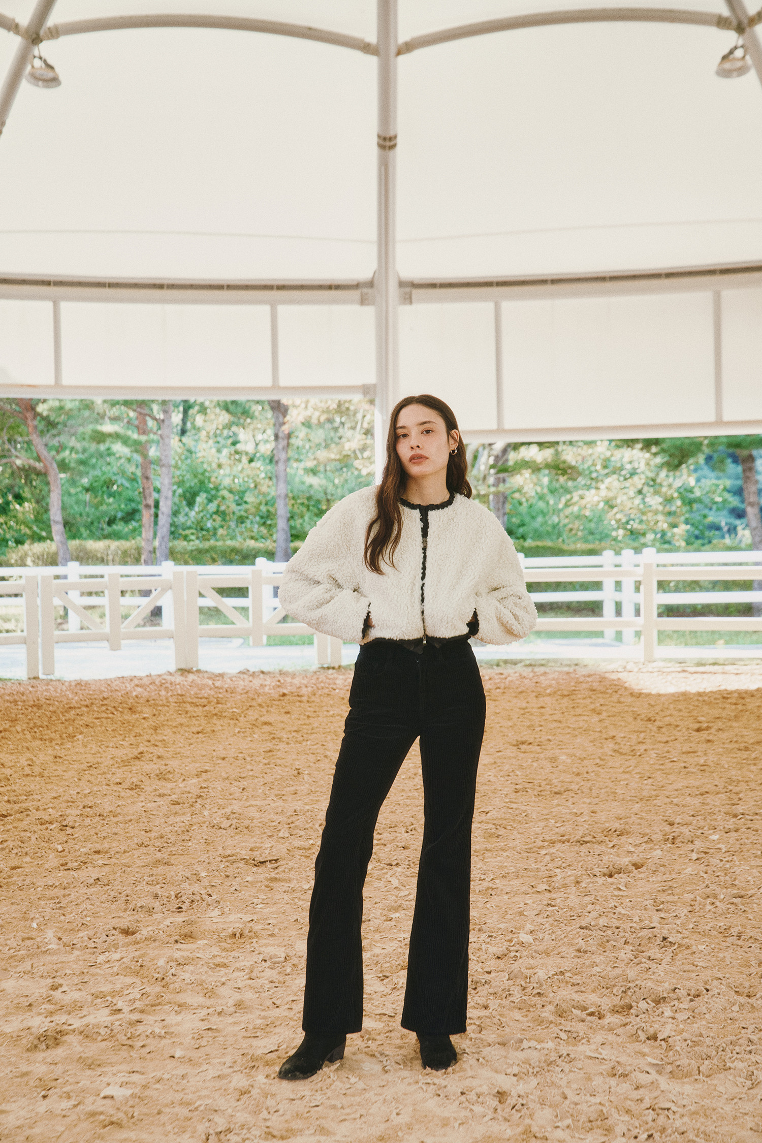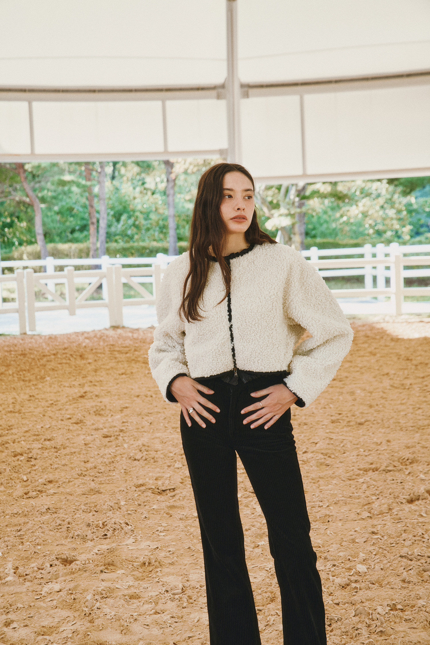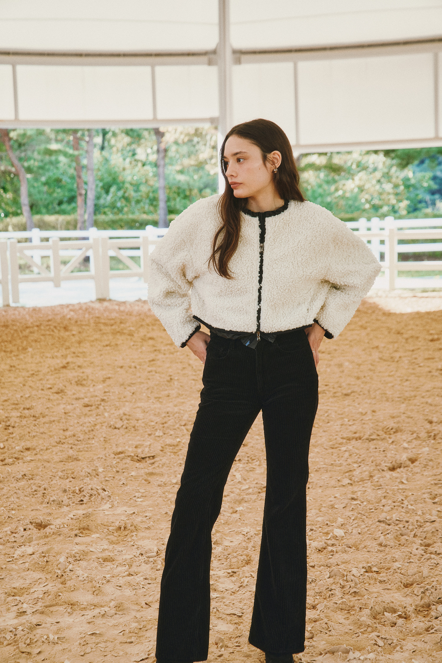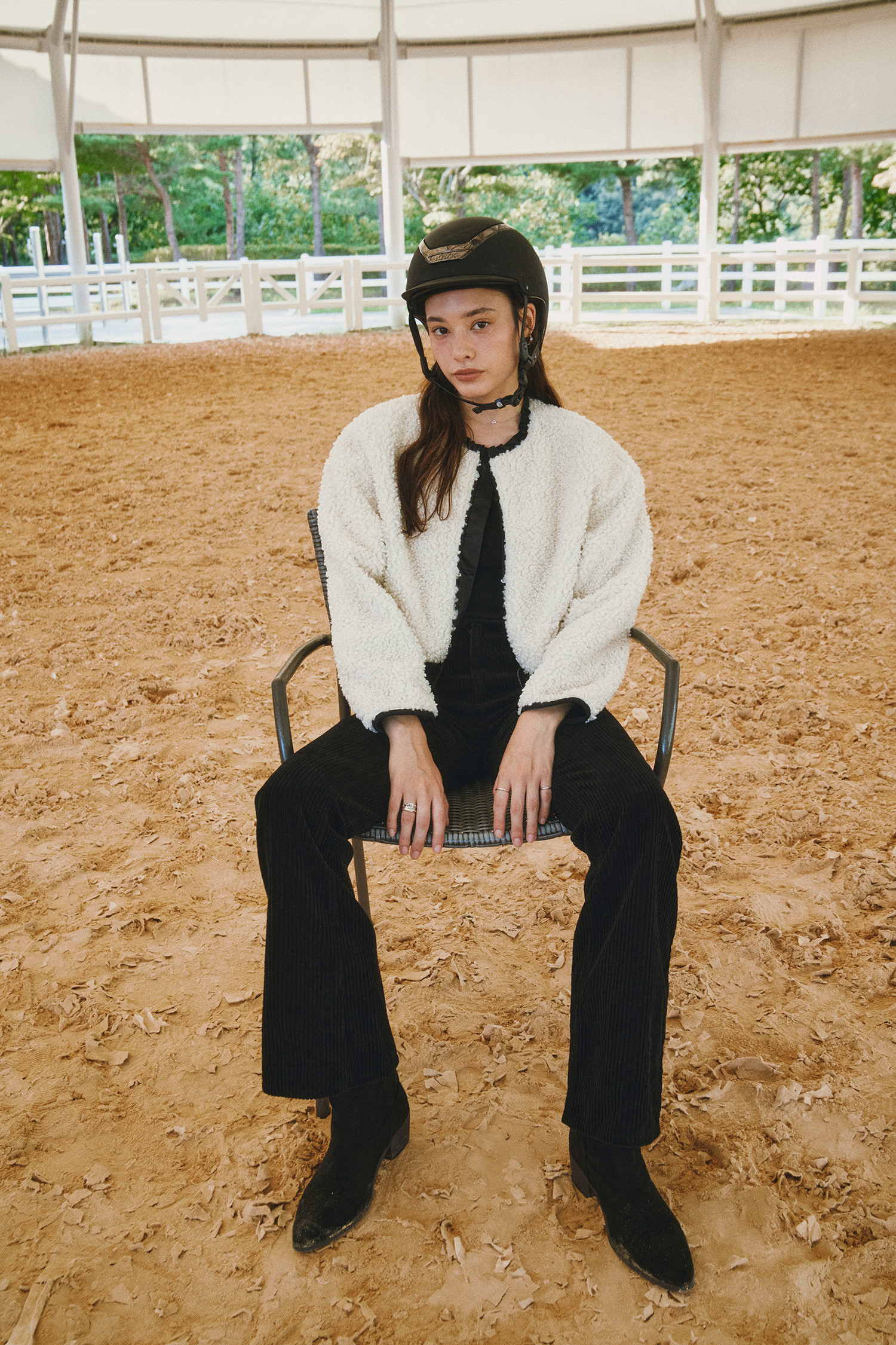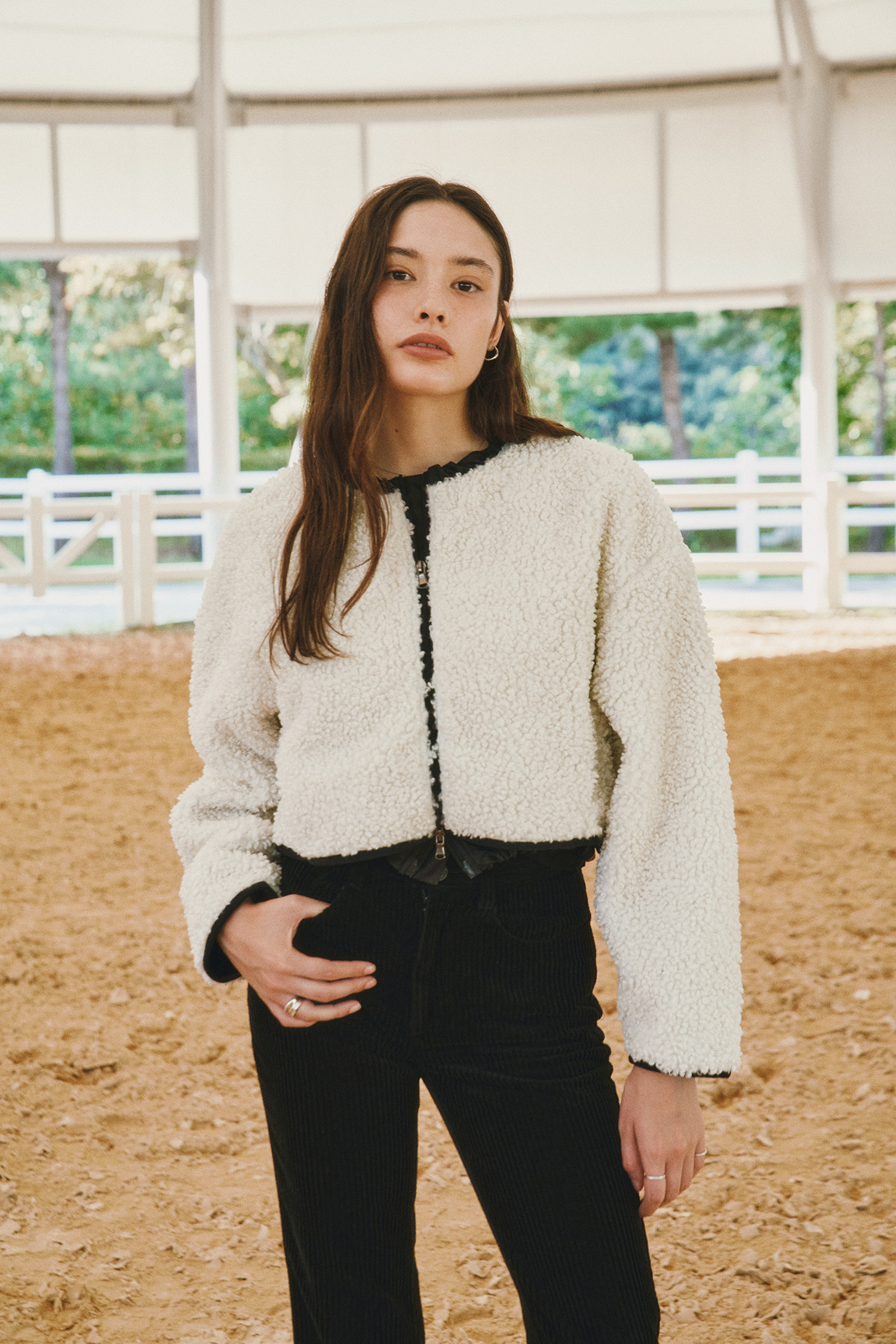 부클 원단과 우븐 원단 배색 조합으로 따뜻하면서 경쾌한 무드 연출