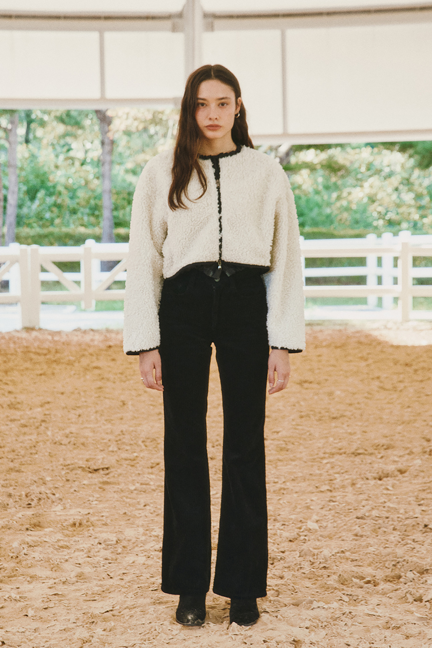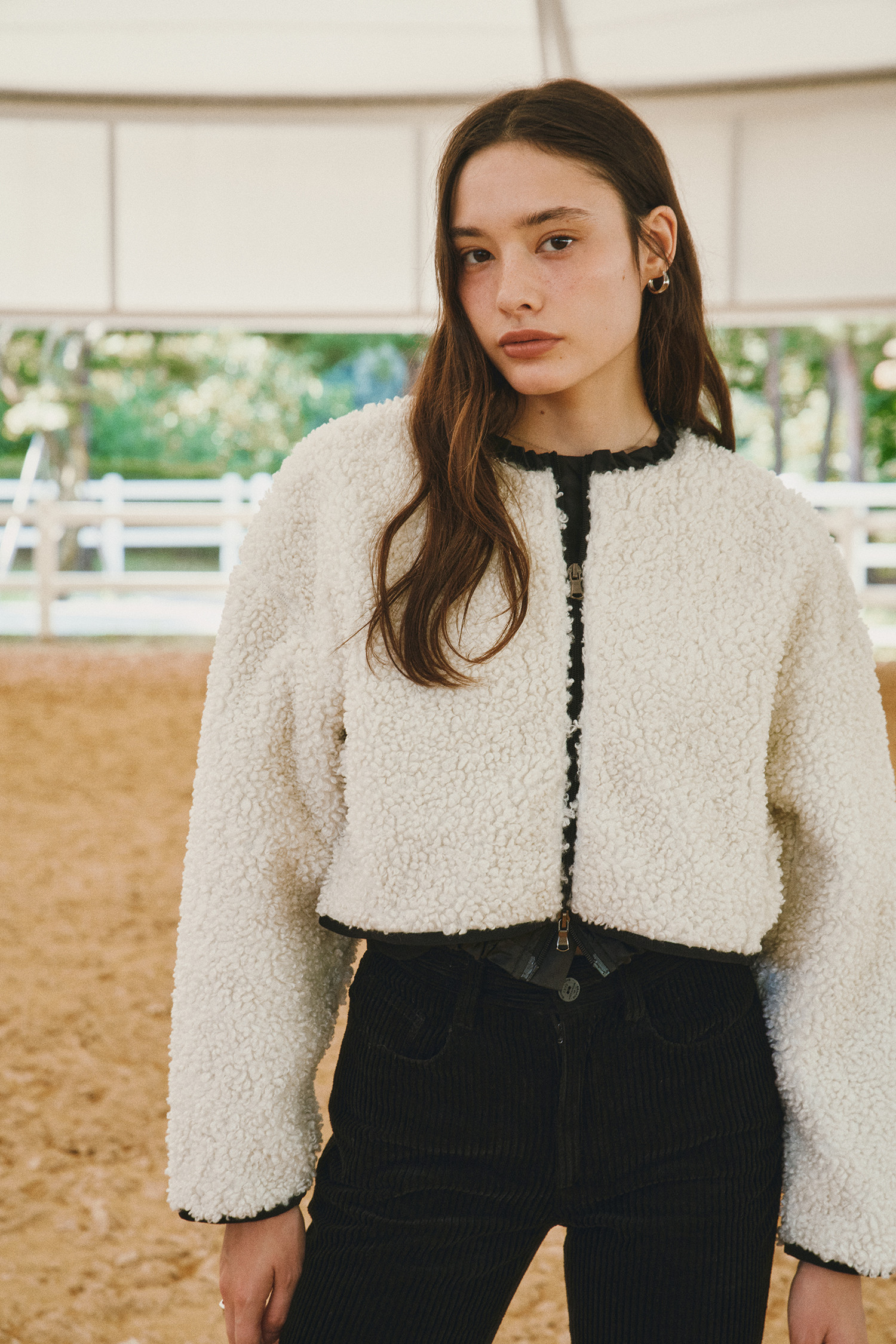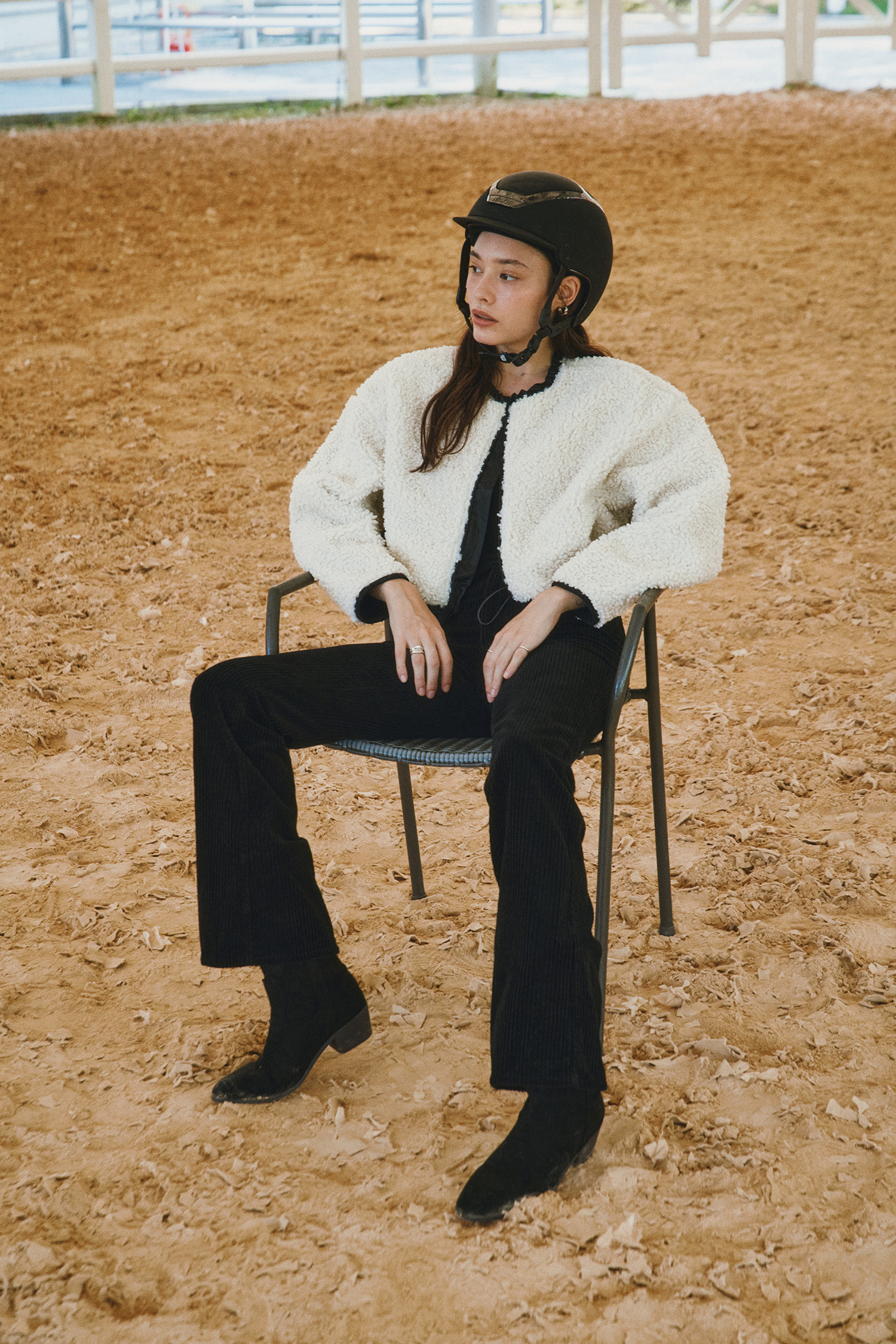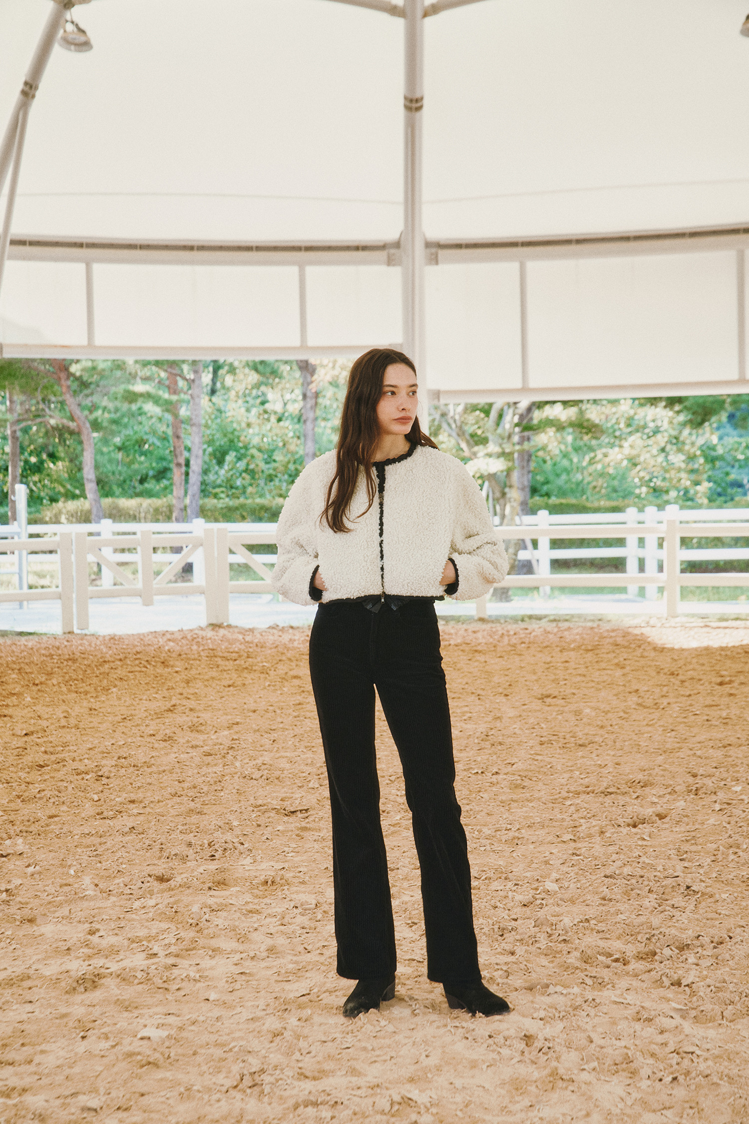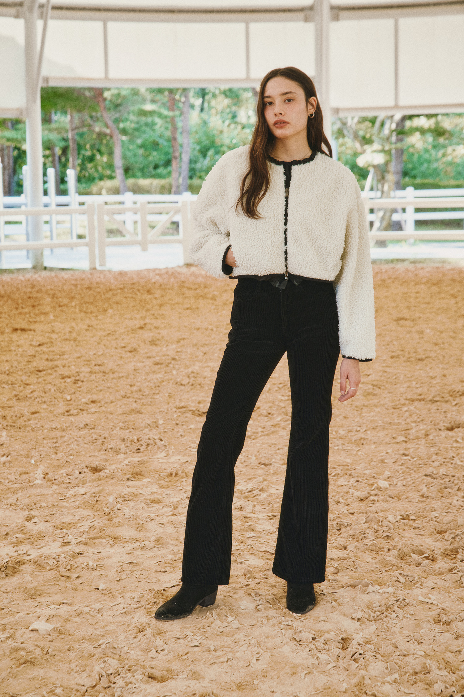 부클 원단과 우븐 원단 배색 조합으로 따뜻하면서 경쾌한 무드 연출