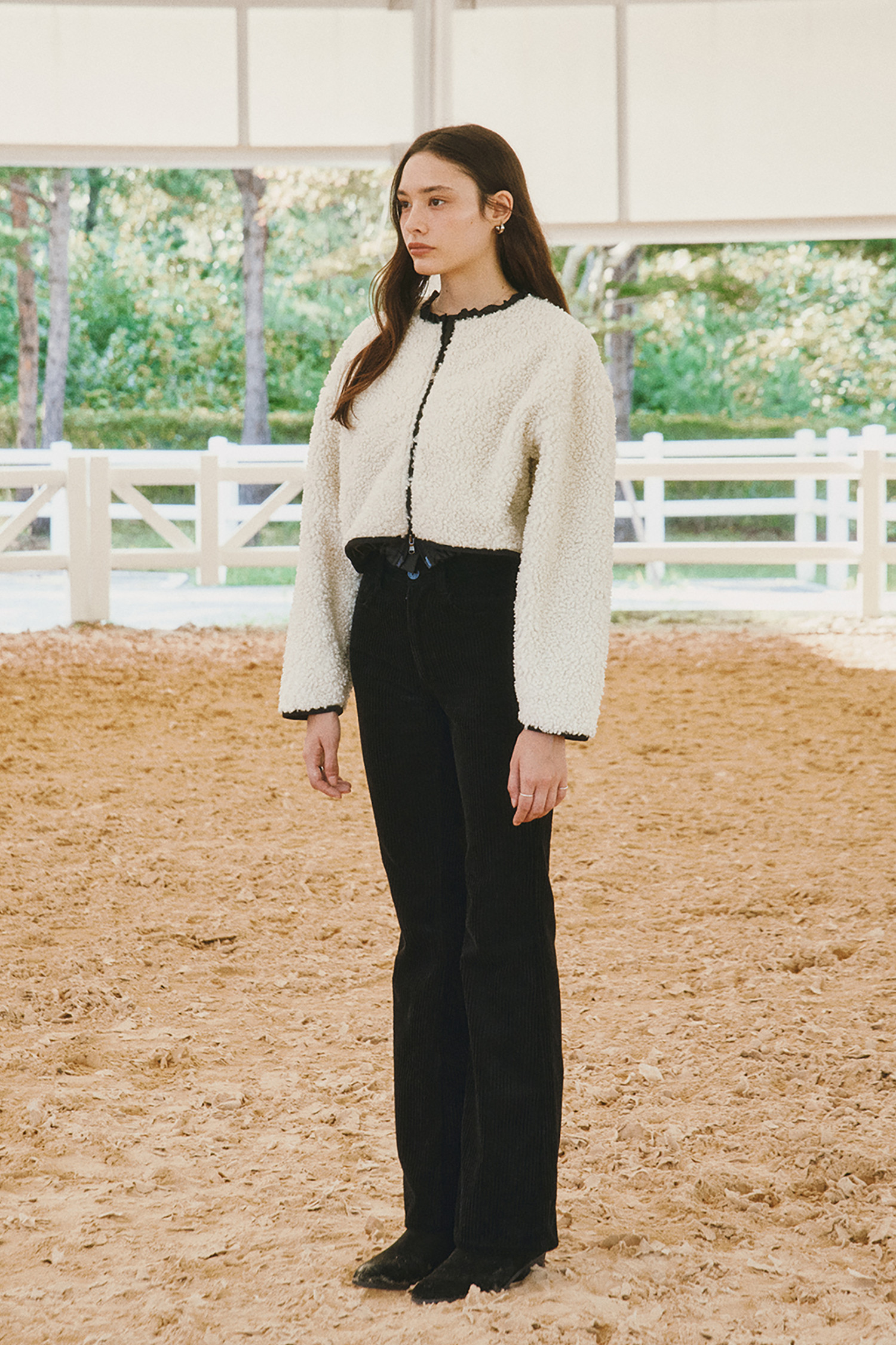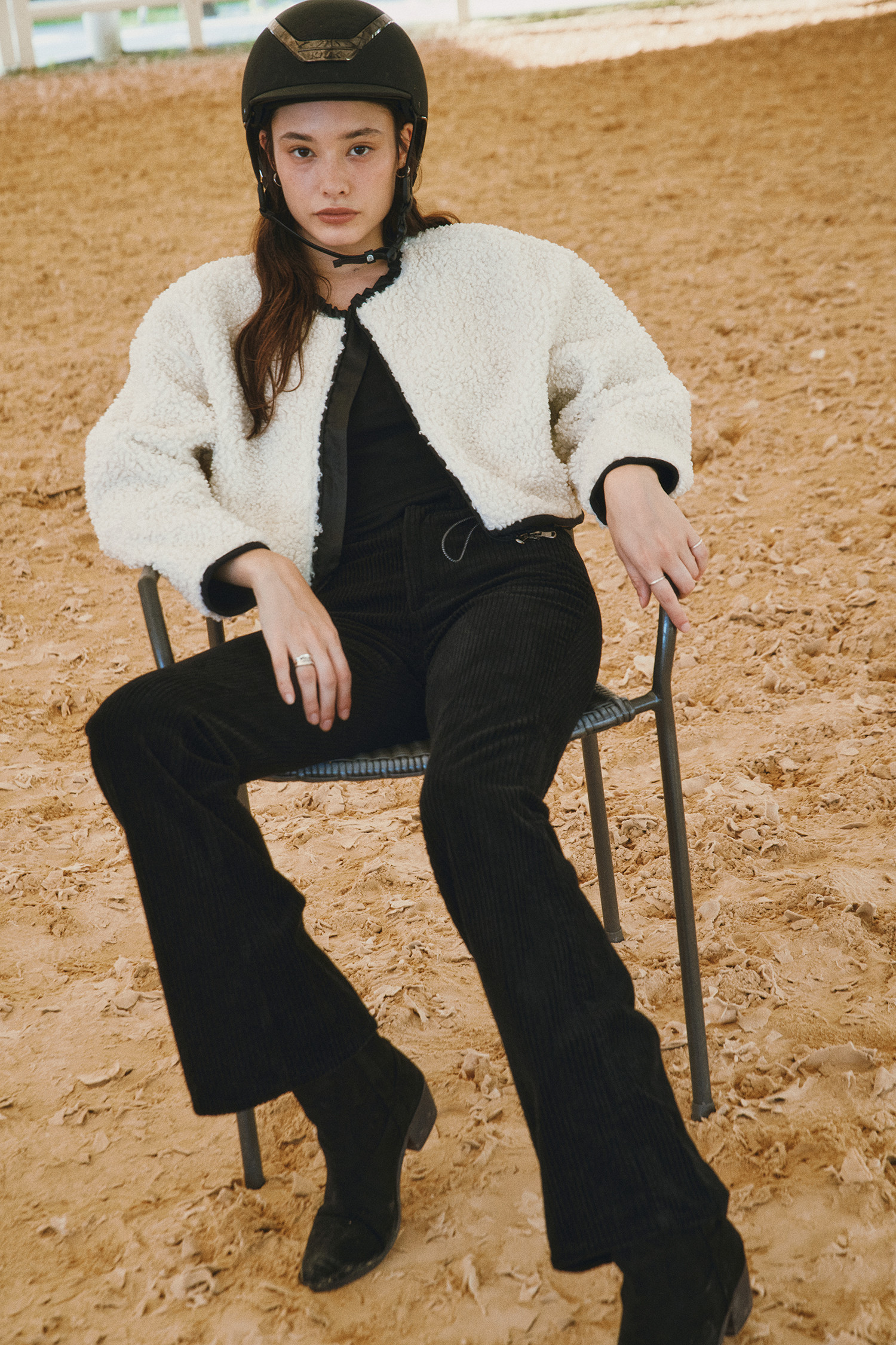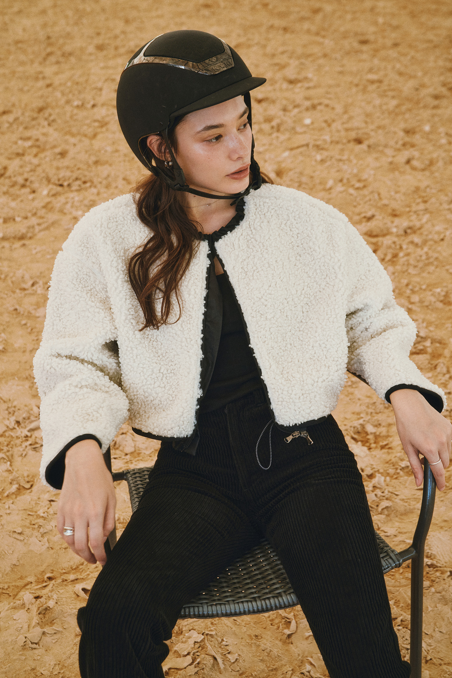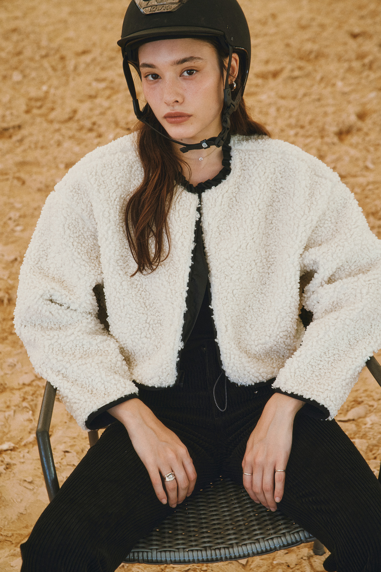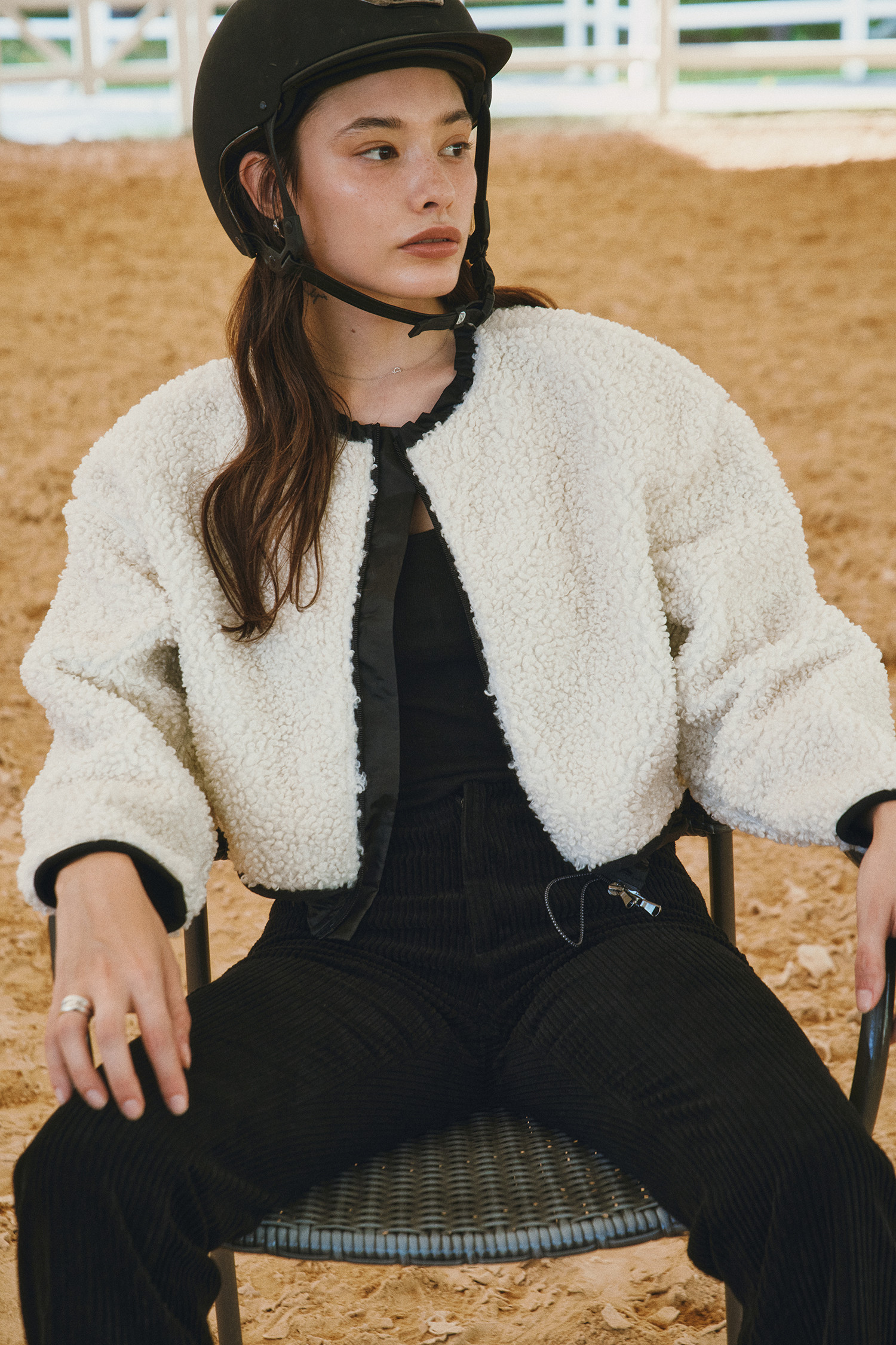 부클 원단과 우븐 원단 배색 조합으로 따뜻하면서 경쾌한 무드 연출