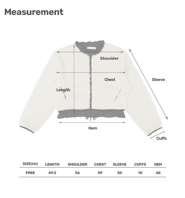 | 치수 | <MEASUREMENT> F LENGTH 49.5CM SHOULDER 56CM CHEST 59CM SLEEVE 50CM CUFFS 10CM HEM 48CM |
