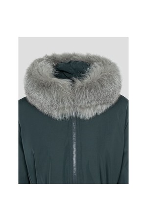 탄탄한 질감과 은은한 광택을 지닌 다운 아우터입니다. 볼륨 있는 하이넥에 탈부착이 가능한 여우털 장식을 덧대 고급스러운 멋을 더했습니다. 누비 디자인이 겉으로 드러나지 않아 코트 같은 분위기로 착용할 수 있습니다.