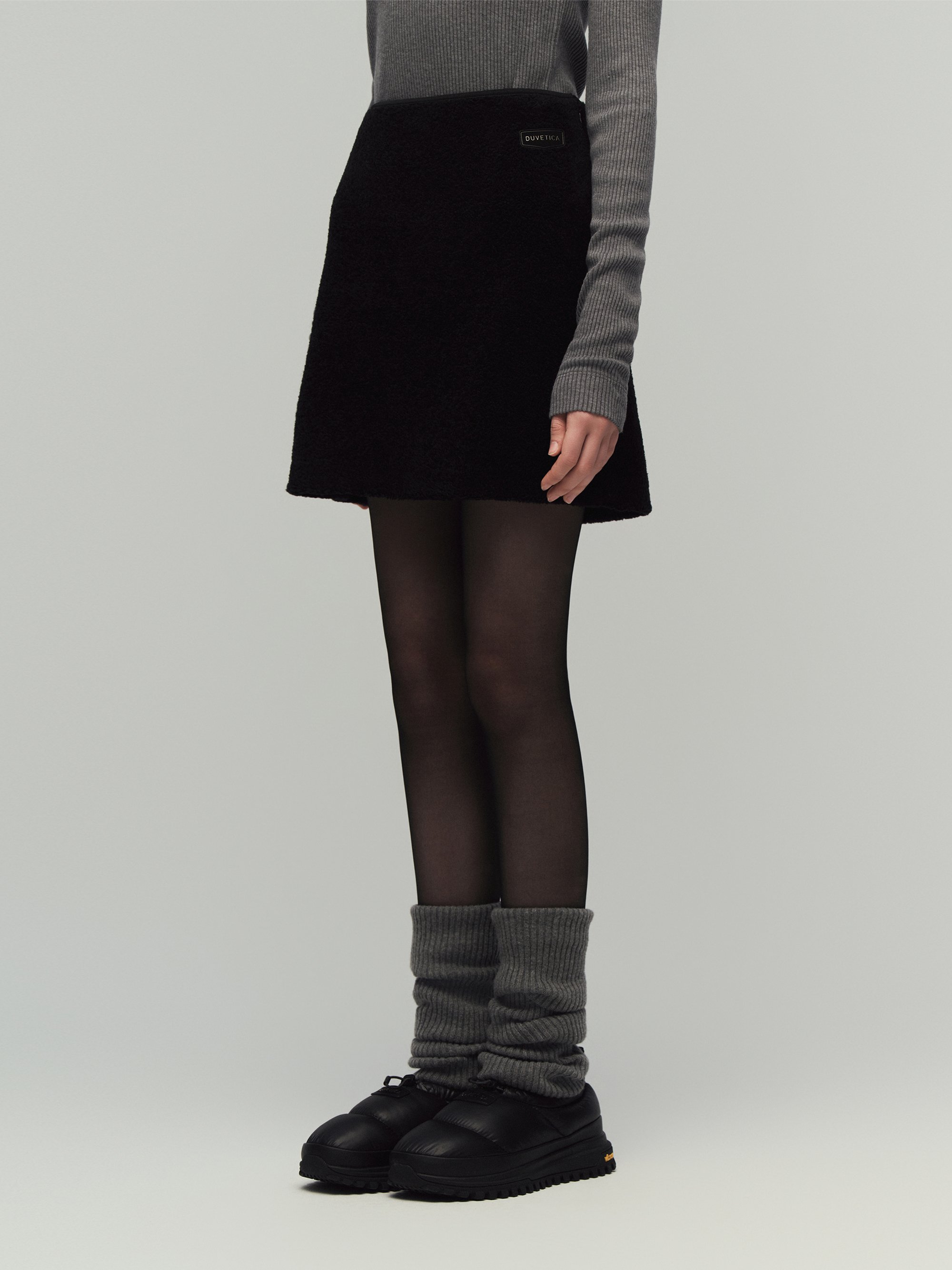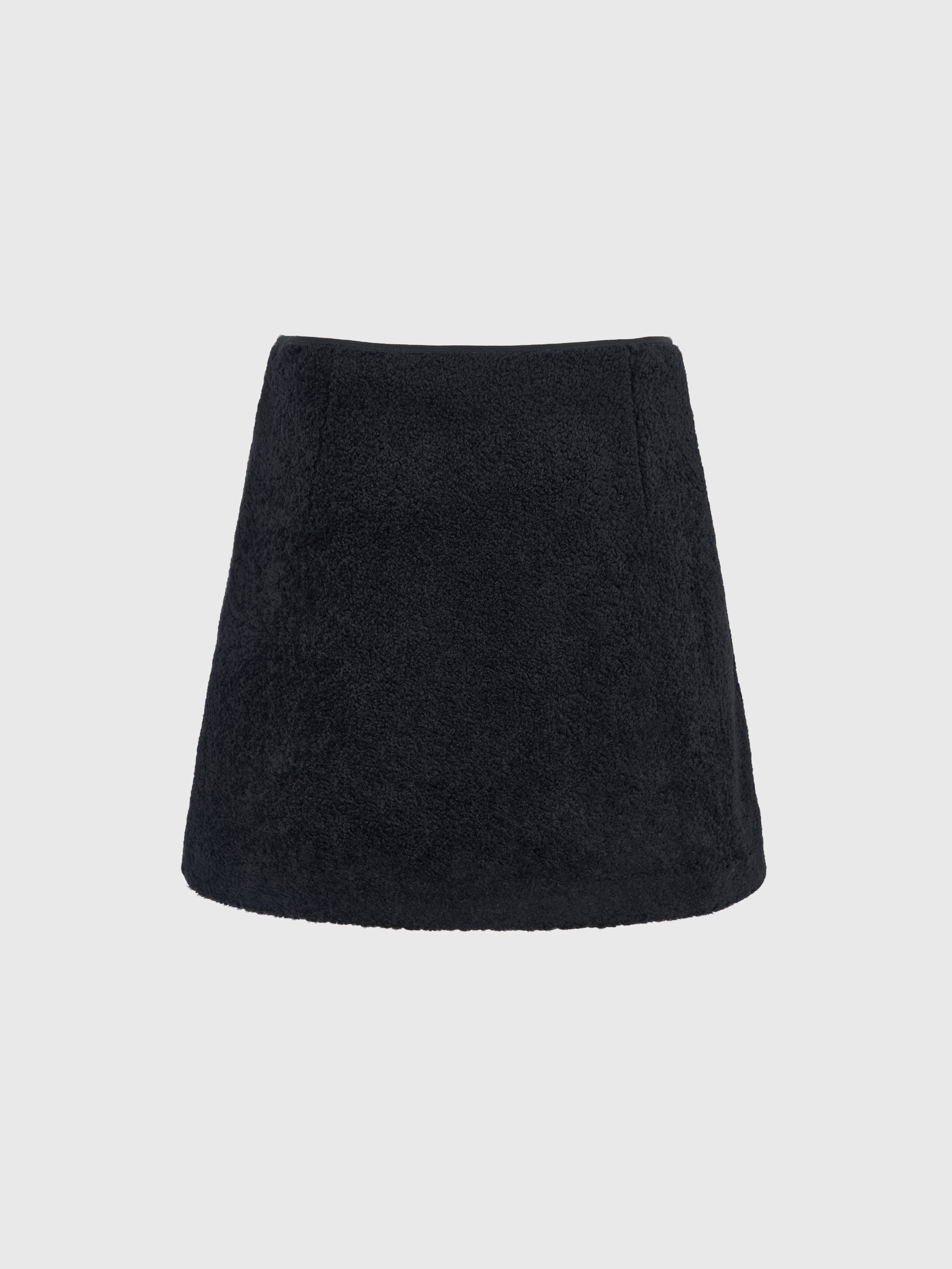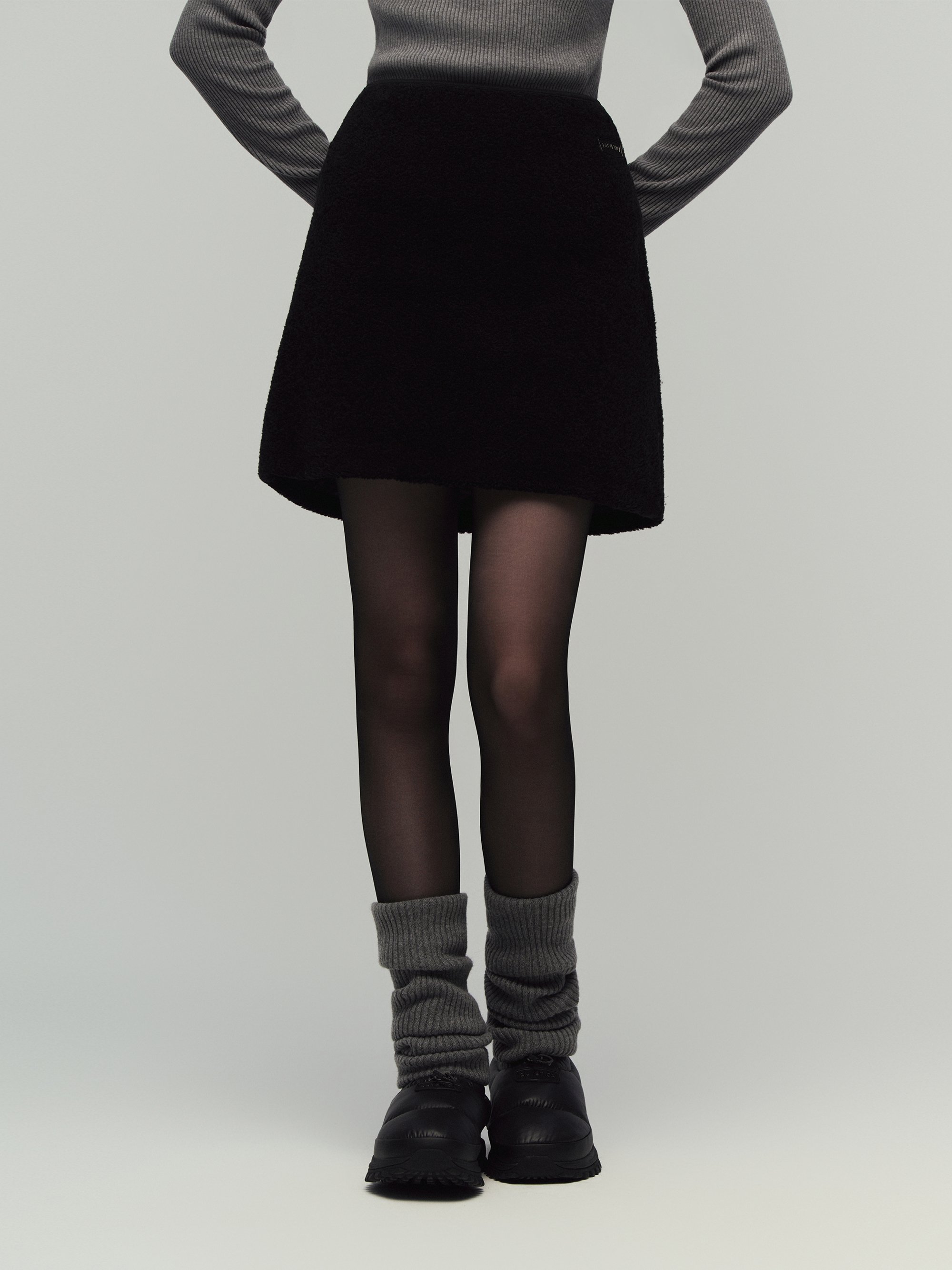 - FW 시즌에 어울리는 포근한 터치감의 부클 소재로 완성한 미니 스커트
