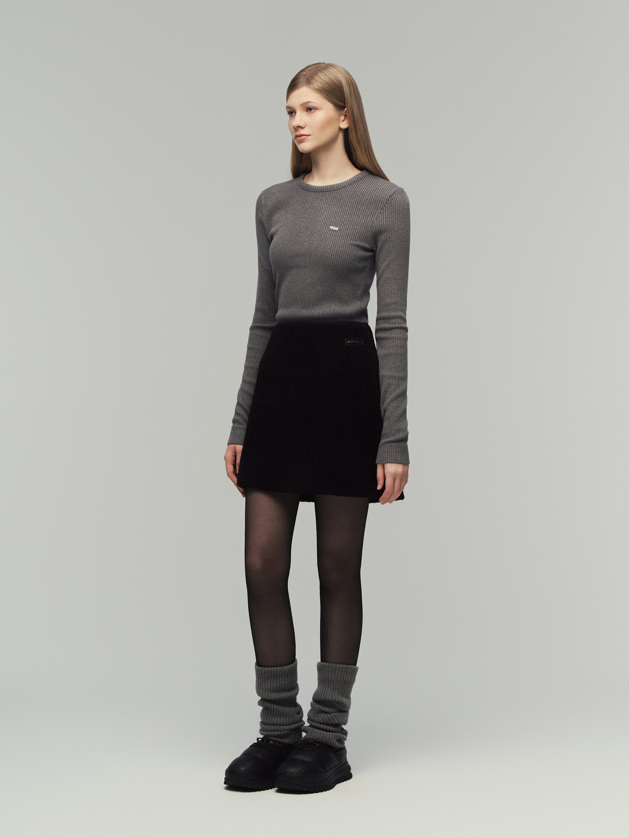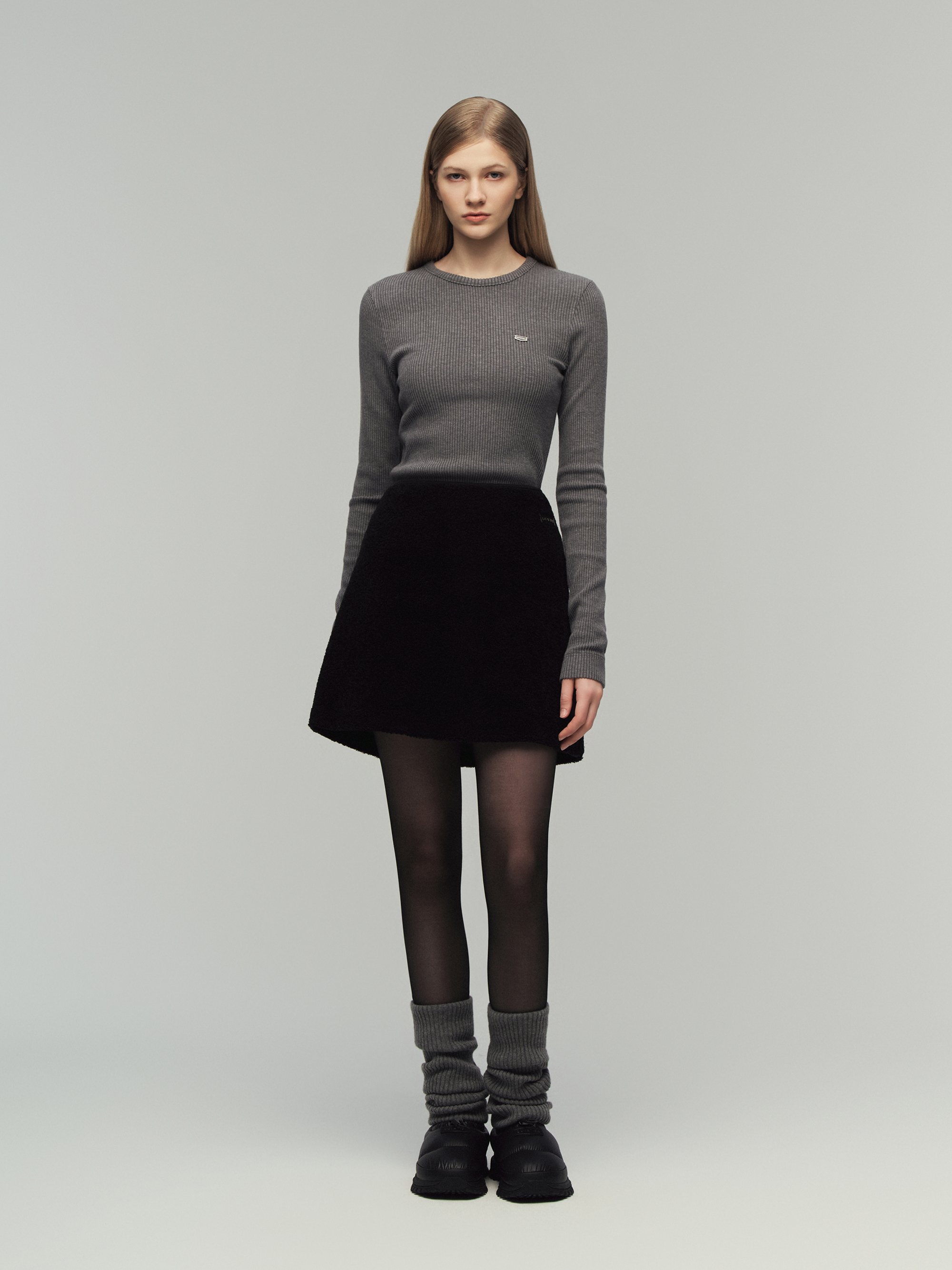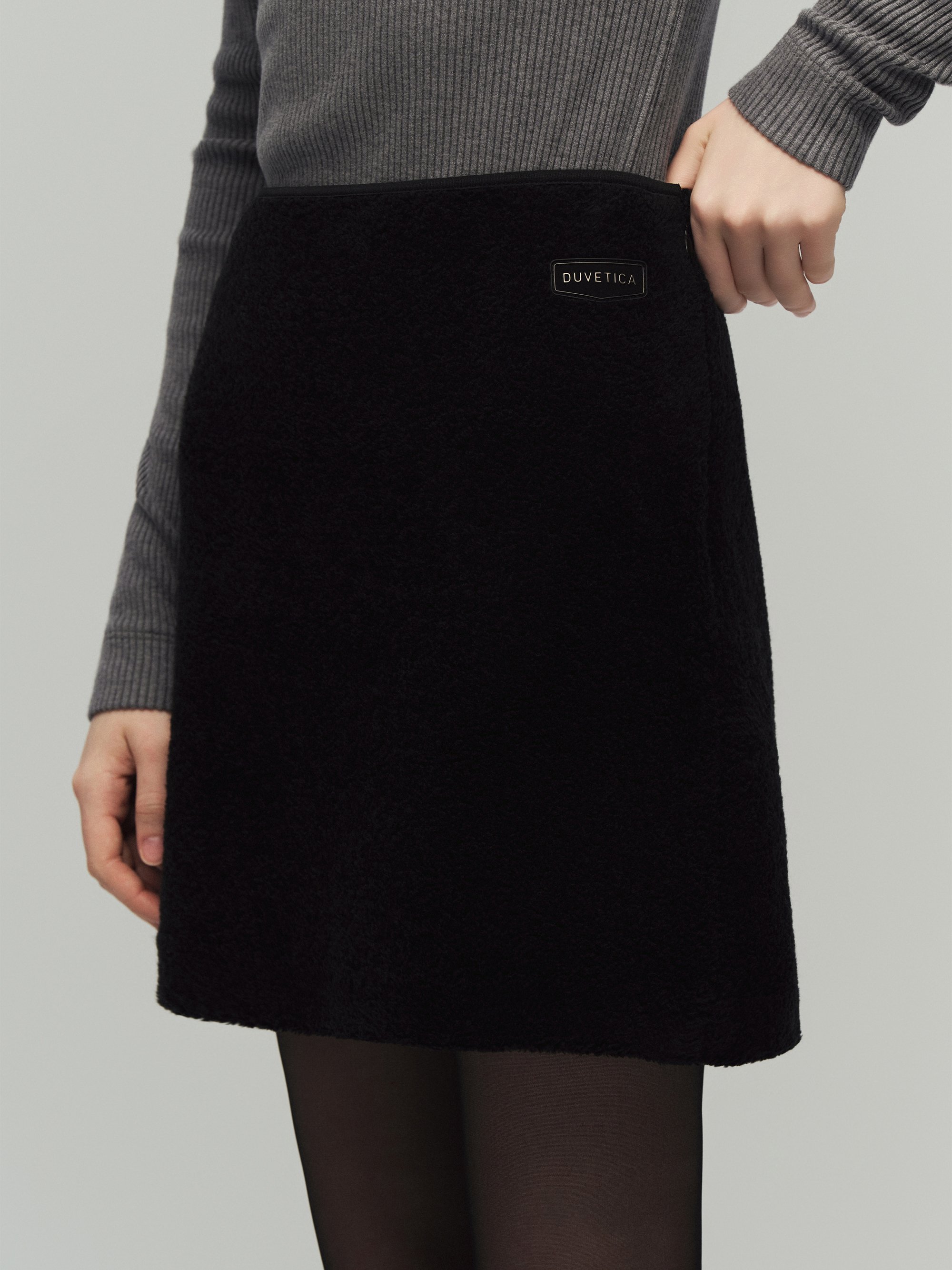 - FW 시즌에 어울리는 포근한 터치감의 부클 소재로 완성한 미니 스커트