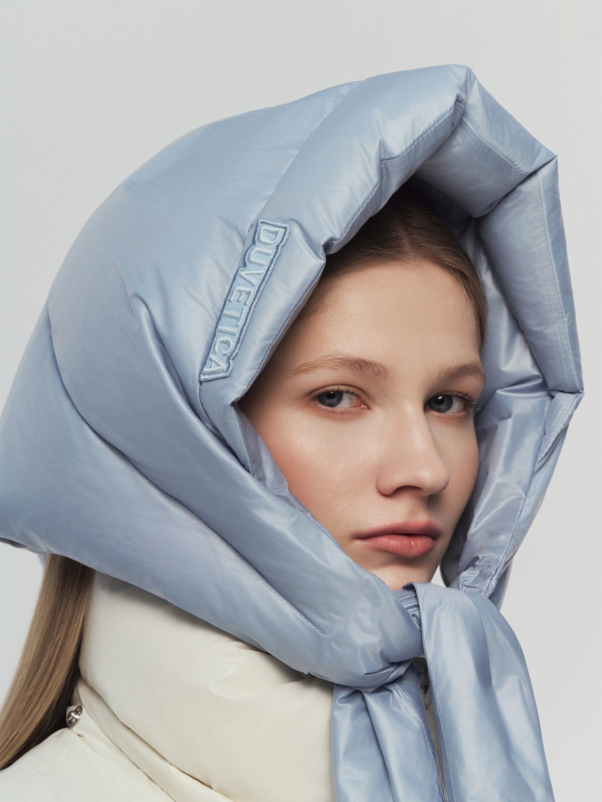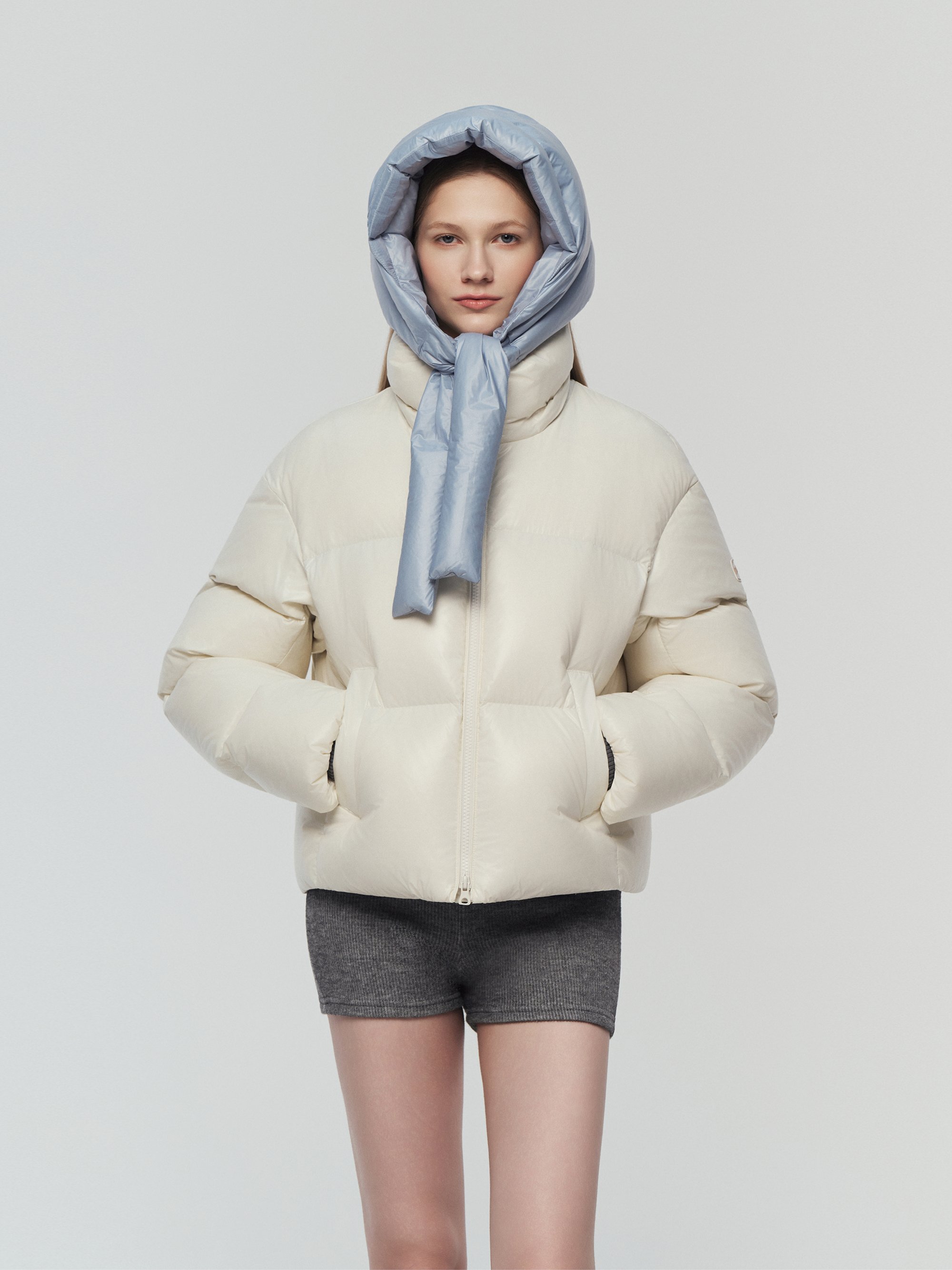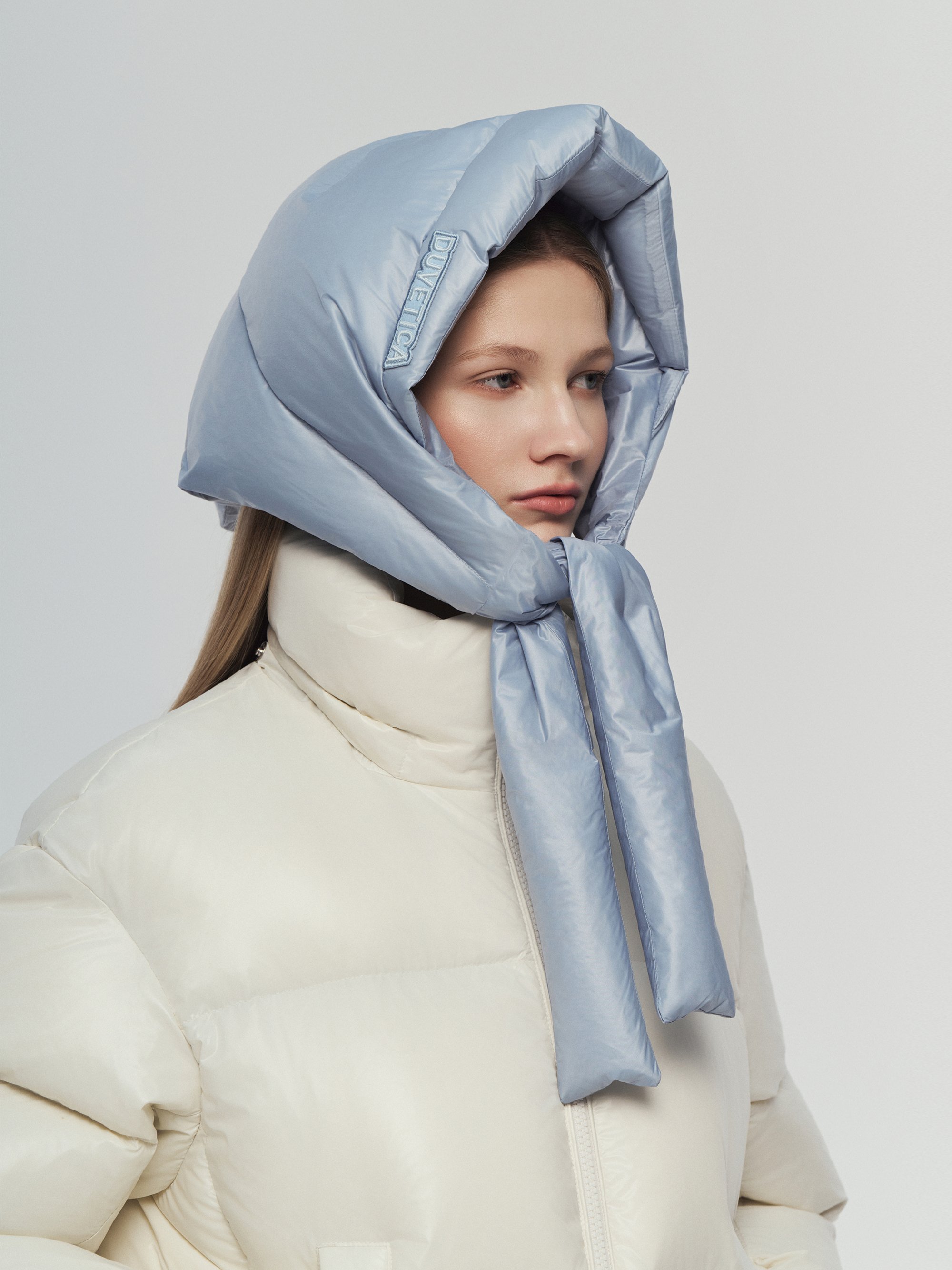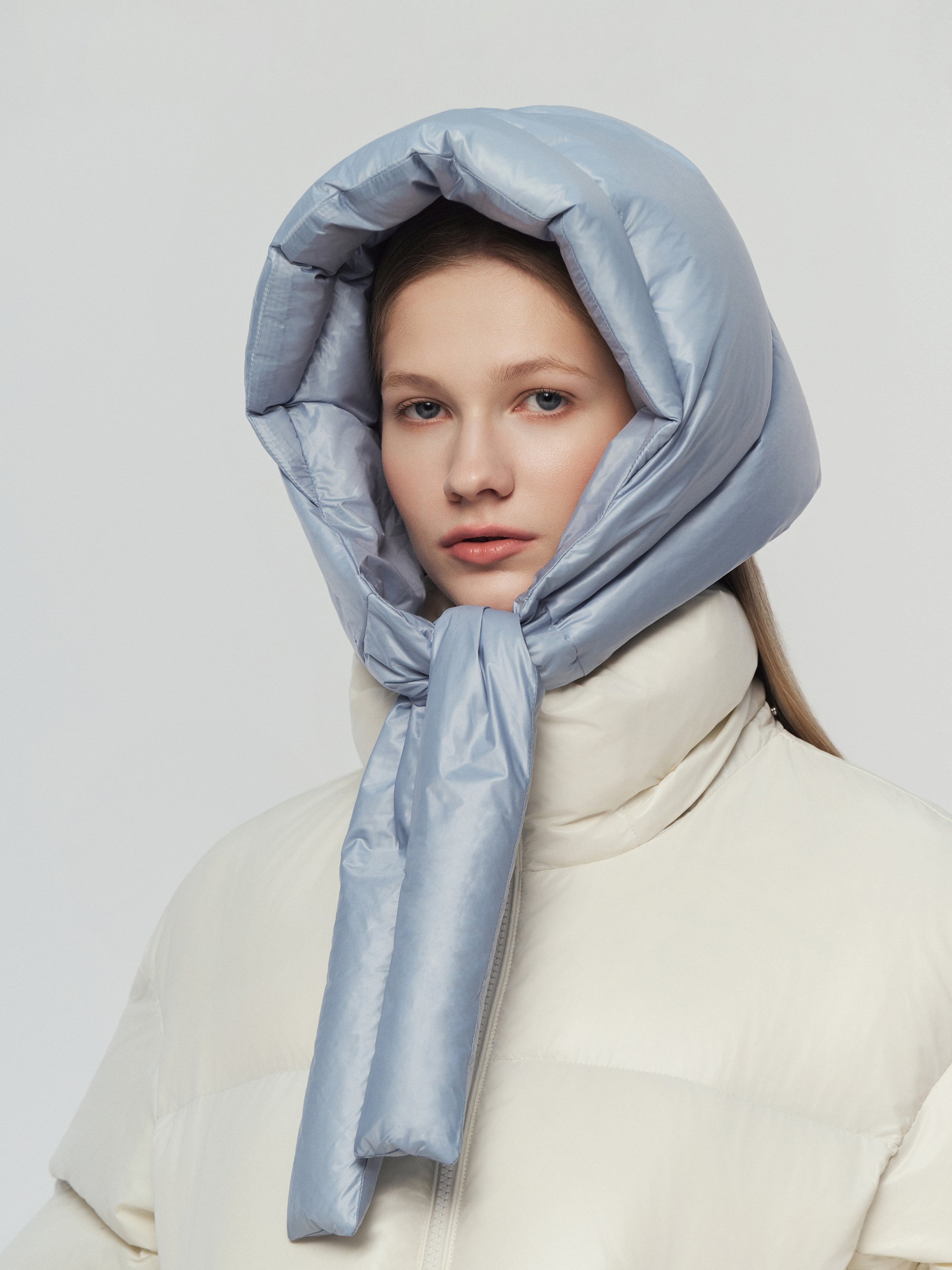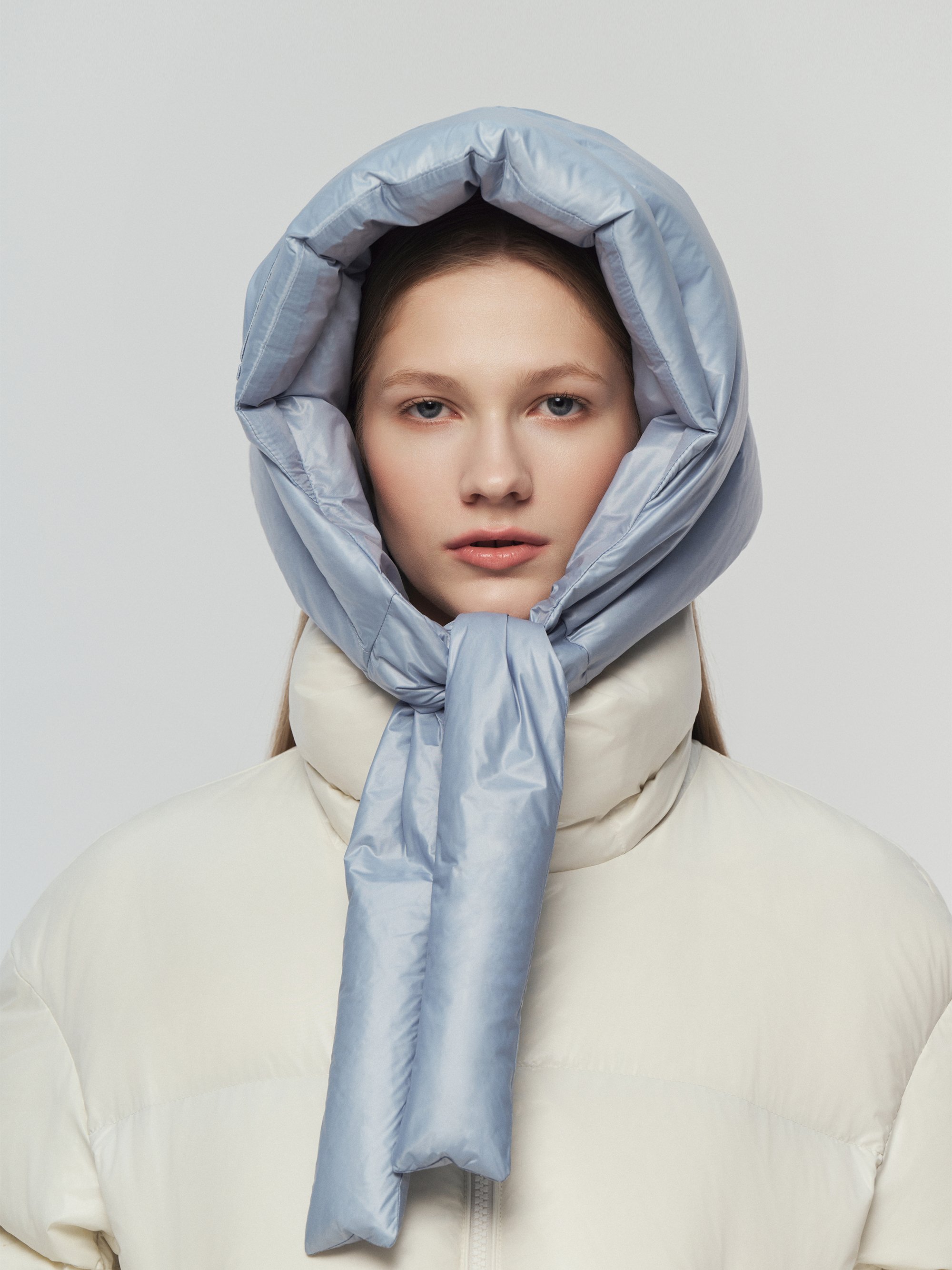 - 보온성 높은 다운으로 제작된 후디 스타일의 헤드스카프