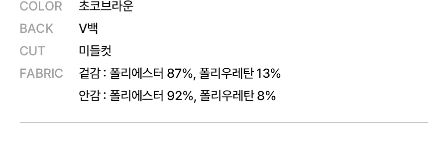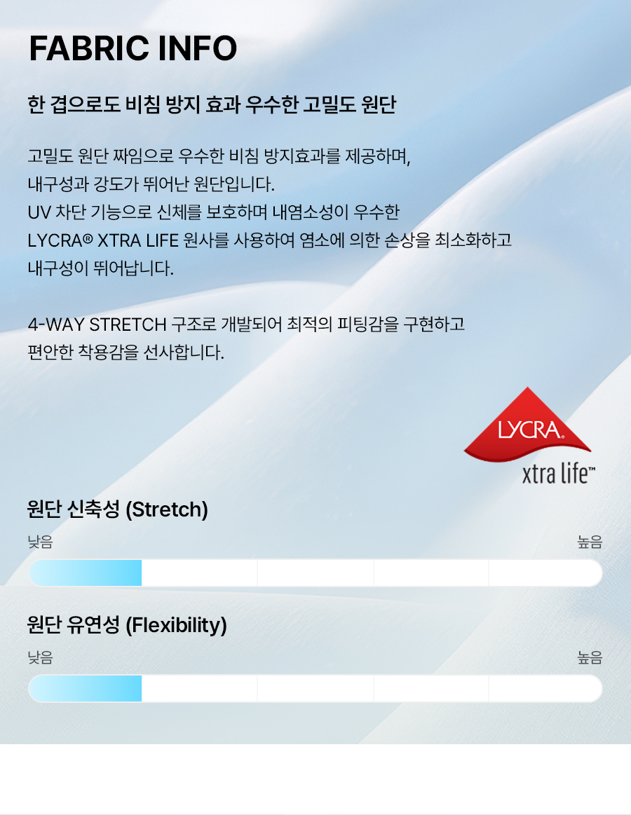 | 소재 | 겉감: 폴리에스터 87%, 폴리우레탄 13% / 안감: 폴리에스터 92%, 폴리우레탄 8% |