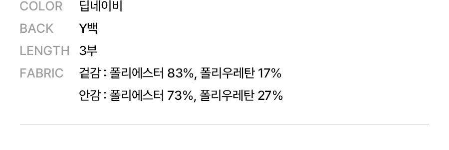 | 소재 | 겉감: 폴리에스터 83%, 폴리우레탄 17% / 안감: 폴리에스터 73%, 폴리우레탄 27% |