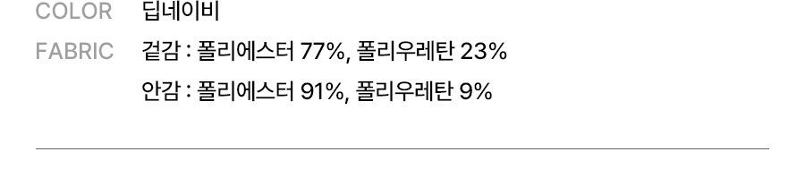 소재겉감: 폴리에스터 77%, 폴리우레탄 23% / 안감: 폴리에스터 91%, 폴리우레탄 9%