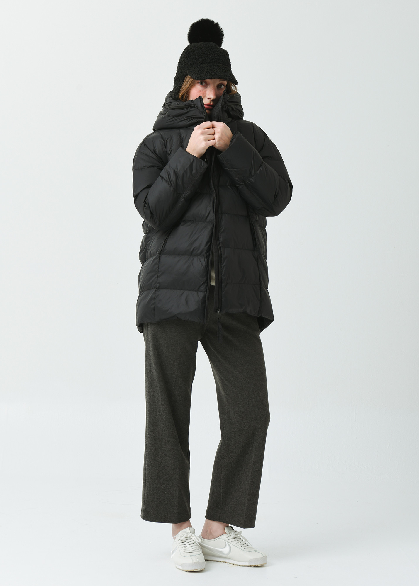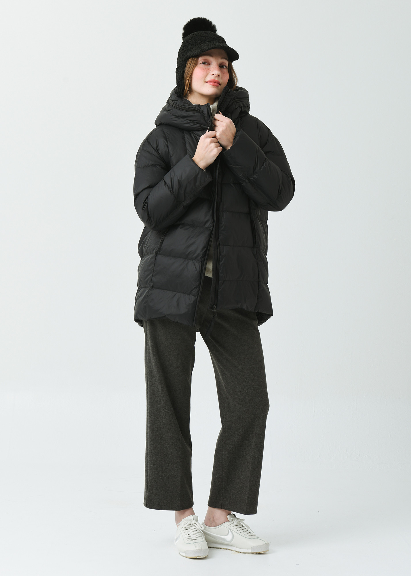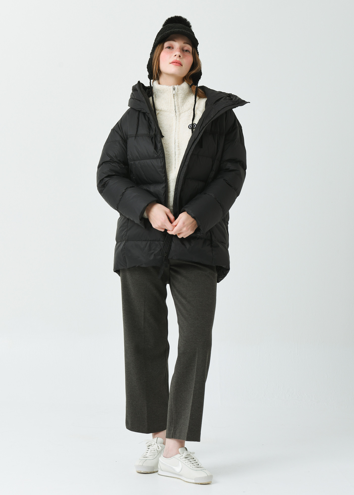 힙을 충분히 덮은 길인감과 여유감있는 사이즈의 일자형 실루엣으로 스포티한 감성의