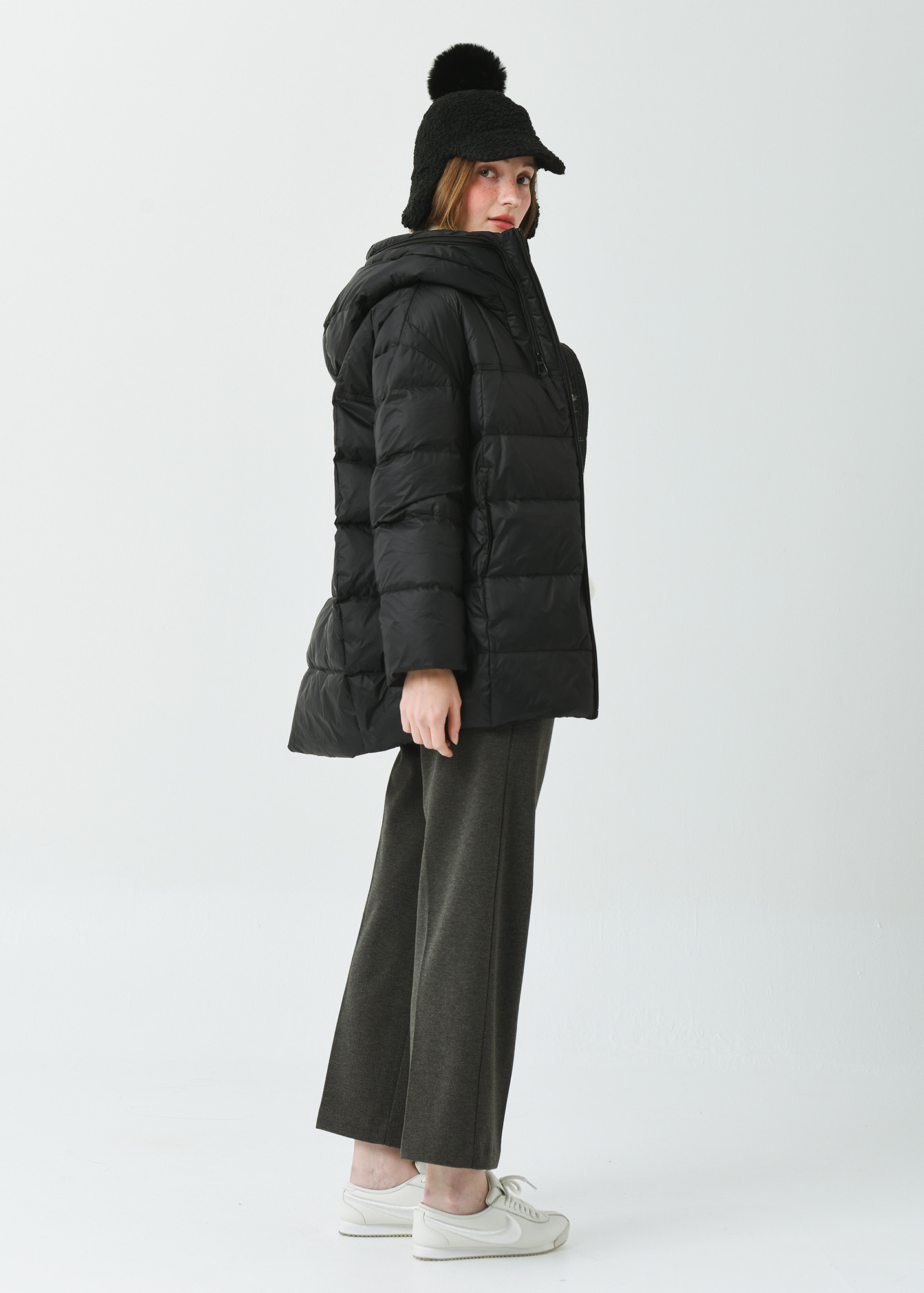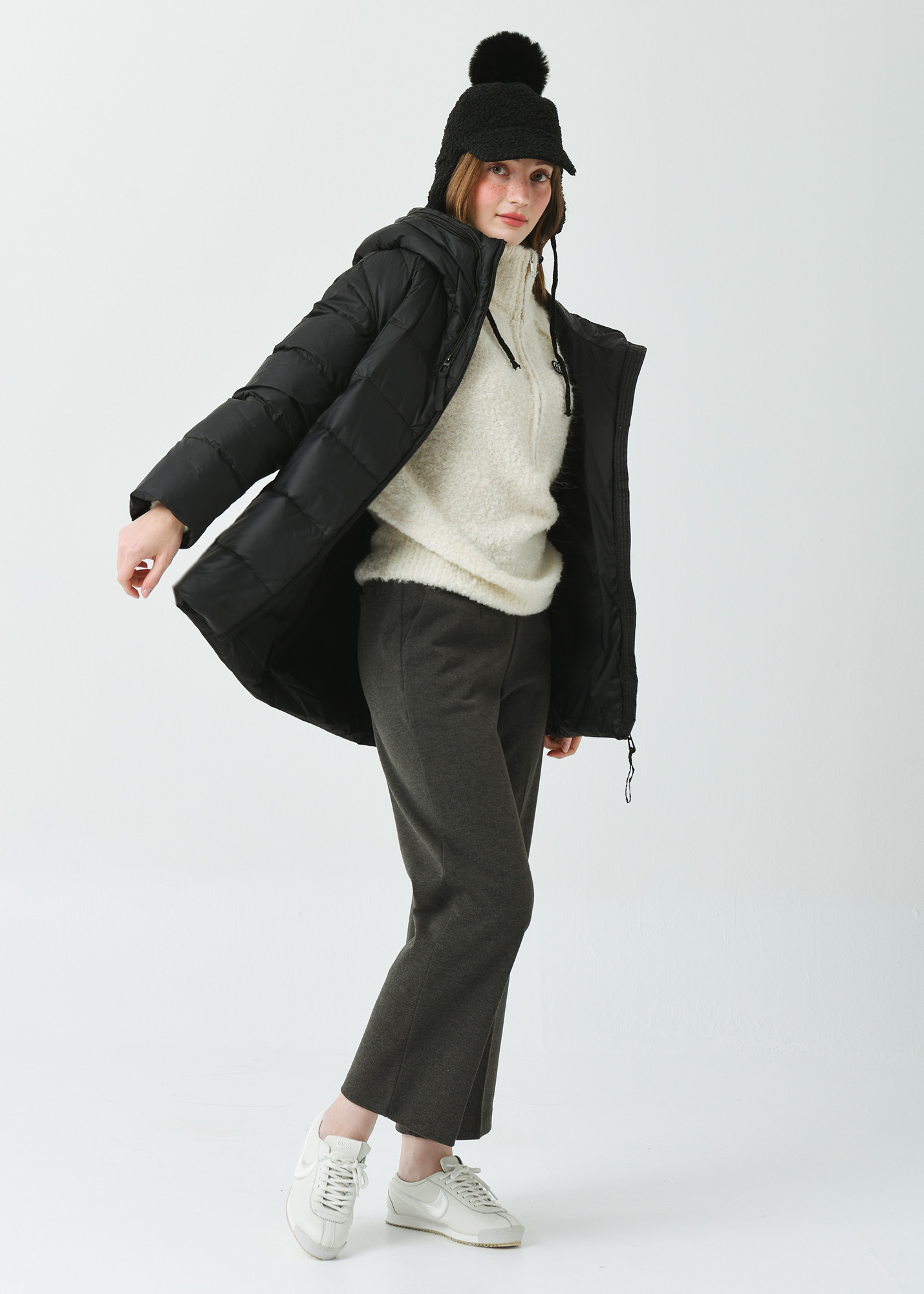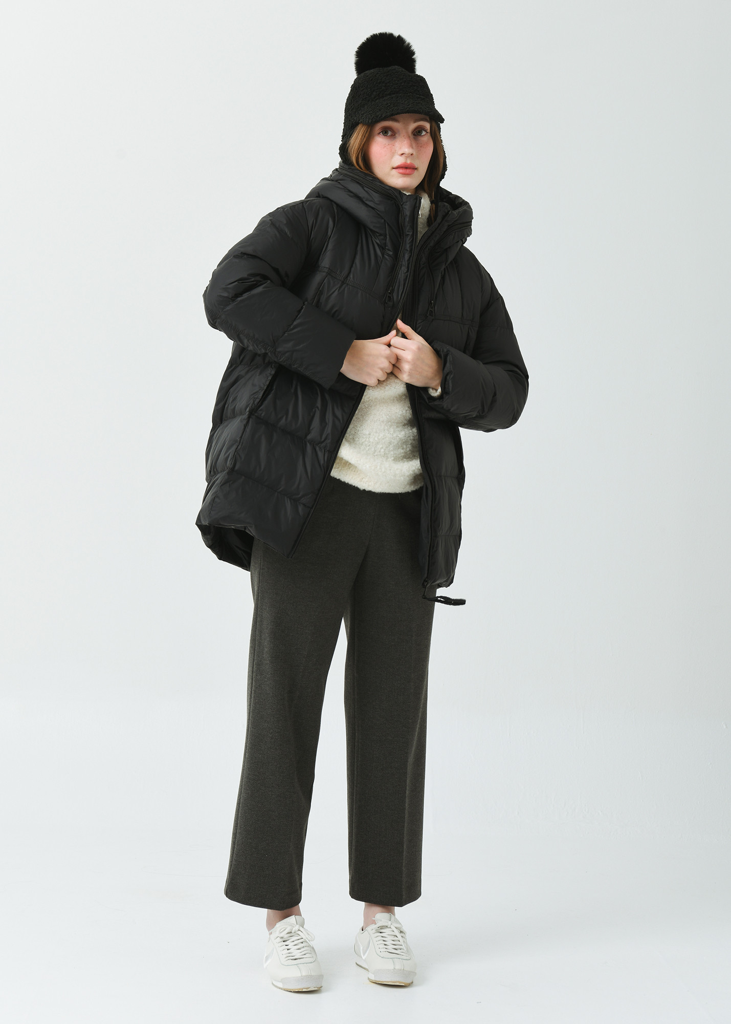 힙을 충분히 덮은 길인감과 여유감있는 사이즈의 일자형 실루엣으로 스포티한 감성의
